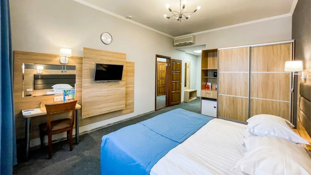 В номерах доступны категории от 1-местных до «Grand Люкс» с собственной сауной, есть индивидуальный санузел с душем, комплект гигиенических принадлежностей, халаты и тапочки. Оснащение включает телевизор, кондиционер, холодильник, рабочую поверхность, шкаф для хранения вещей, набор текстиля, фен и электрический чайник. В номерах предусмотрены светонепроницаемые шторы, точки электропитания, освещение для работы, система отопления и вентиляции.