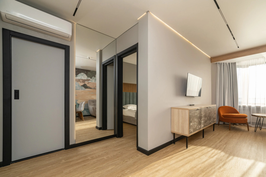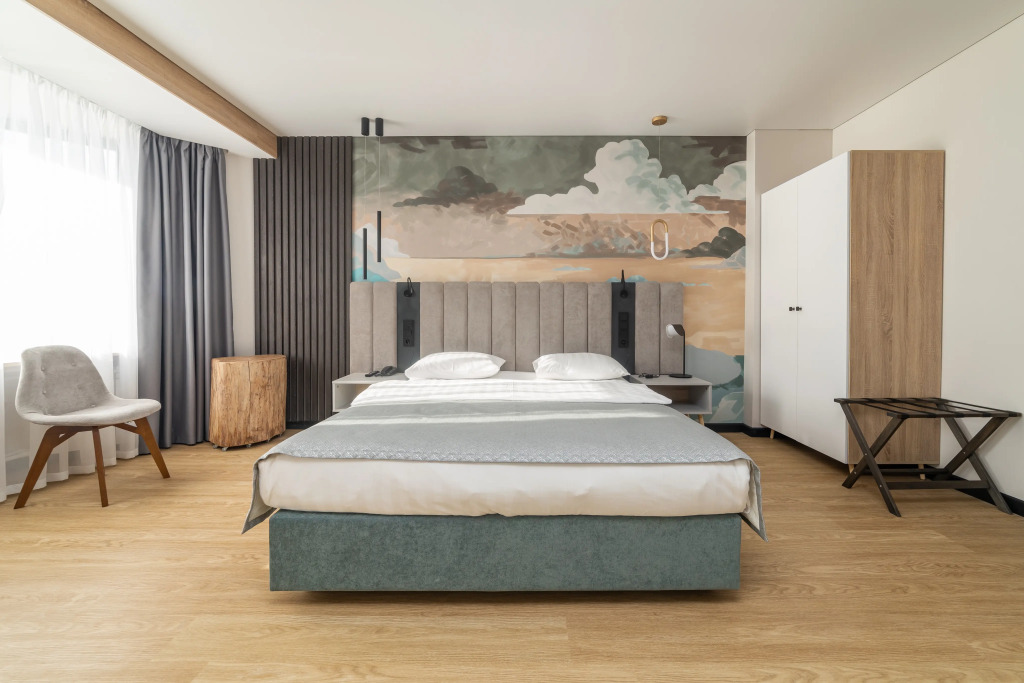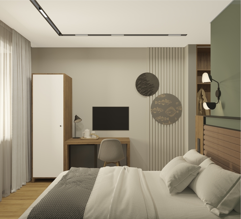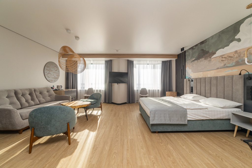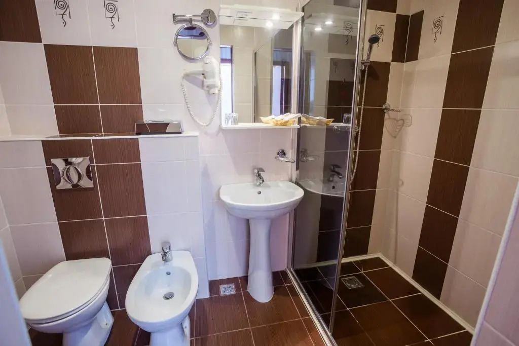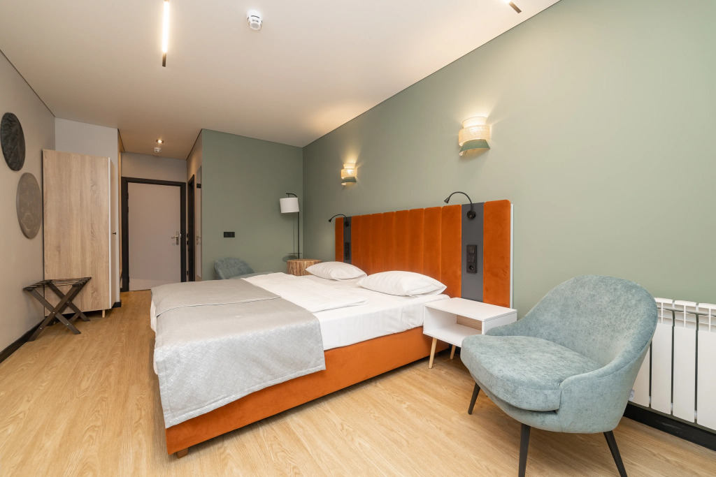 Номер уютно обставлен и оснащён необходимым, чтобы отдохнуть после долгого и насыщенного дня. Имеются телевизор и халат. Перечисленные услуги есть не во всех номерах.