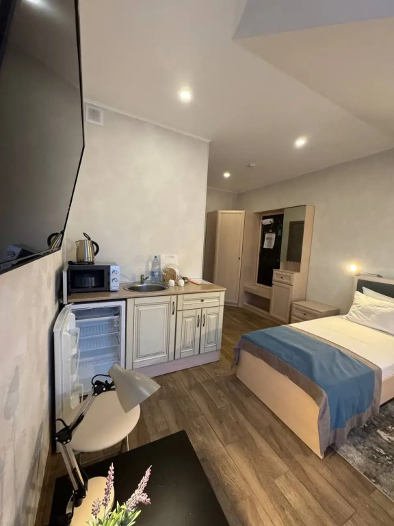 Гостям предоставляются номера с кроватями, телевизором, холодильником и чайником. В некоторых номерах есть дополнительные удобства: кондиционер, халаты и тапочки. Апартаменты оснащены мини-кухней.