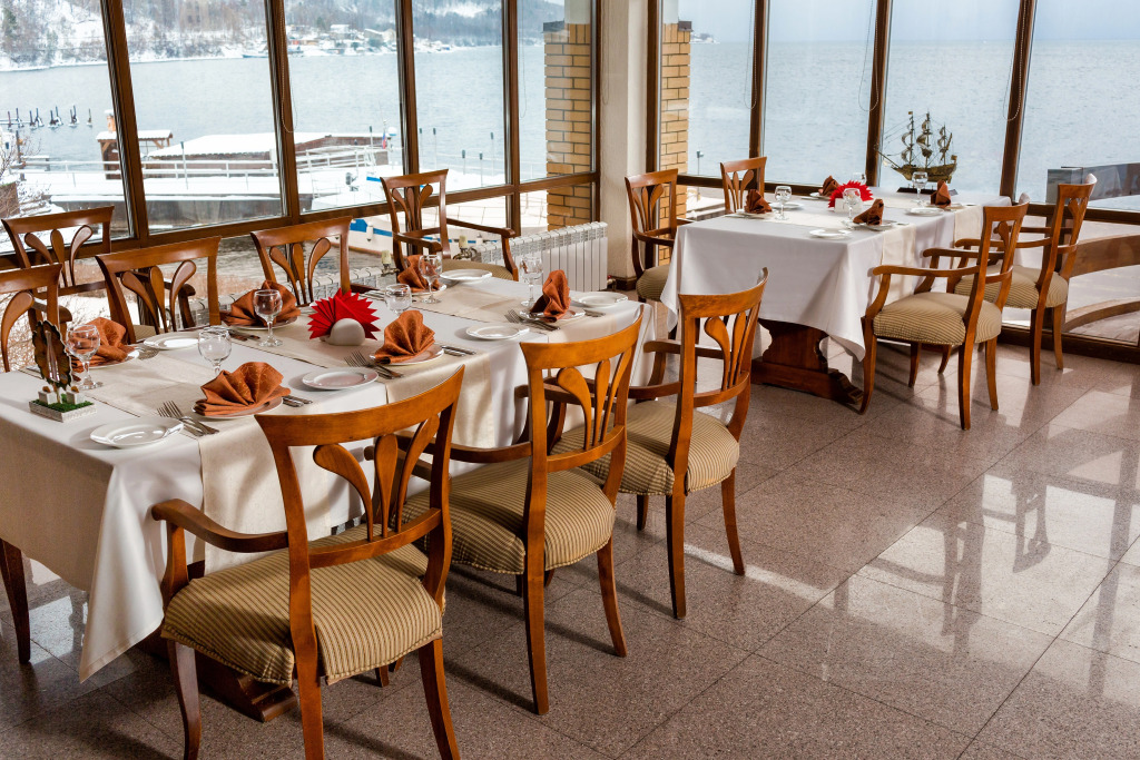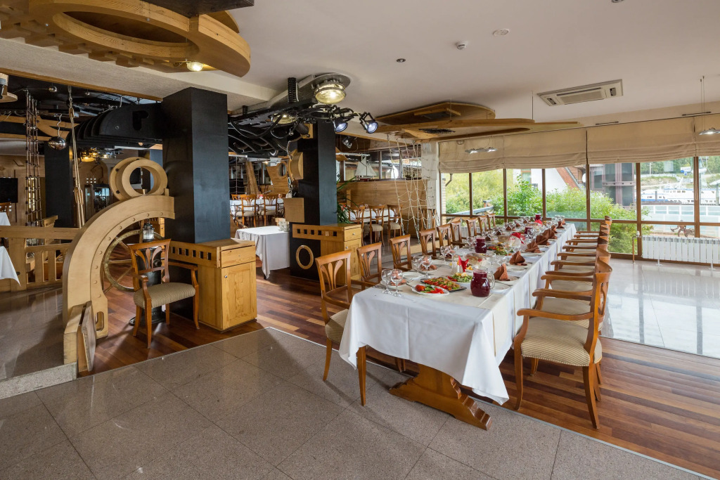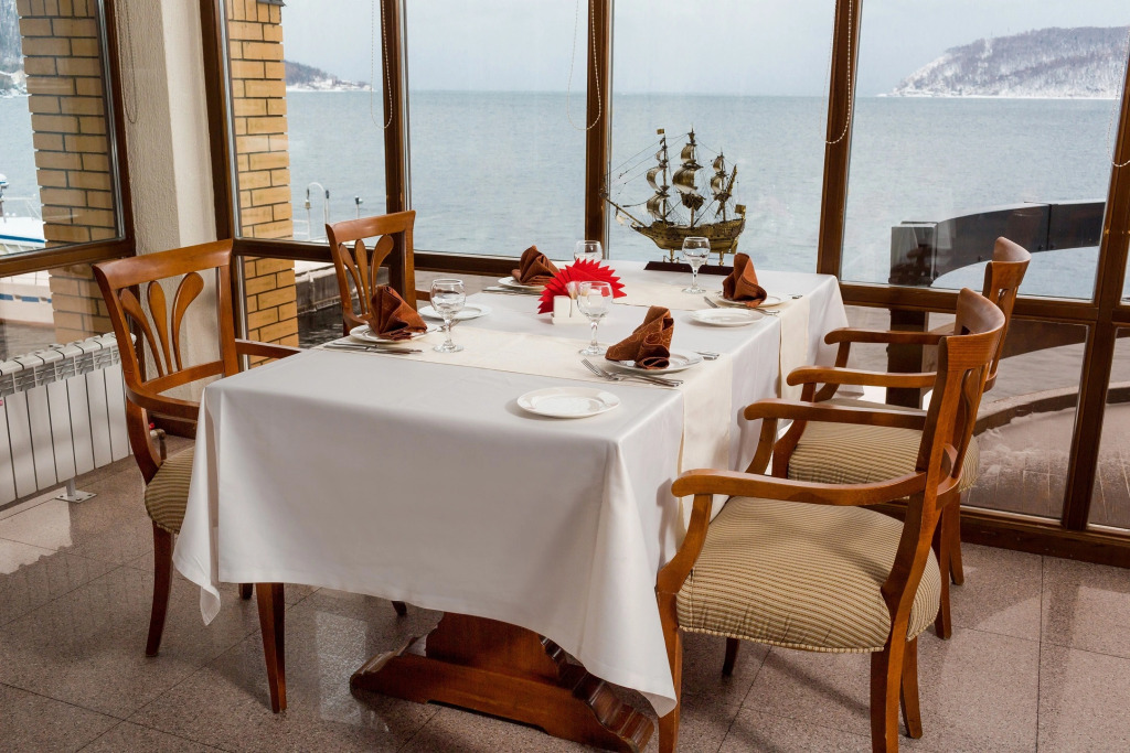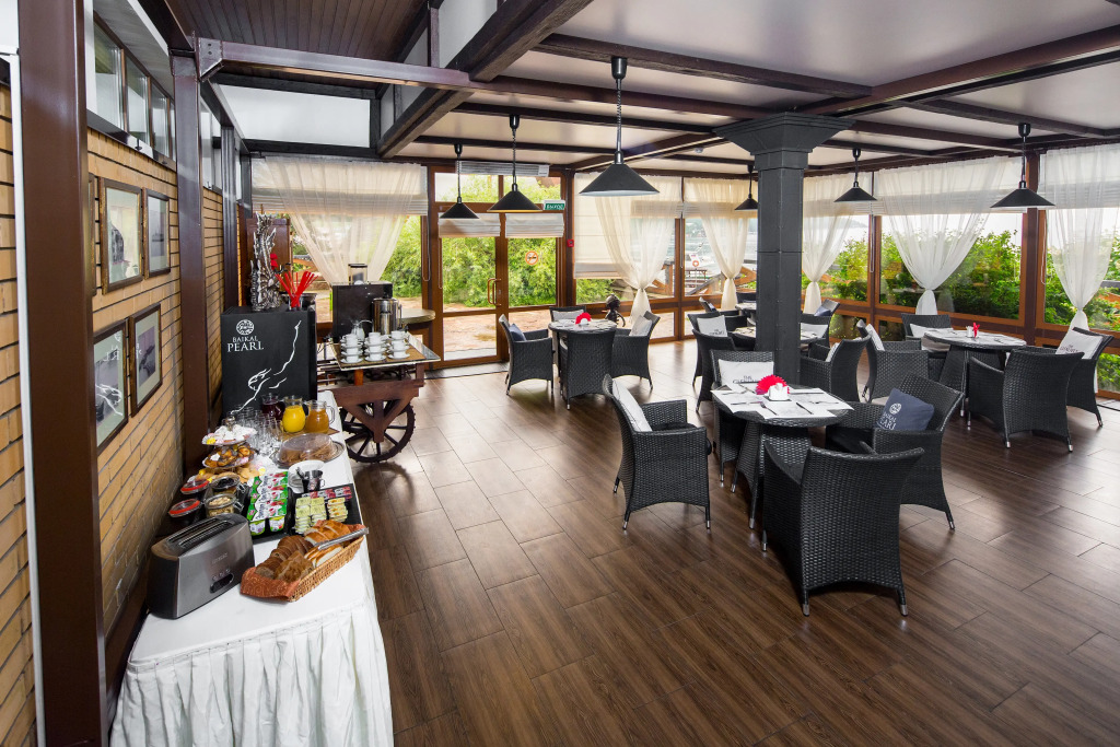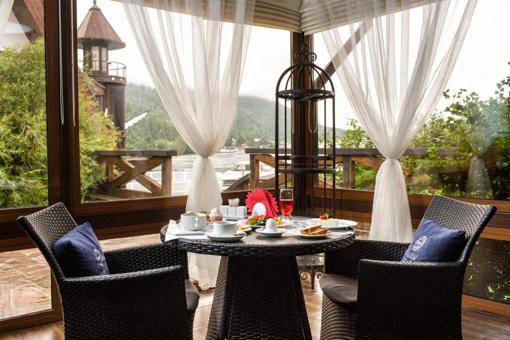 На территории гостиничного комплекса есть ресторан. Интерьер выполнен в морском стиле, рассчитан на 52 гостя и предлагает блюда традиционной русской и сибирской кухни. Завтрак можно забронировать дополнительно при заезде. Завтраки предоставляются в «формате континентальный завтрак» или «шведский стол» с 8:00 до 11:00. С мая по сентябрь завтраки сервируются в летней веранде с панорамными окнами.