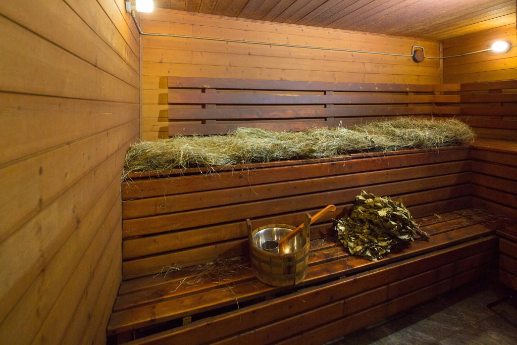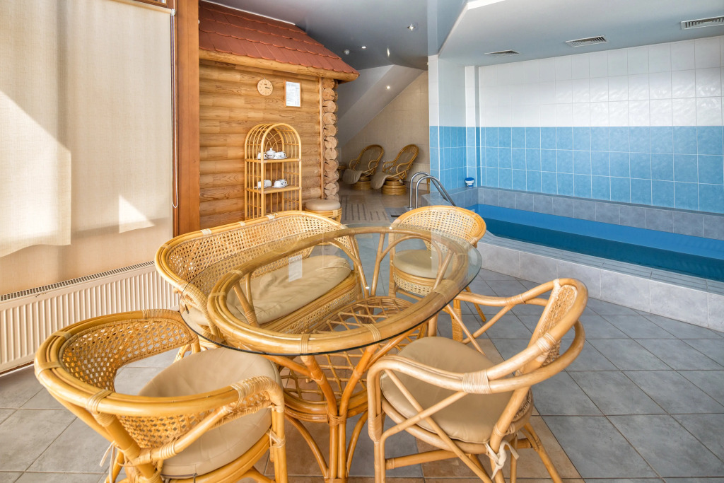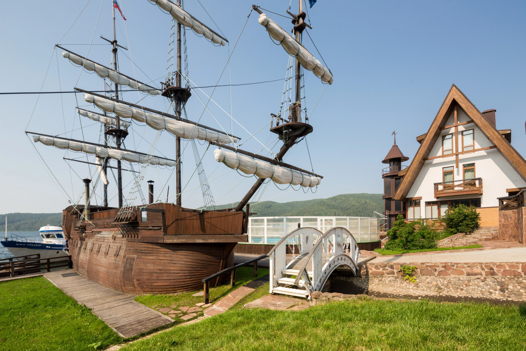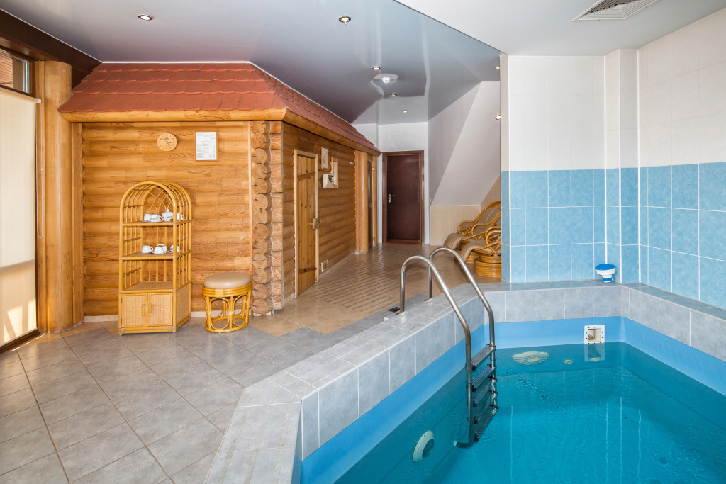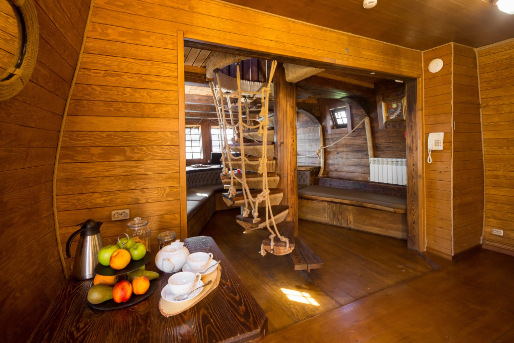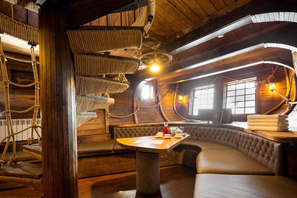 Также имеется баня, выполненная в стиле фрегата времён Петра 1. Территория отеля продолжает тему мореходства: на ней имеется деревянный фрегат, подводная лодка, корабельные пушки, маяк, якоря, рында.