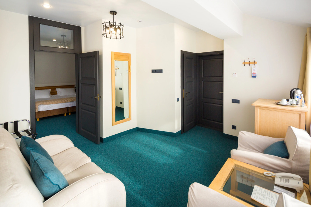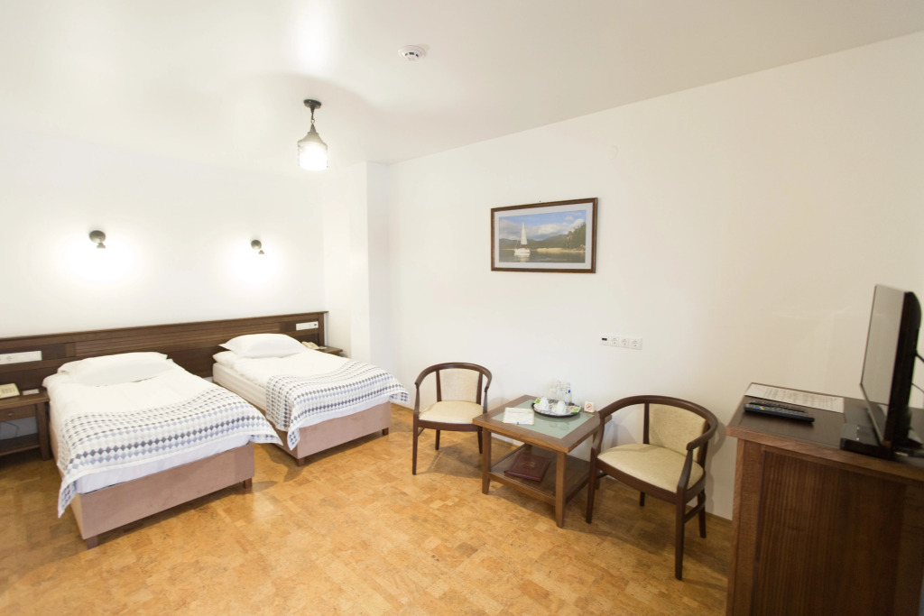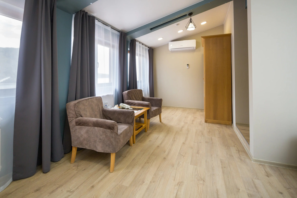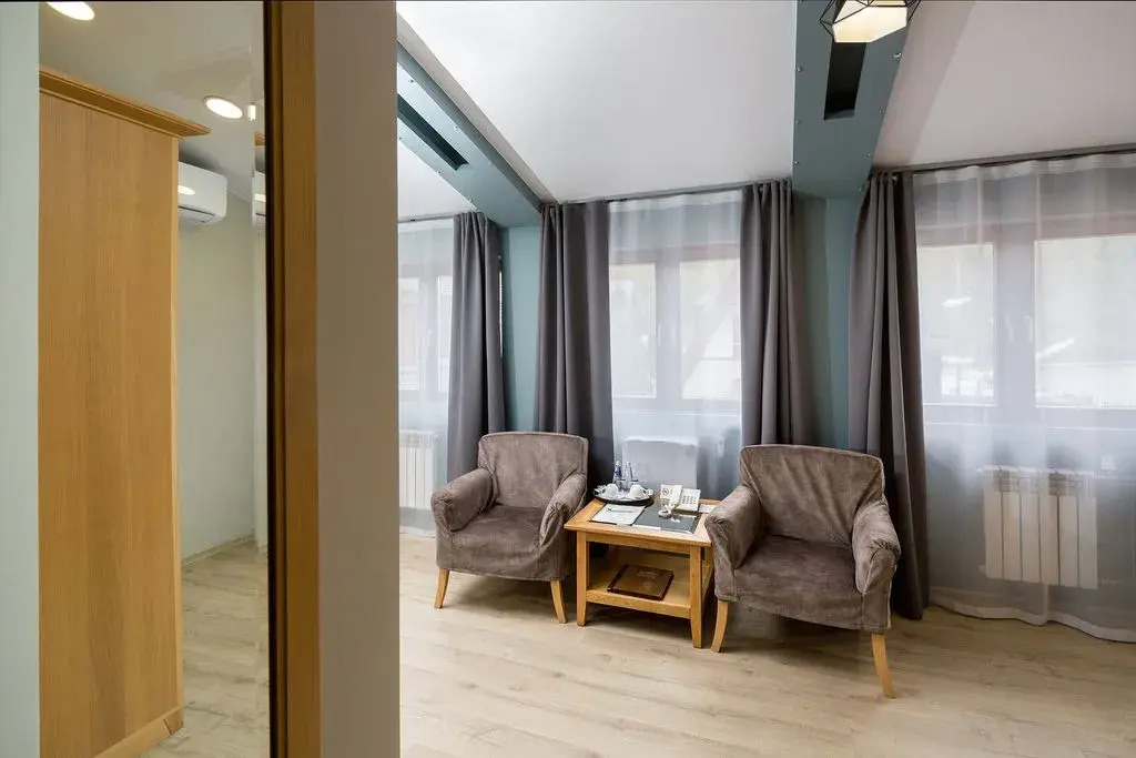 Гостиничный комплекс располагает 26 номерами, оборудованными итальянской мебелью из дуба, современной электронной техникой и другими необходимыми аксессуарами. Комплекс построен из натуральных экологически чистых материалов. В отделке преобладают ценные породы деревьев: дуб, ясень, кедр, сибирская сосна. Морская тема является основной в гостиничном интерьере.