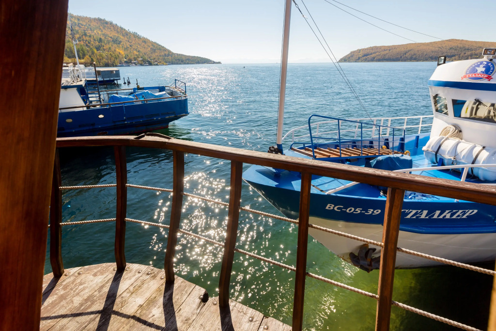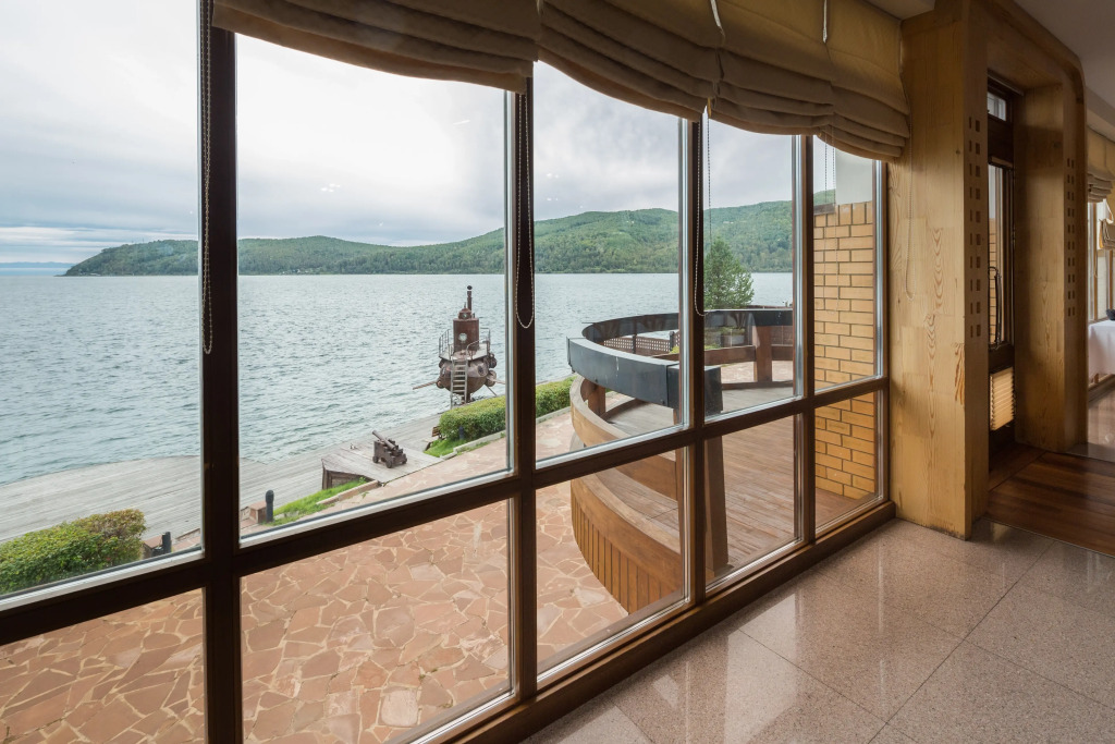 Из окон номеров открывается вид на озеро Байкал, исток Ангары, Шаман-камень, на вершины Хамар-Дабана.