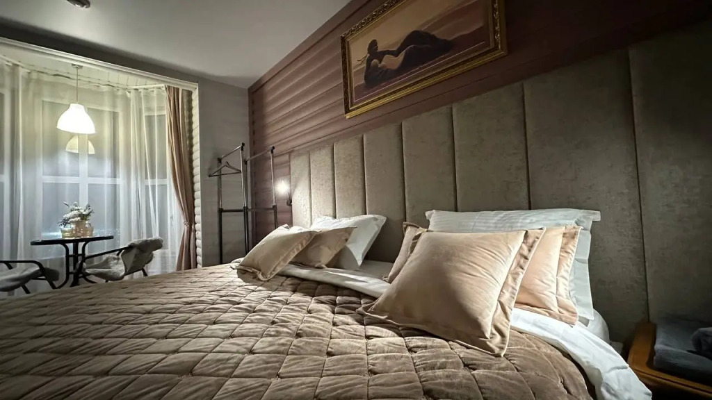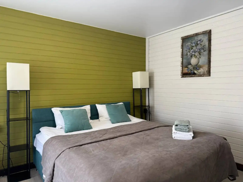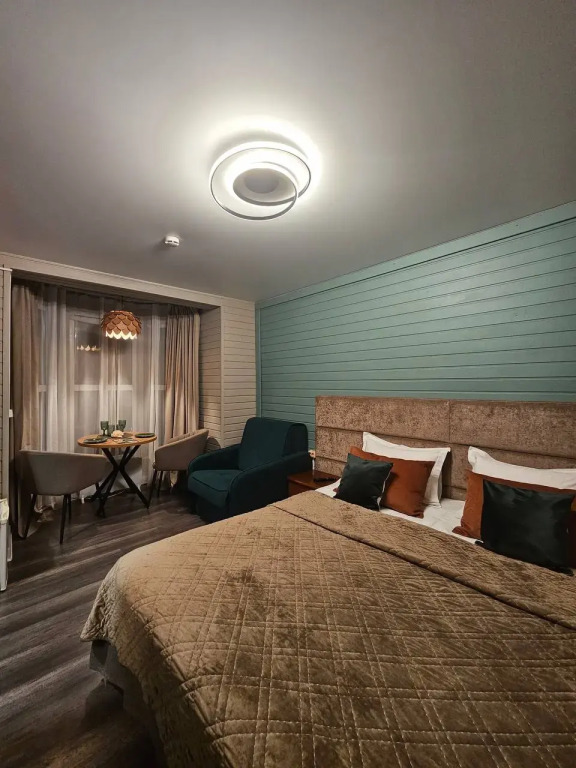 В оформлении номеров использованы натуральные материалы. Каждый номер оснащён панорамными окнами с видом на реку или сад.