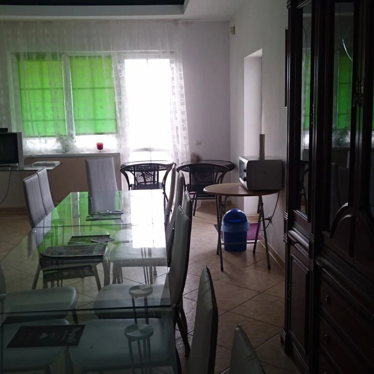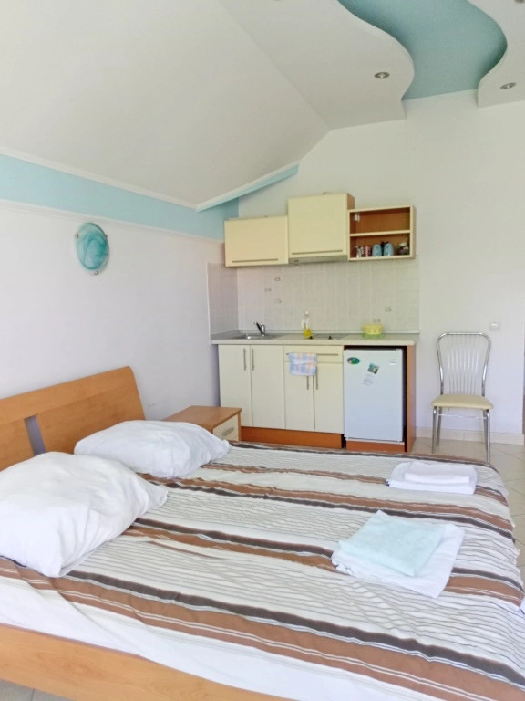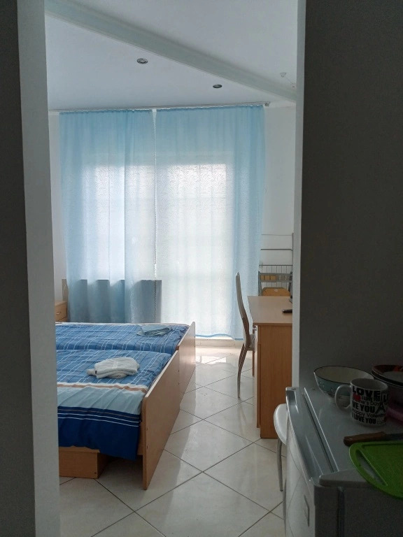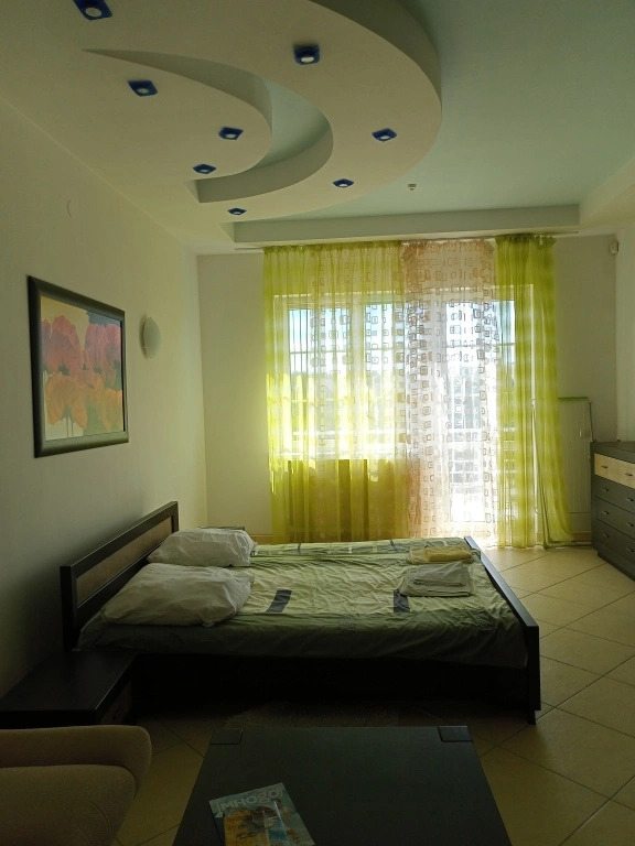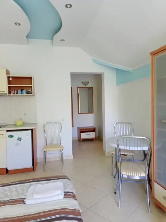 С балкона открывается вид на двор. В апартаментах предусмотрена кухня с посудой, холодильник, плита, чайник и кулер с водой. Ванная комната оснащена душевой кабиной и туалетом.