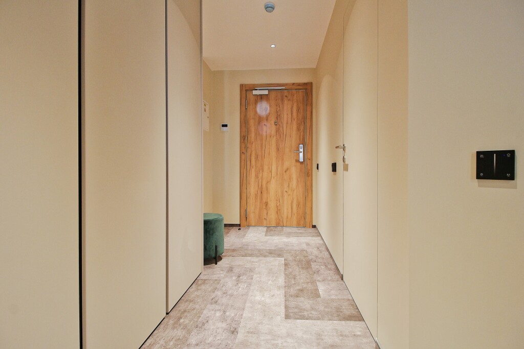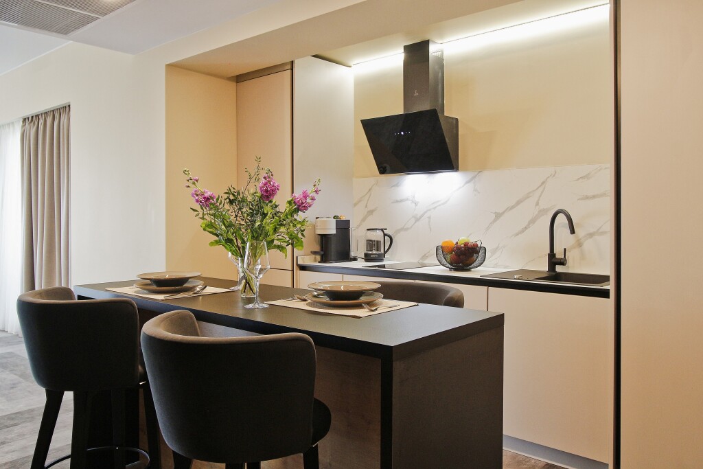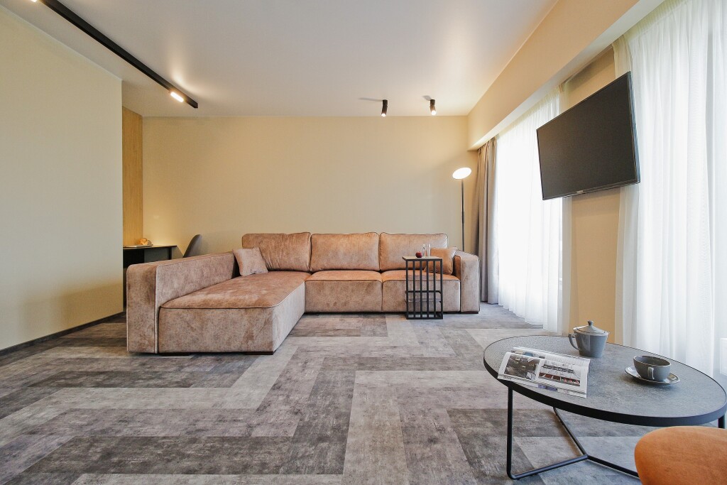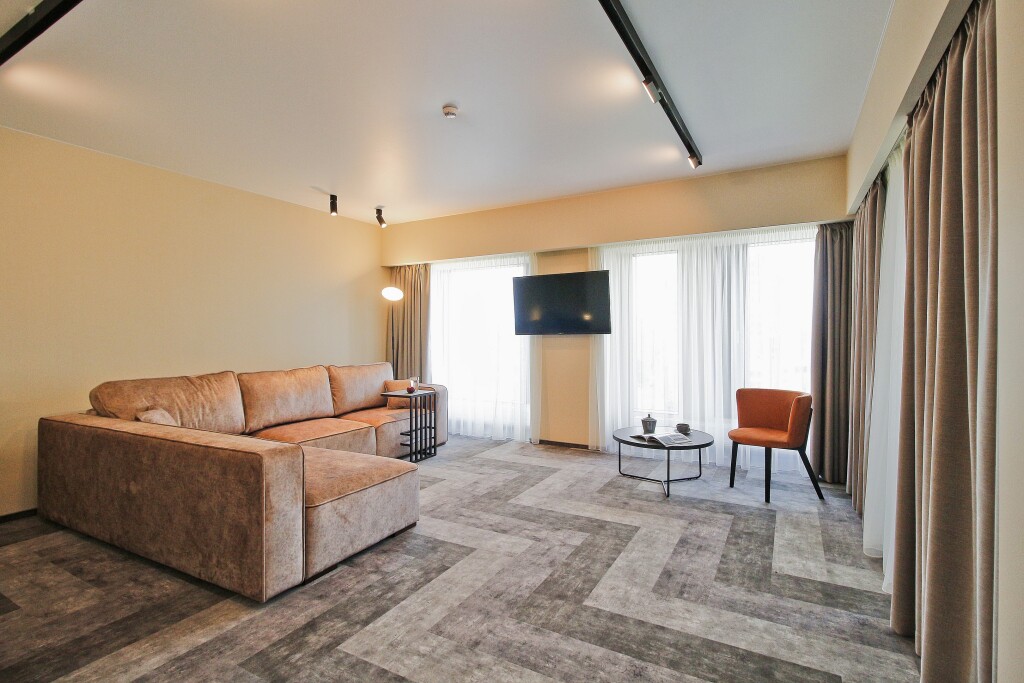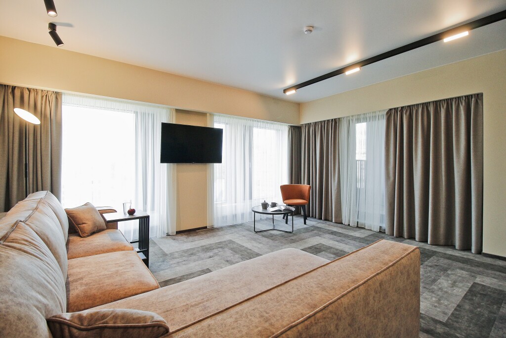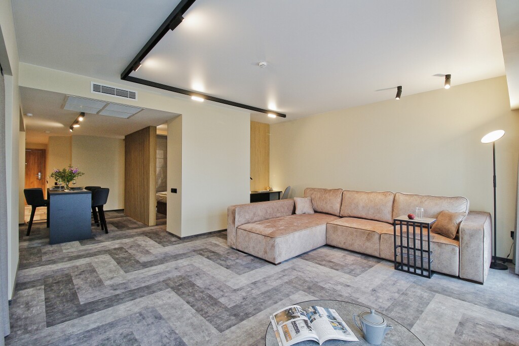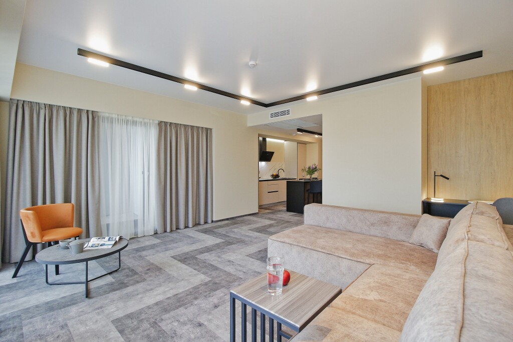 Апарт-отель имеет спокойный минималистичный интерьер в тёплой песчаной гамме. Натуральный дизайн и мягкие приглушённые тона сочетают стиль и комфорт.