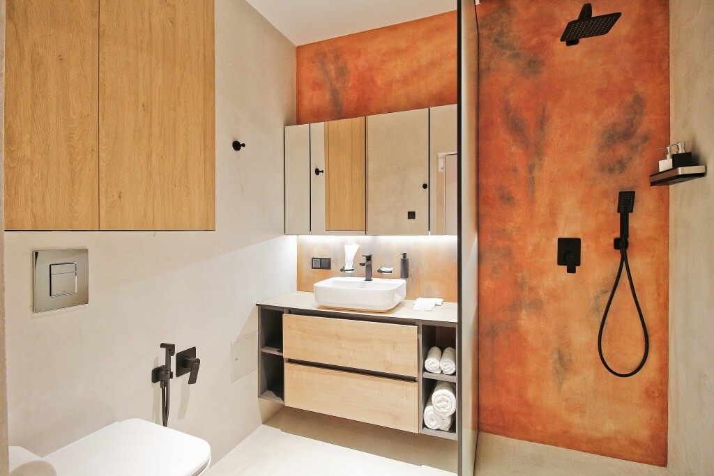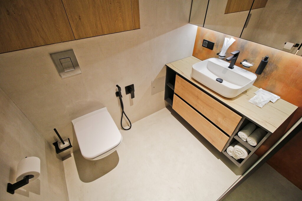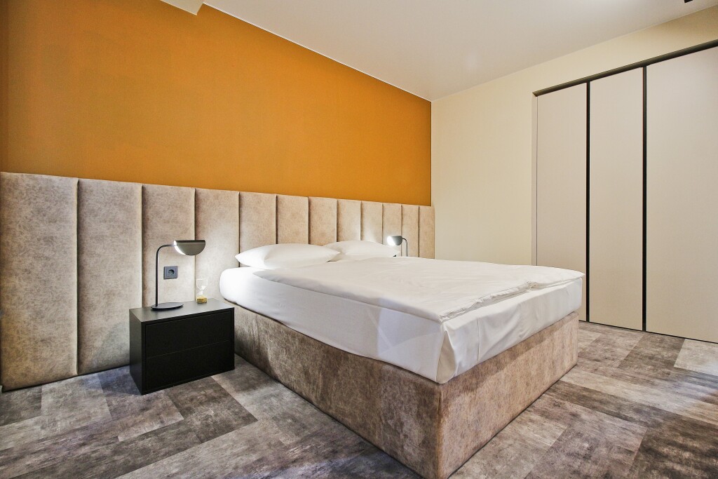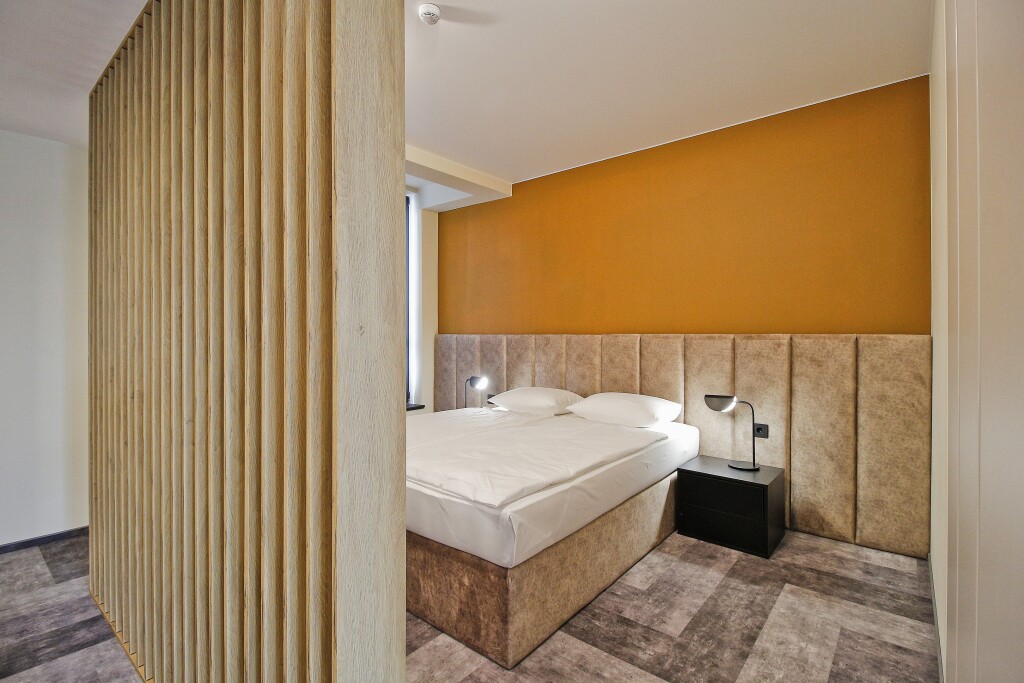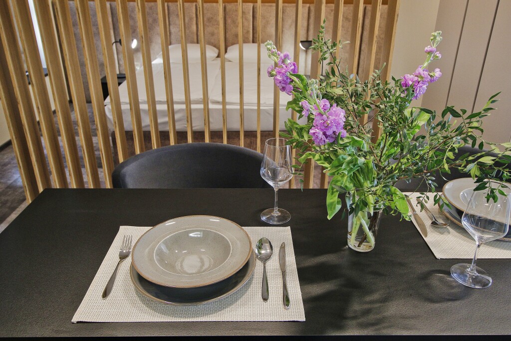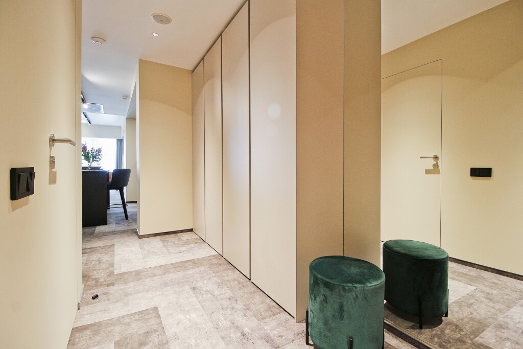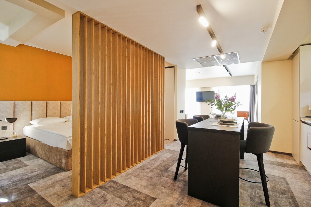 Апарт-отель имеет спокойный минималистичный интерьер в тёплой песчаной гамме. Натуральный дизайн и мягкие приглушённые тона сочетают стиль и комфорт.