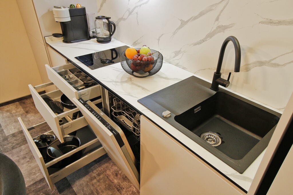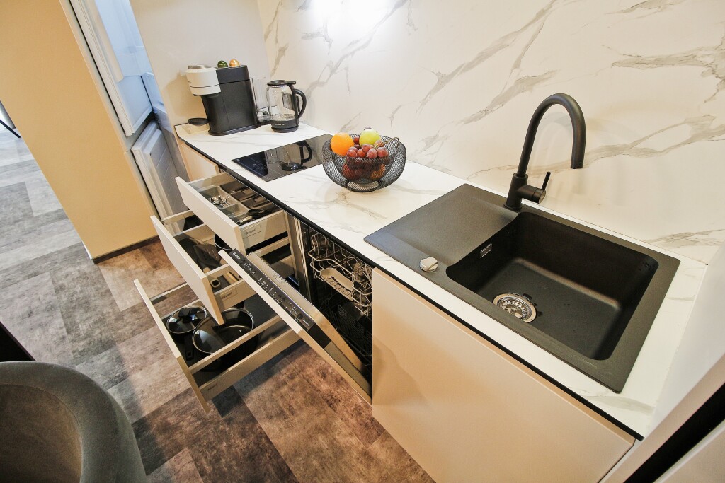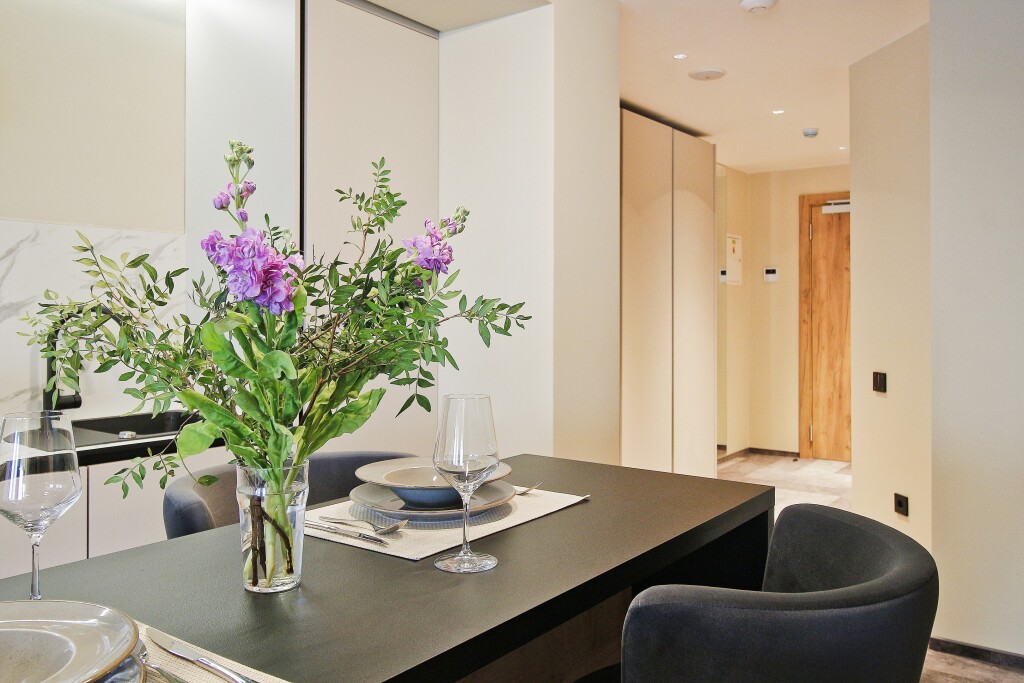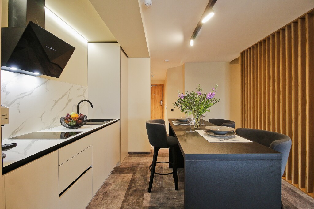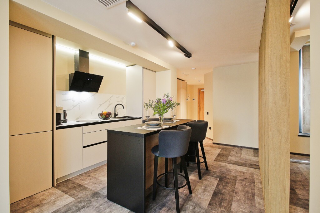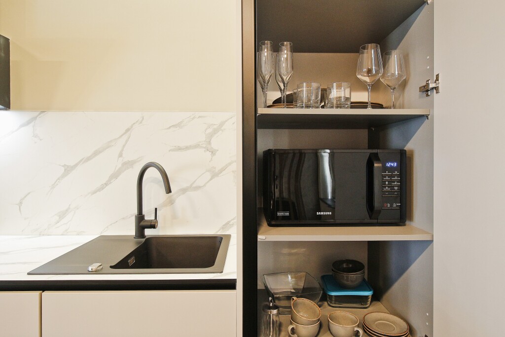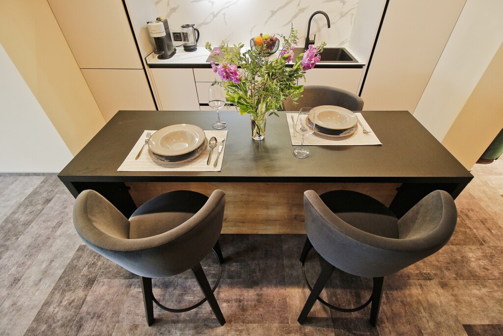 Апарт-отель имеет спокойный минималистичный интерьер в тёплой песчаной гамме. Натуральный дизайн и мягкие приглушённые тона сочетают стиль и комфорт.