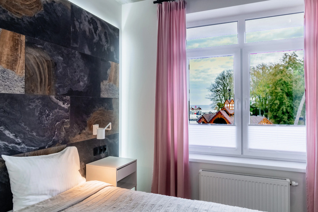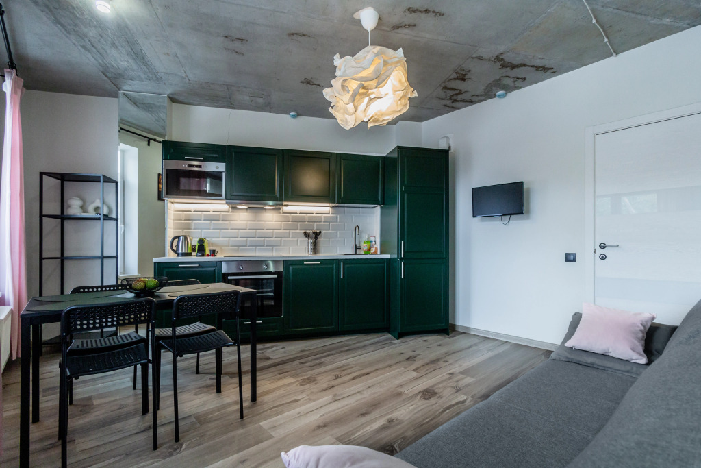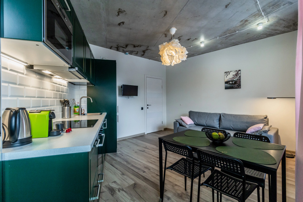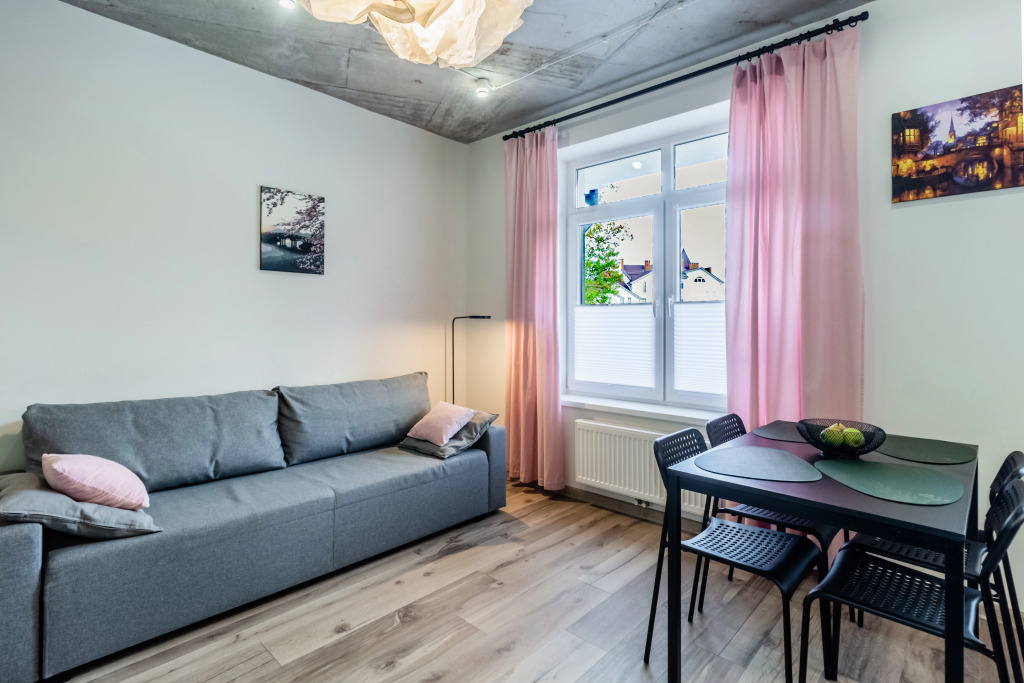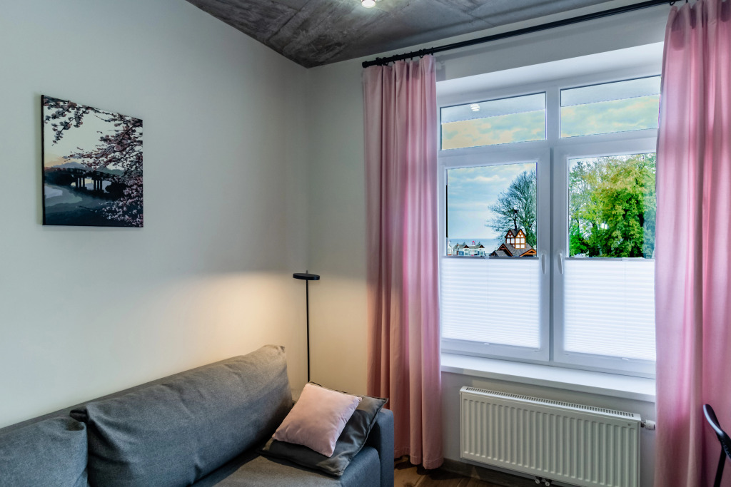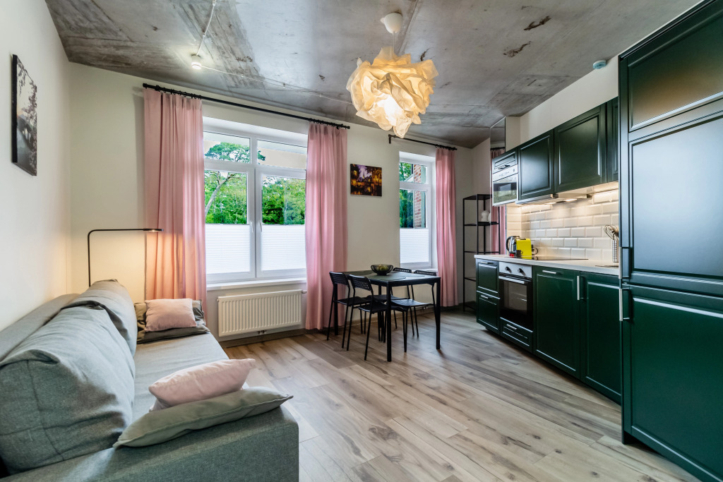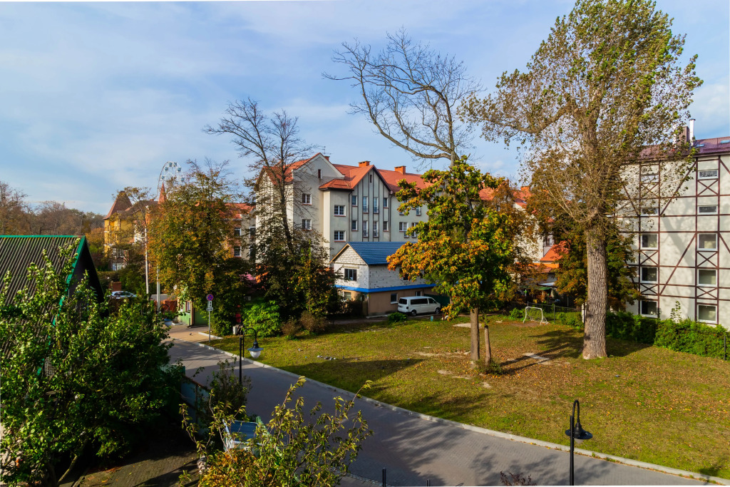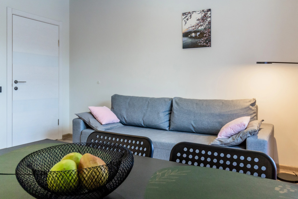 Расположение идеальное. 2 минуты и оказываешься на набережной, рядом парк с развлечениями. Много ресторанов с вкусной едой. Рядом Куршская коса, смогли рано съездить, чтоб не было пробок и народу. Апартаменты просторные. Диван на кухне раскладывается и 2 детей на нем замечательно спали.