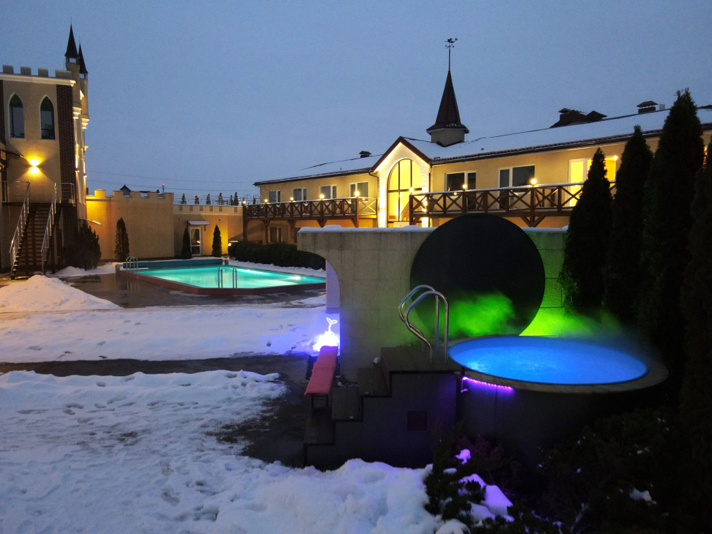 Водный комплекс включает: 2 открытых подогреваемых бассейна, крытый бассейн для взрослых и детей от 12 лет, спа-центр, открытый детский бассейн, горячее джакузи, террасу для загара, русские бани на дровах и летний бар у бассейна.