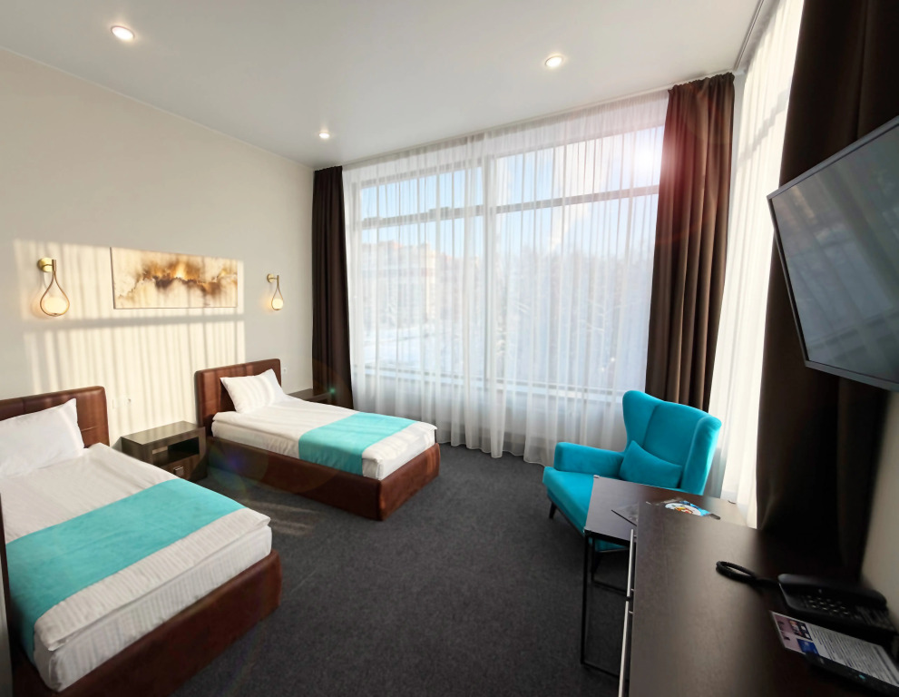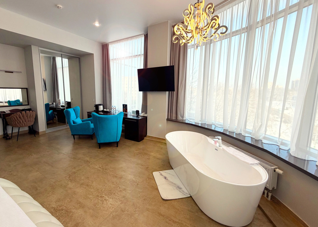 Все номера имеют высокие потолки, панорамные окна, из которых открывается вид на улицы города и парк.