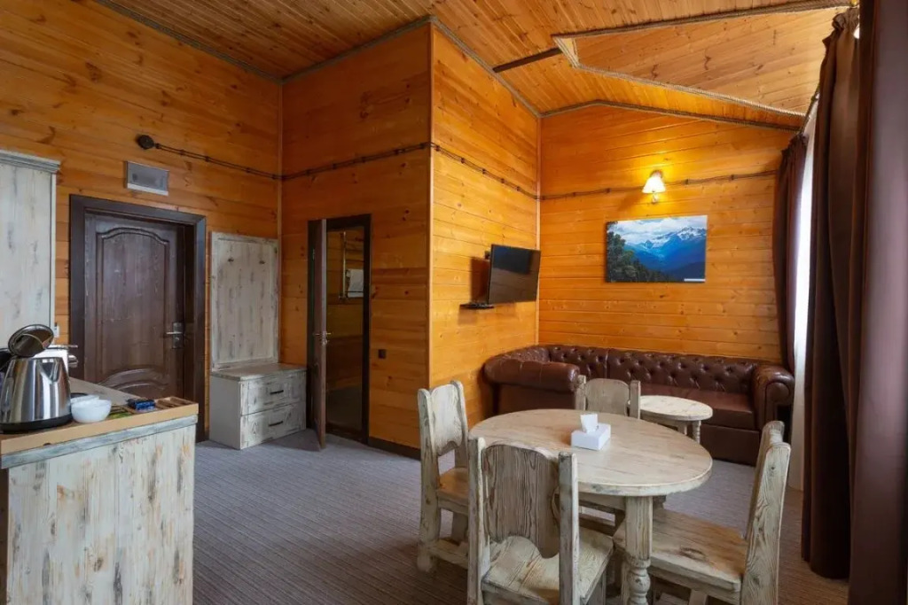 Собственная благоустроенная территория в посёлке Романтик, на берегу горной реки включает: ресторанный комплекс с аутентичной кухней, детский клуб и детские открытые площадки, форелевый пруд, BBQ-зоны, термальный открытый бассейн, банное пространство, поле для мини-футбола, волейбольная площадка.