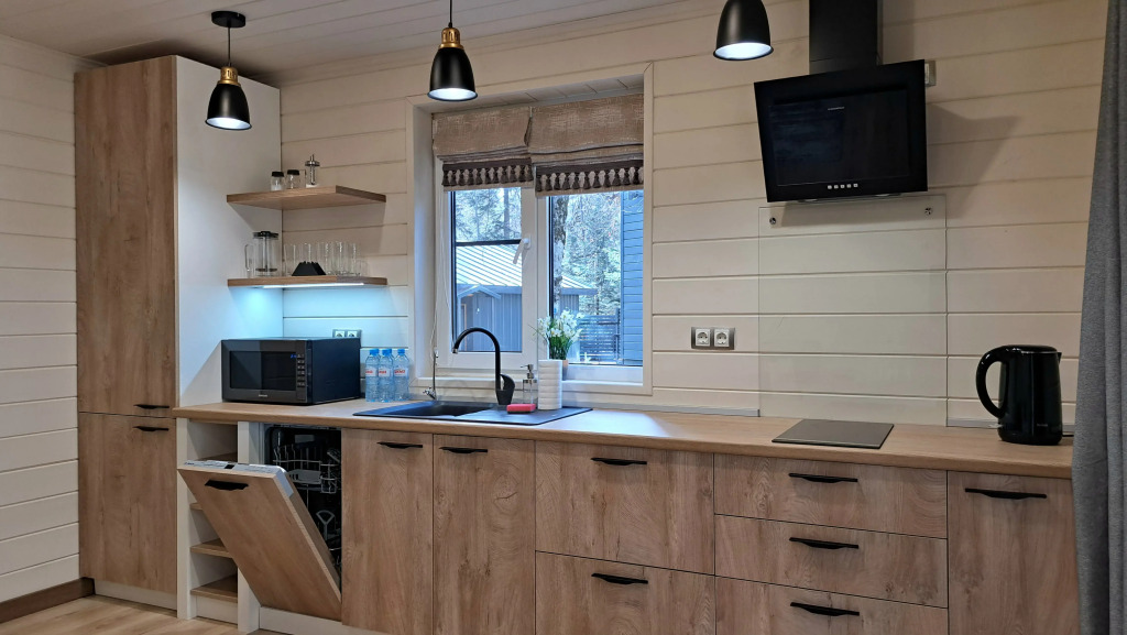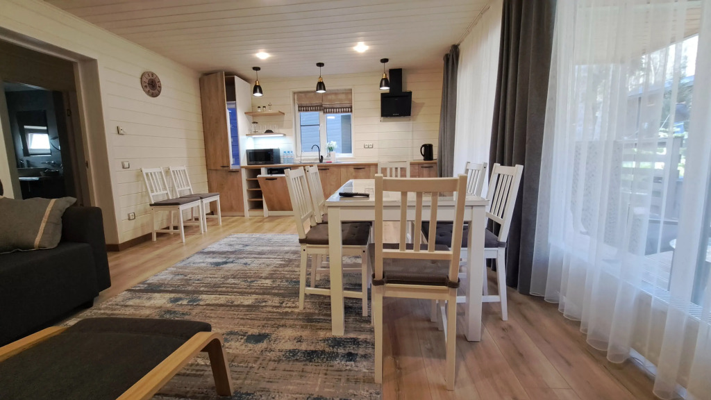 Коттеджи выполнены в современном стиле и оборудованы для проживания. В каждом есть кухня, гостиная зона, отдельные спальни и мебель. Большинство коттеджей имеют вид на горы и лес.