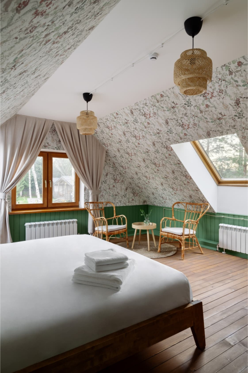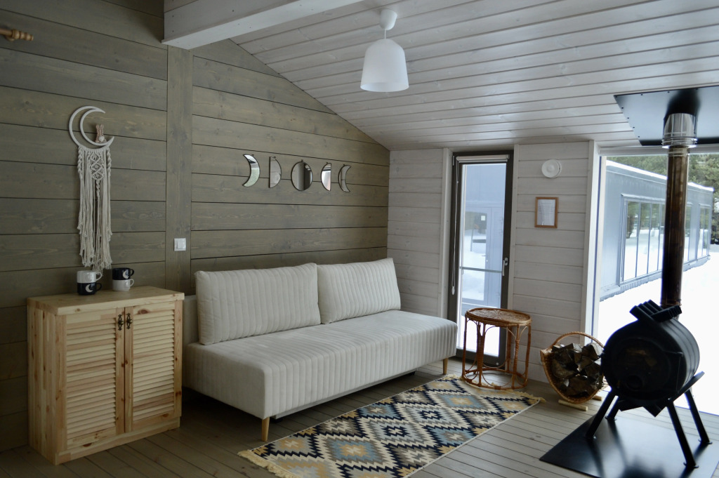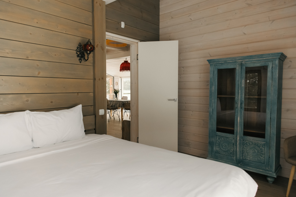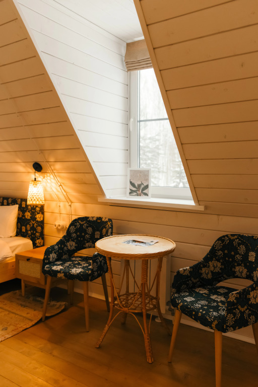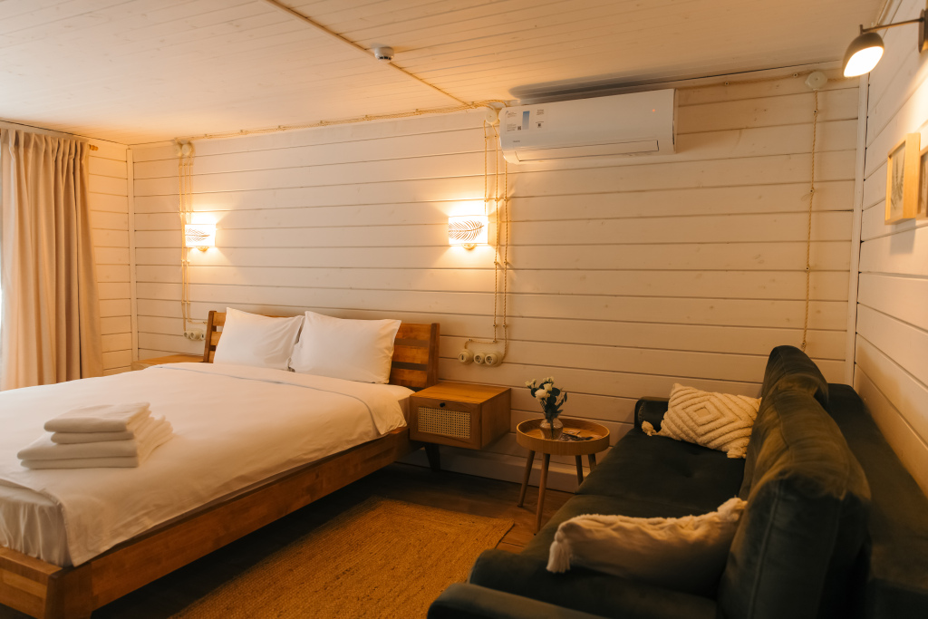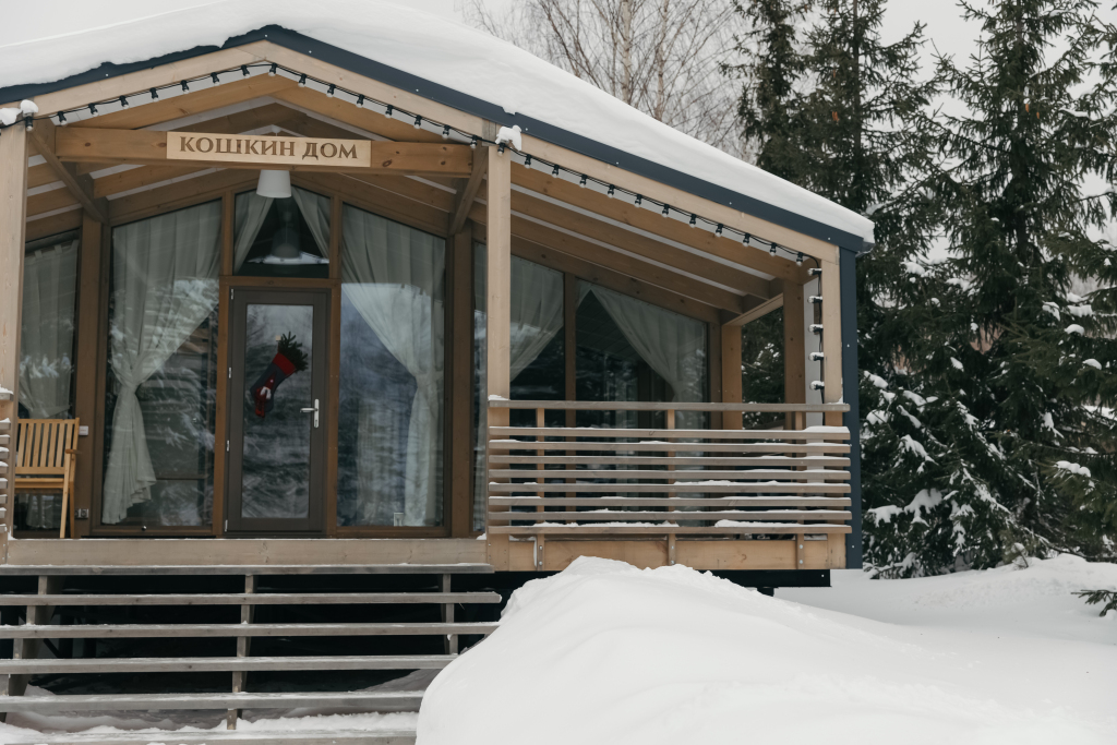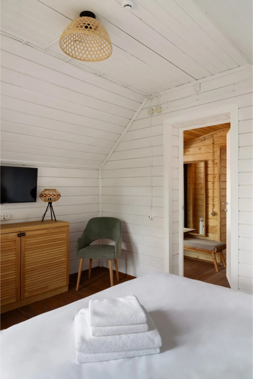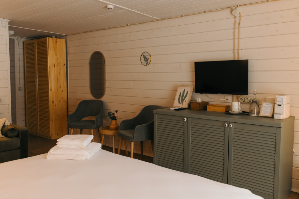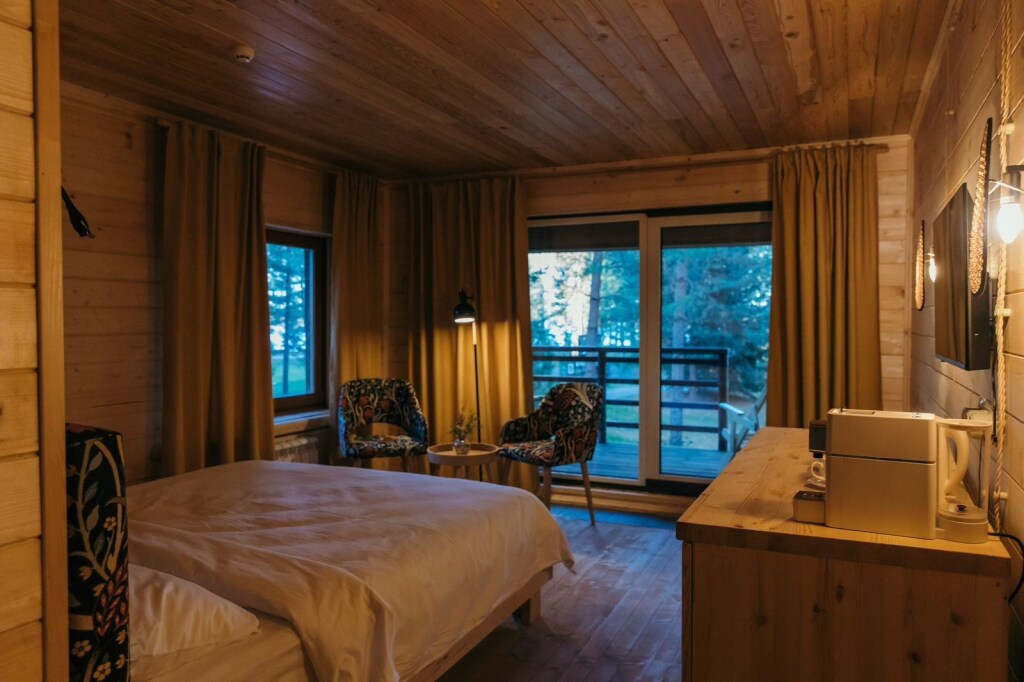 В эко-отеле есть SPA-центр с бассейном, баня с живым огнем и одна плавучая баня, миниферма с кроликами и гусями, ресторан, панорамная застеклённая веранда с видом на реку, детский клуб для детей любого возраста, кинозал для фильмов и музыкальных вечеров. В летнее время гости могут воспользоваться прокатом сап-бордов, байдарок, велосипедов, а в зимнее — лыж, коньков и тюбингов.