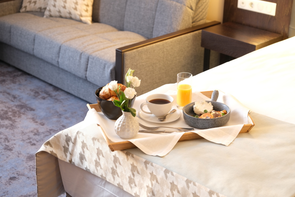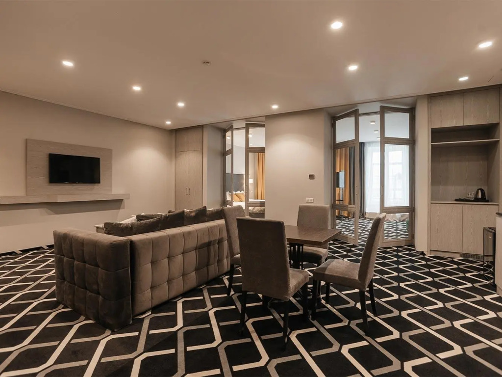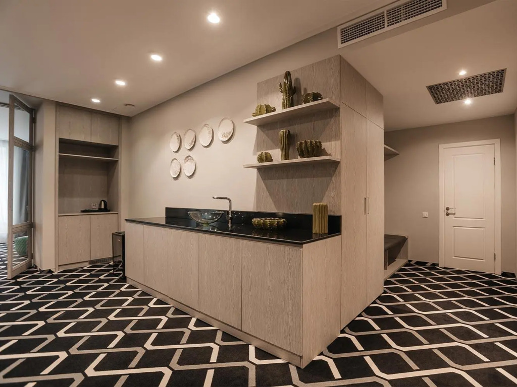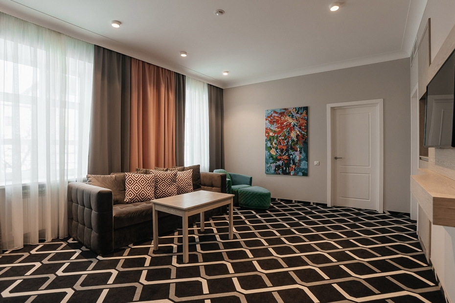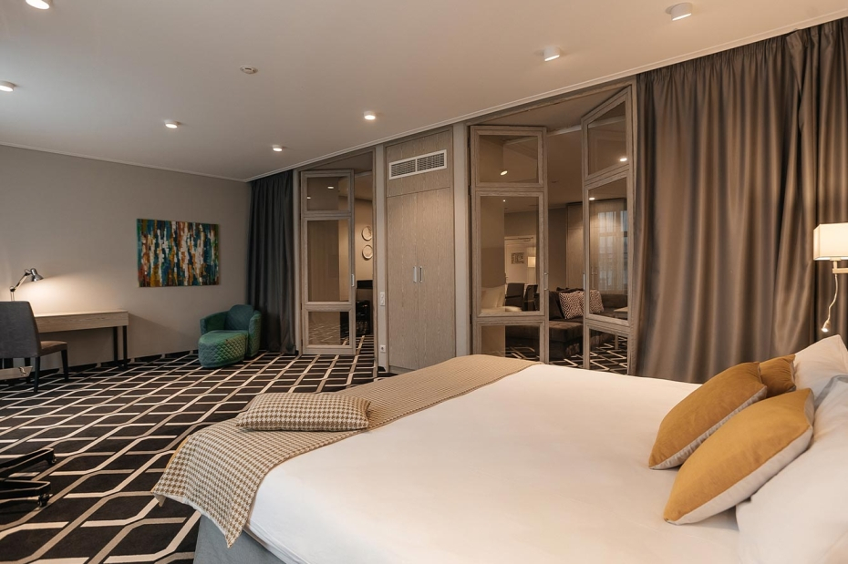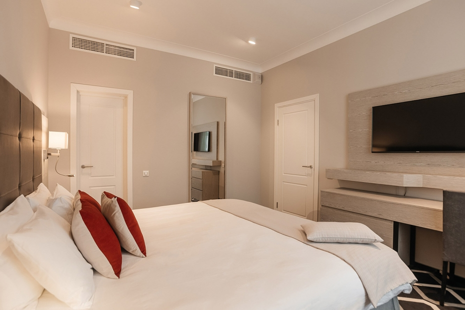 Номер уютно обставлен и оснащён необходимым, чтобы отдохнуть после долгого и насыщенного дня. Имеются телевизор, мини-бар и халат. Оснащение зависит от выбранной категории номера.