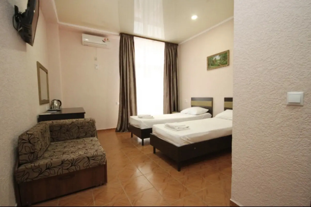 Просторная комната на четверых, чистый рабочий санузел без протечек и сбоев с водой. Панорамные окна на две стены, балкон с видом на кусочек моря, смена белья и полотенец каждые три дня. В наш заезд открылась столовая при отеле, что очень удобно. Услуга пользования стиральной машиной. В целом отличный отель для свей ценовой категории. Так, несколько нюансов: хотелось бы, чтобы шторы закрывали все окна, а не частично, утром проникает свет, а днем детей не уложить спать при ярком свете.