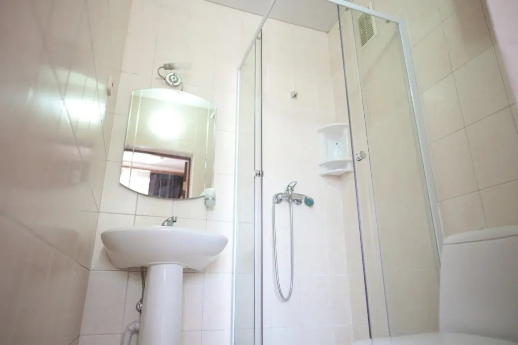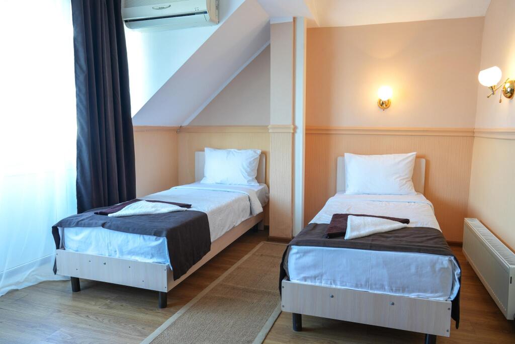В номерах предусмотрена вся необходимая мебель и техника для комфортного проживания — кровать с ортопедическим матрасом, телевизор, холодильник, сейф, кондиционер, собственная ванная комната.