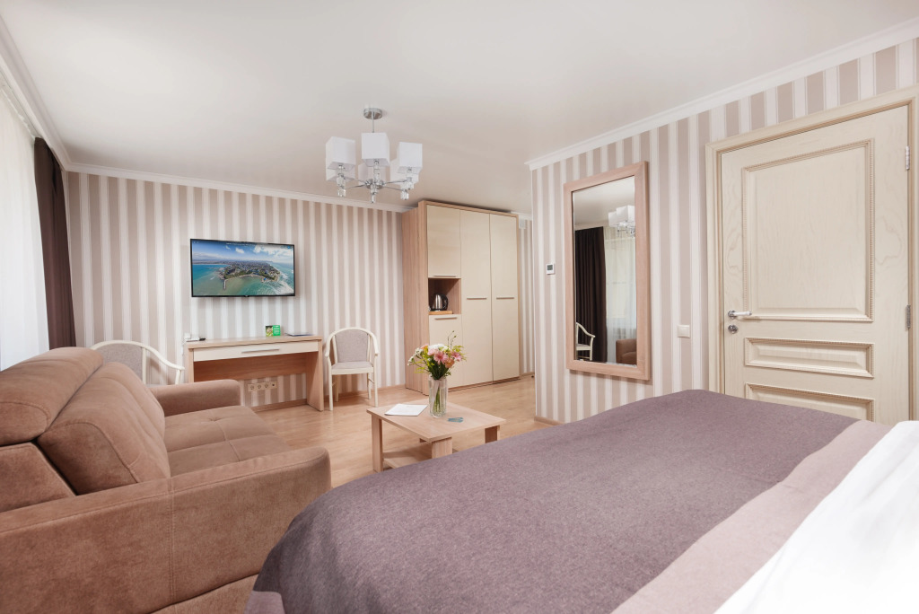 Номера категории «Стандарт плюс» без балкона рассчитаны на двух гостей и находятся на шестом этаже первого корпуса. Здание оборудовано лифтом, который поднимается до пятого этажа включительно. От пятого до шестого этажа необходимо подняться по лестнице.