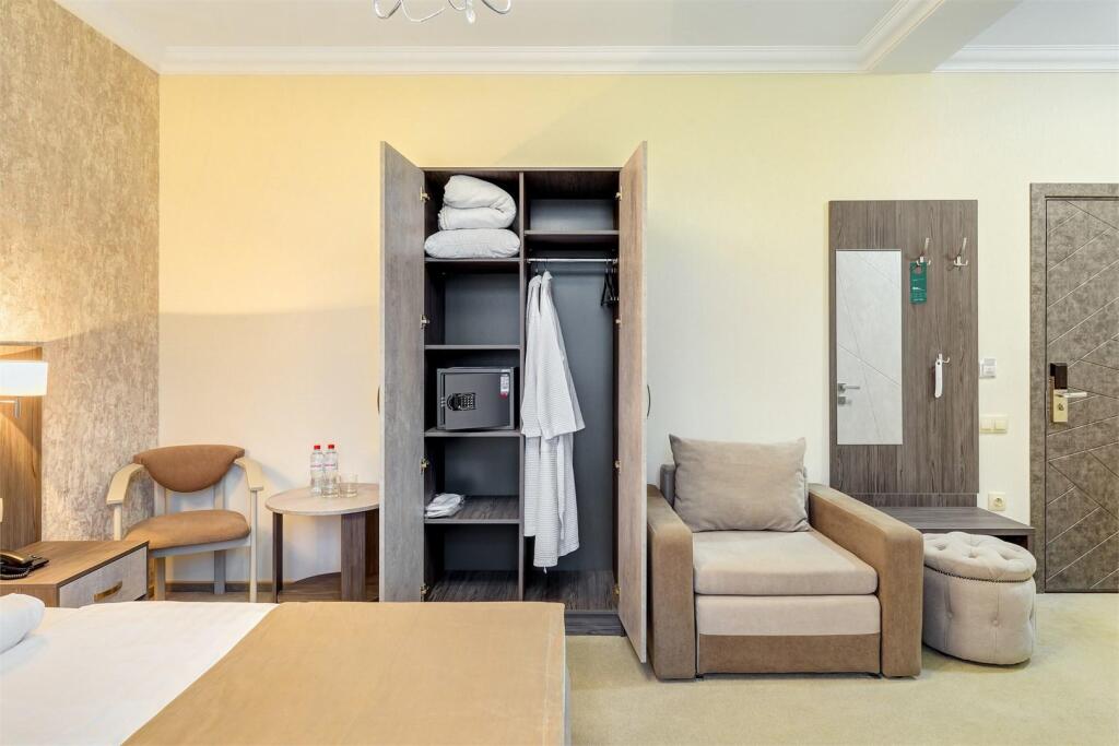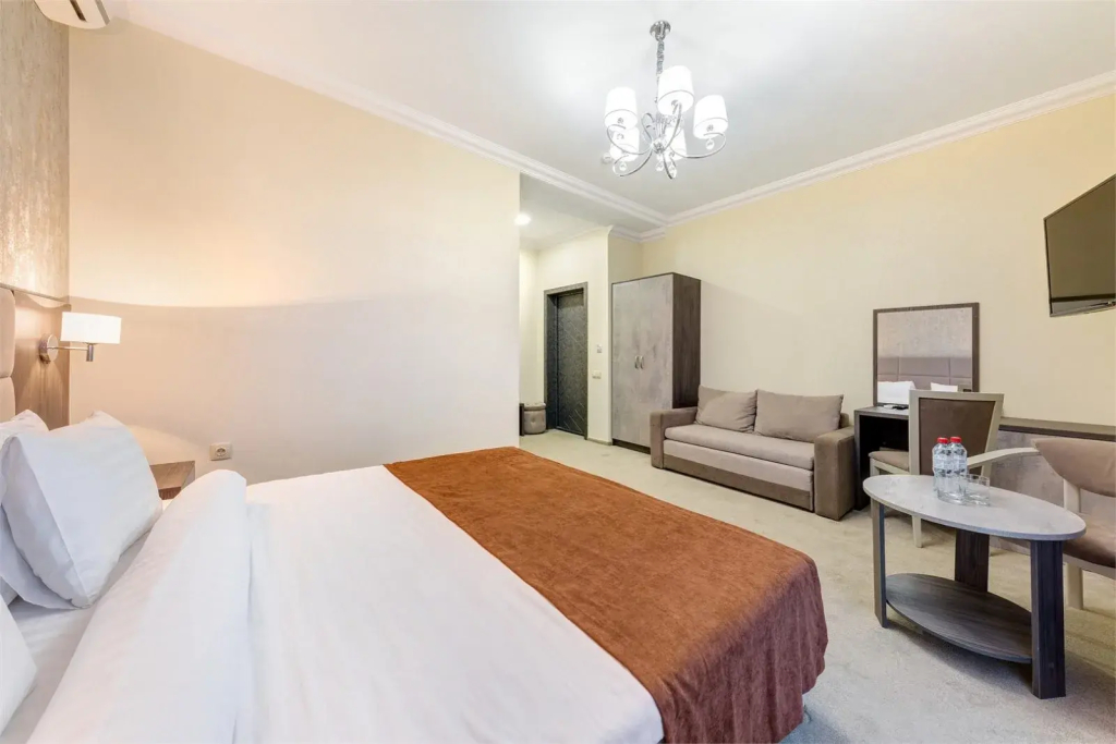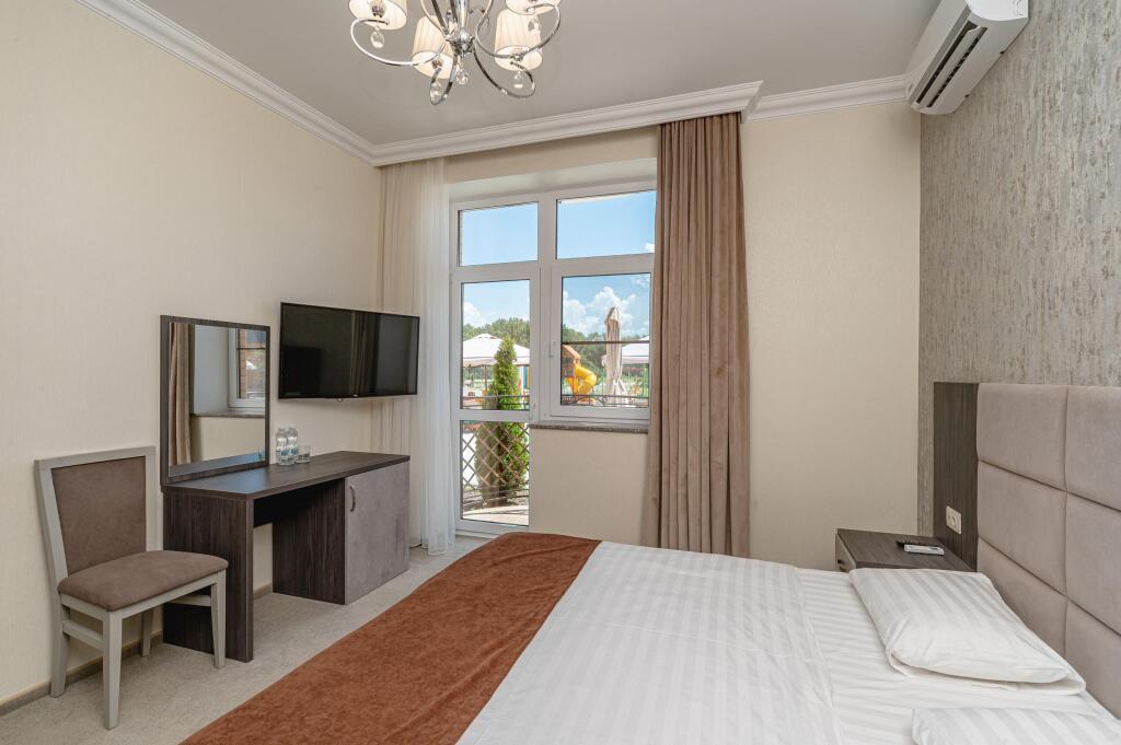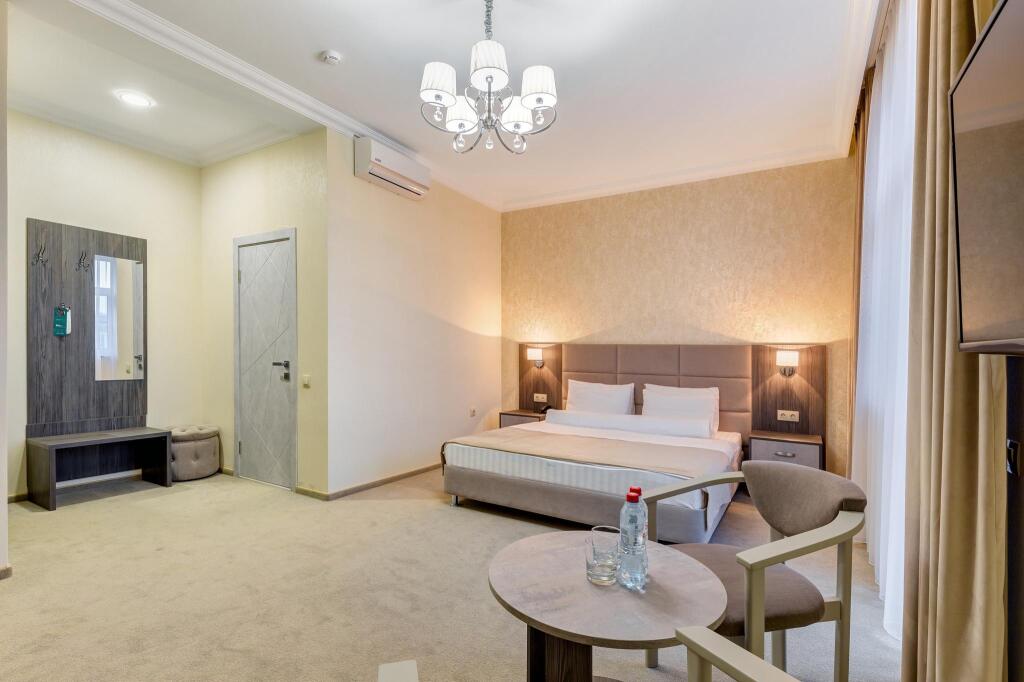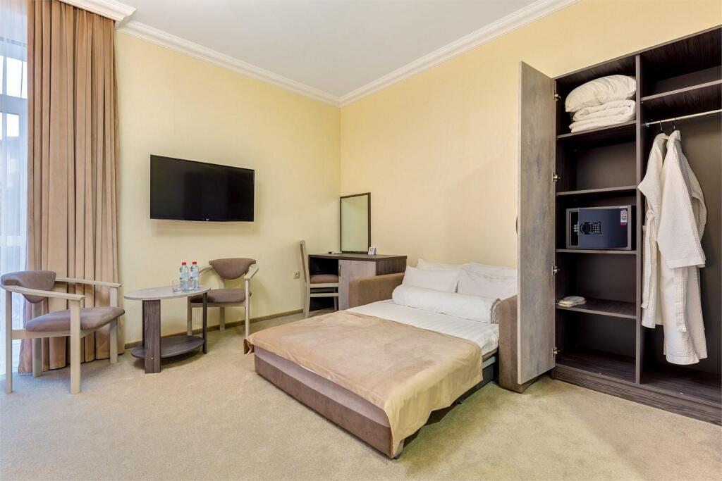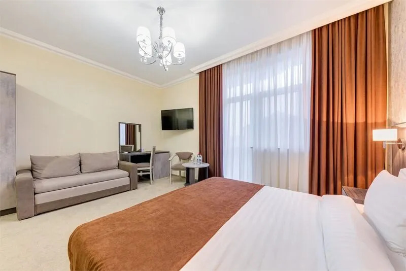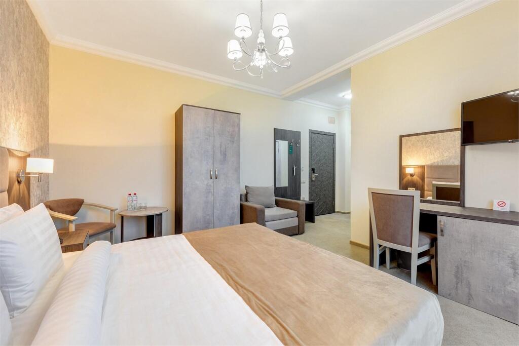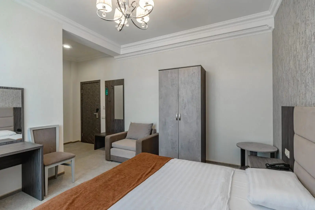Номер чистый, все необходимое имеется, удивило отсутствие бутилированной воды в номере, при этом воду можно взять на ресепшене и в кафе, не минус просто не привычно.