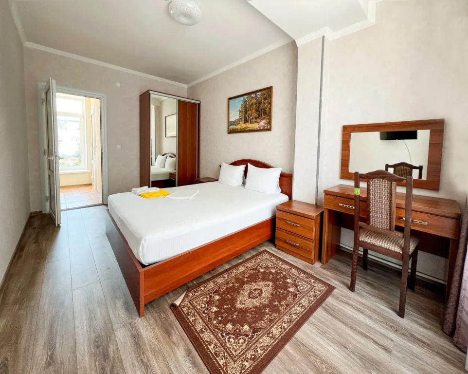 Питание организовано три раза в день: в период с мая по сентябрь действует формат «шведский стол» с горячими блюдами, гарнирами, салатами, выпечкой и напитками, а с октября по апрель предоставляется комплексное питание с учётом сезонности и программ оздоровления.