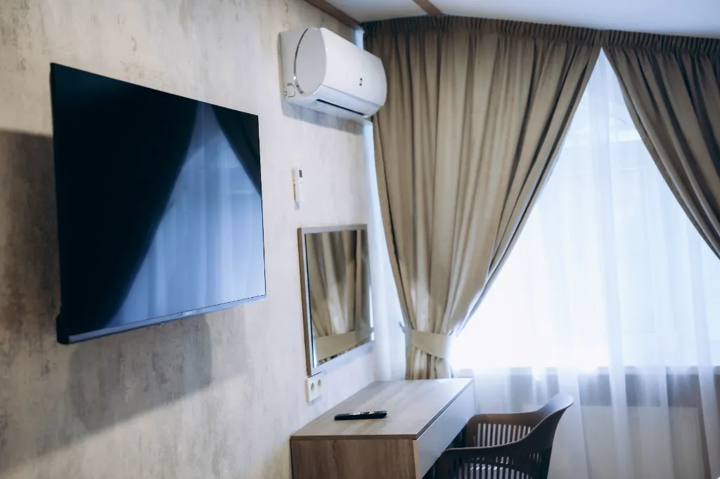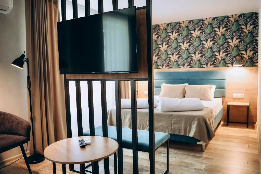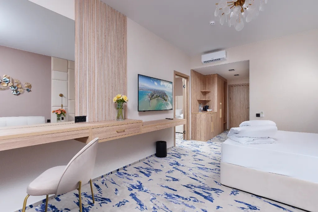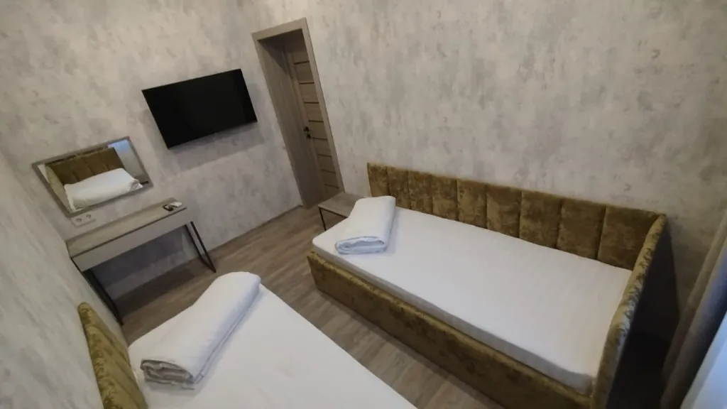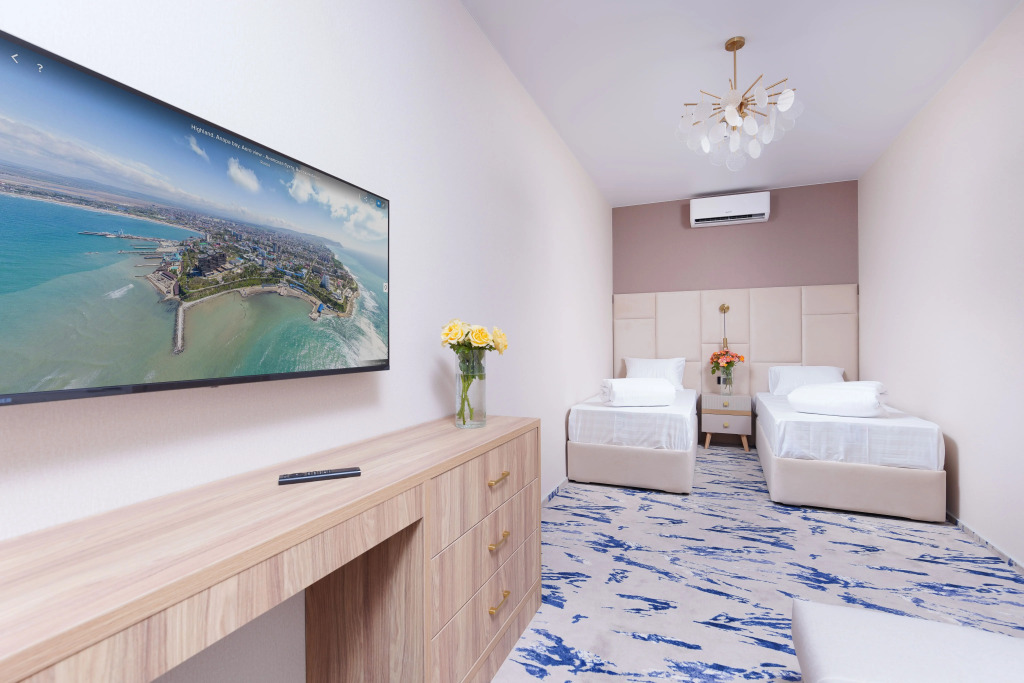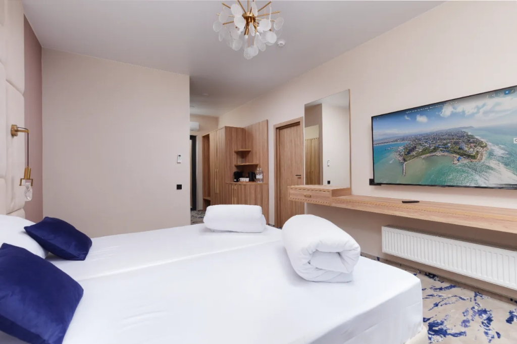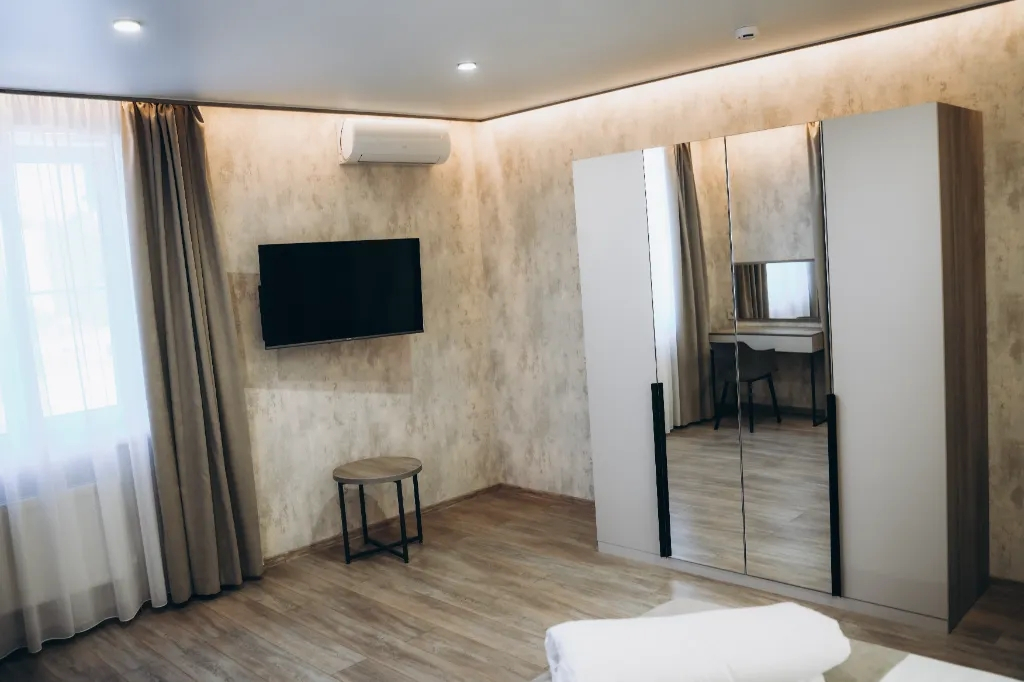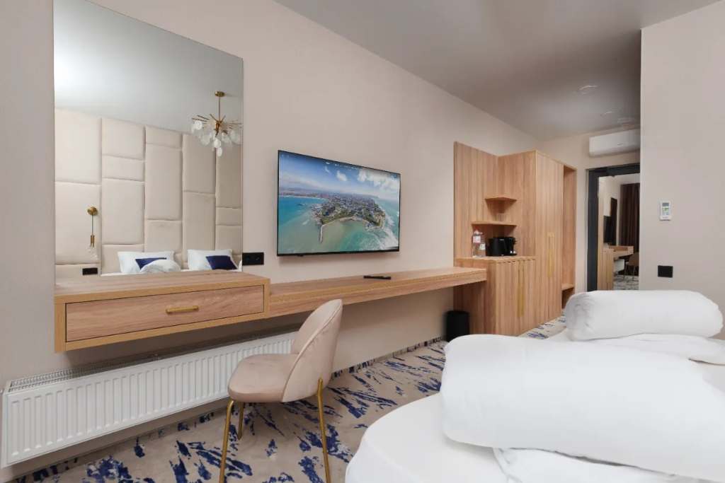 Номер обставлен и оснащён, чтобы отдохнуть после долгого и насыщенного дня. Имеются телевизор и халат. Перечисленные услуги есть не во всех номерах.