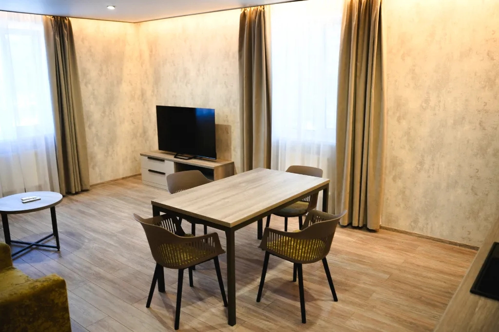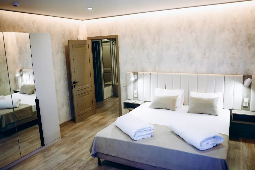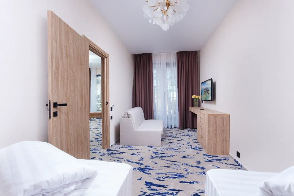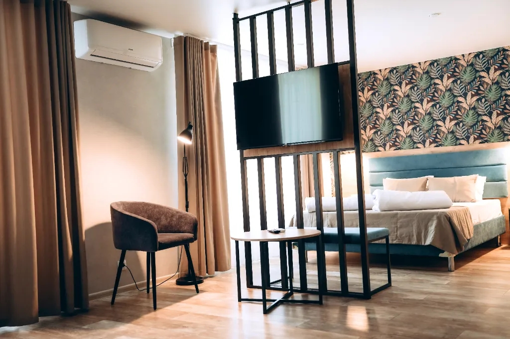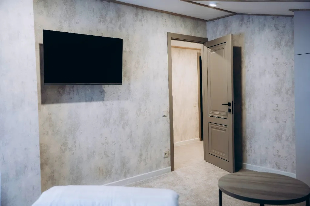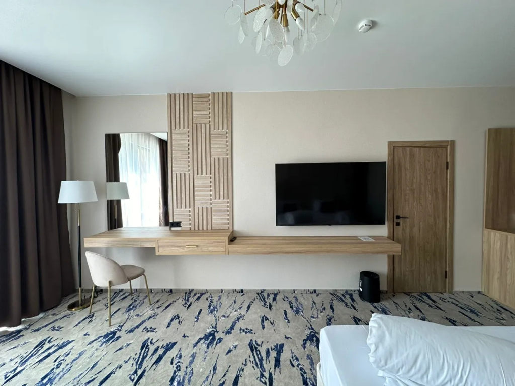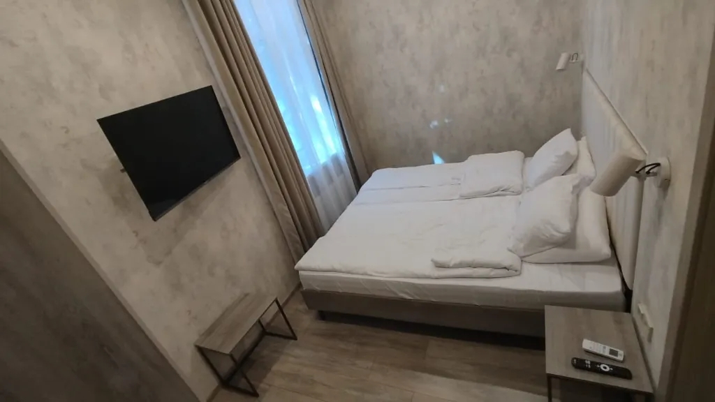 Номер обставлен и оснащён, чтобы отдохнуть после долгого и насыщенного дня. Имеются телевизор и халат. Перечисленные услуги есть не во всех номерах.