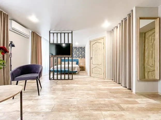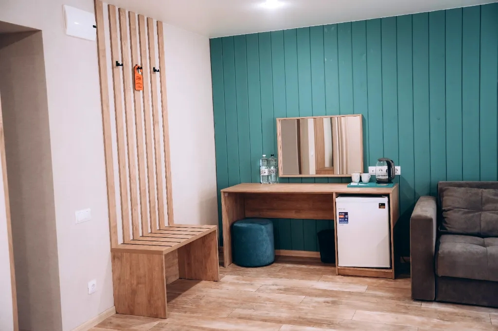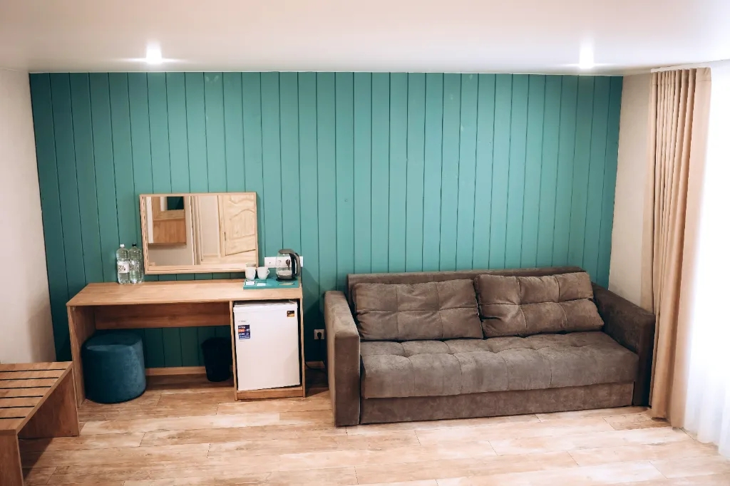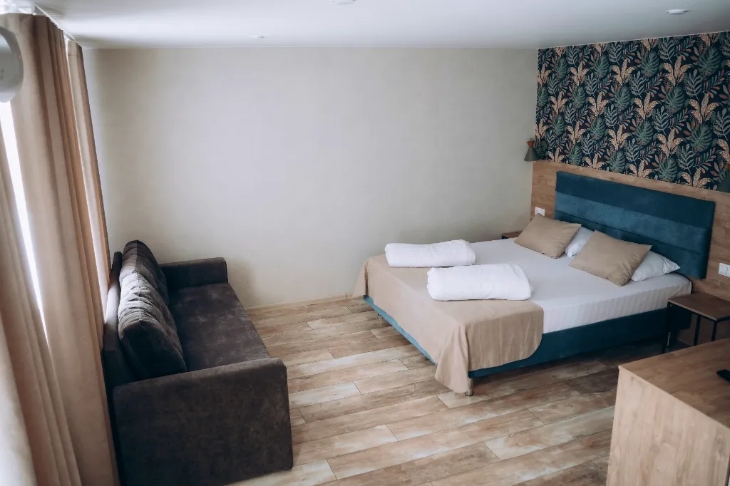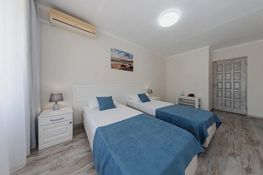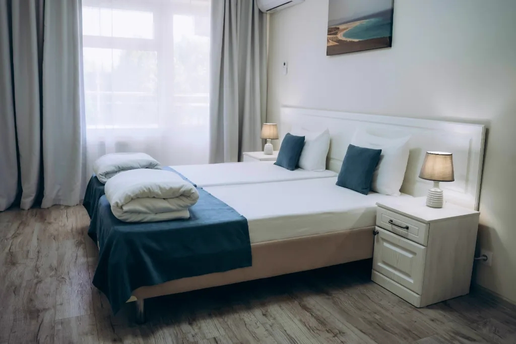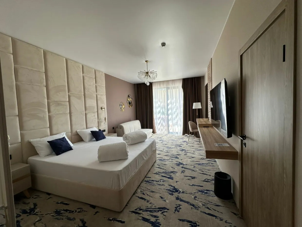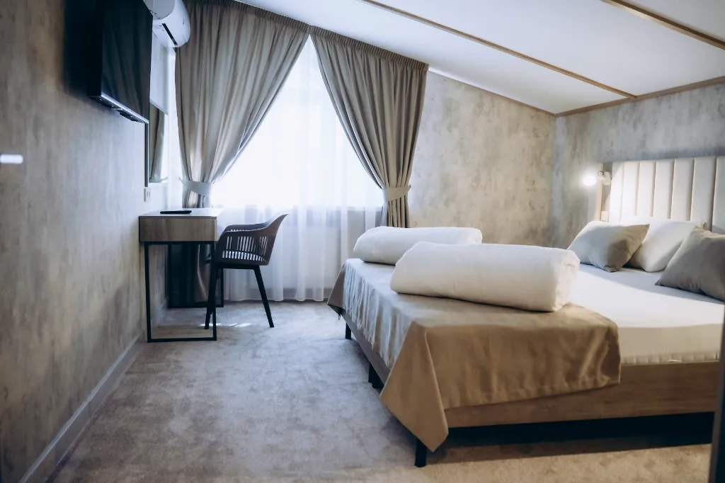 Номер обставлен и оснащён, чтобы отдохнуть после долгого и насыщенного дня. Имеются телевизор и халат. Перечисленные услуги есть не во всех номерах.