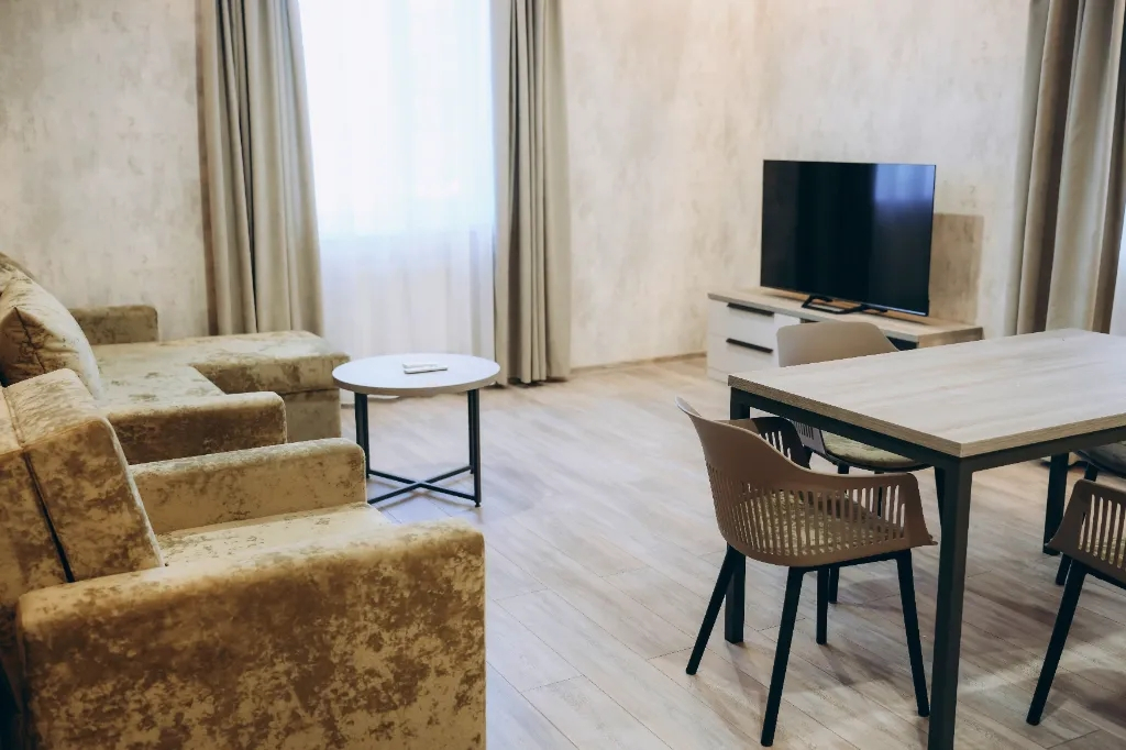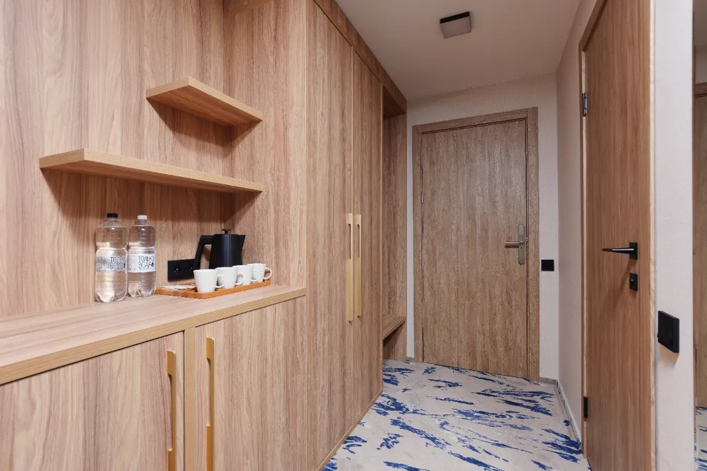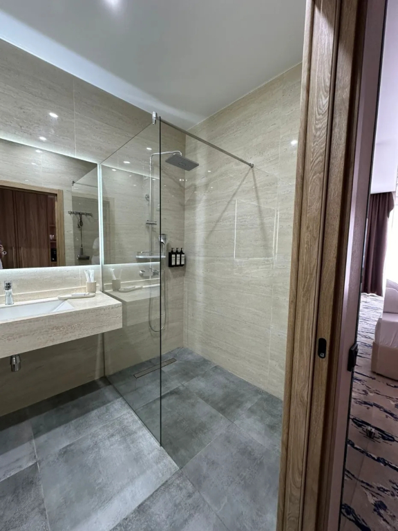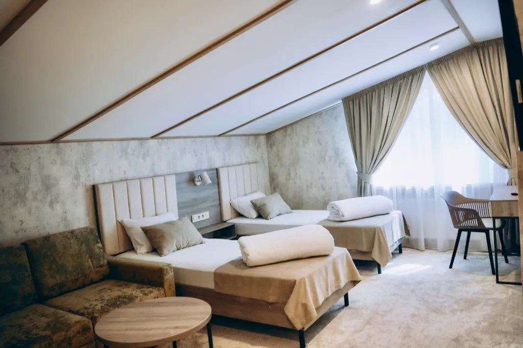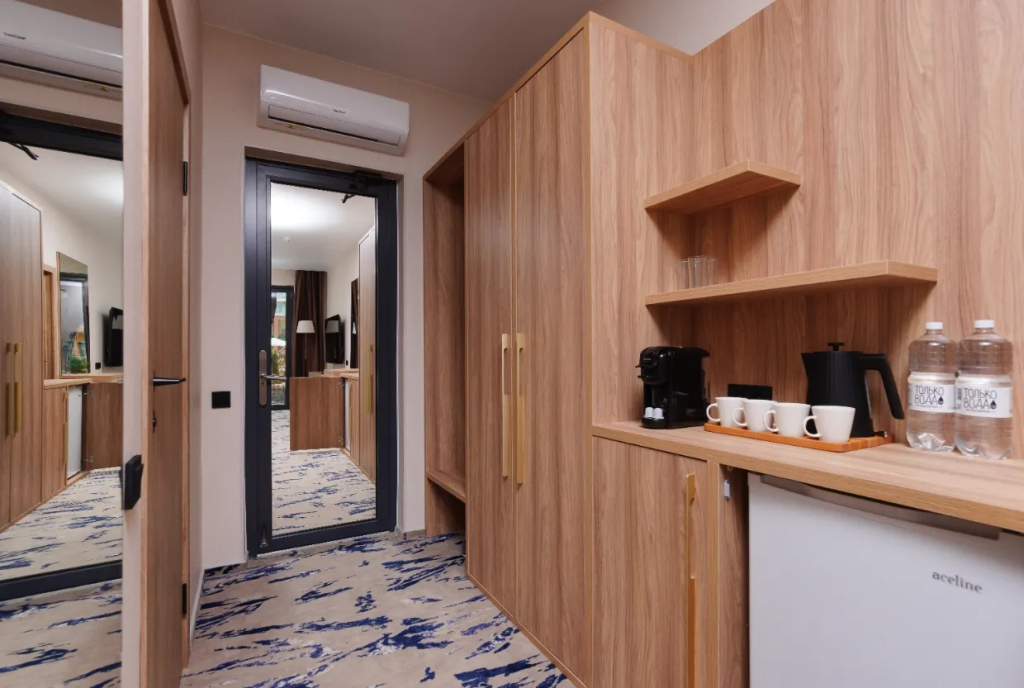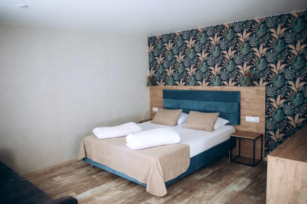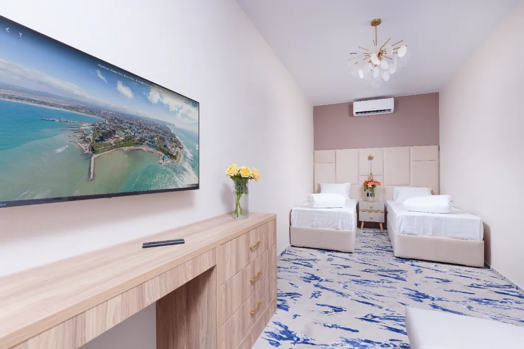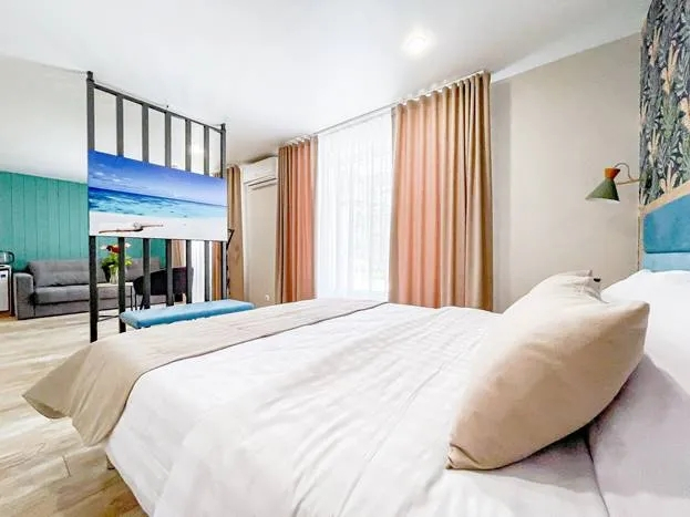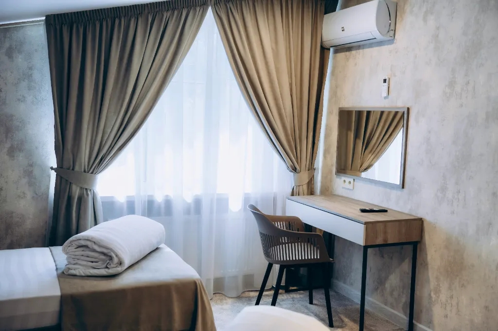 Номер обставлен и оснащён, чтобы отдохнуть после долгого и насыщенного дня. Имеются телевизор и халат. Перечисленные услуги есть не во всех номерах.