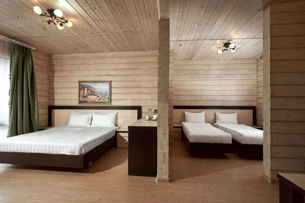 - Парковка есть , но она занята, не рассчитана на большое количество машин, приехали и поставили на улице рядом с отелем .было все занято, ждали пока освободится место, очень неудобно. Поселили нас на последнем этаже , при бронировании это не указали , очень маленький номер, окон нет. У нас маленький ребенок и постоянно приходилось идти со всеми вещами на третий этаж . Обычно , что селят на мансарде пишут везде, мы не выбирает такие номера. Напитков алкогольных особо нет, пиво и самое дешевое шампанское. Еда хорошая , разнообразие есть .