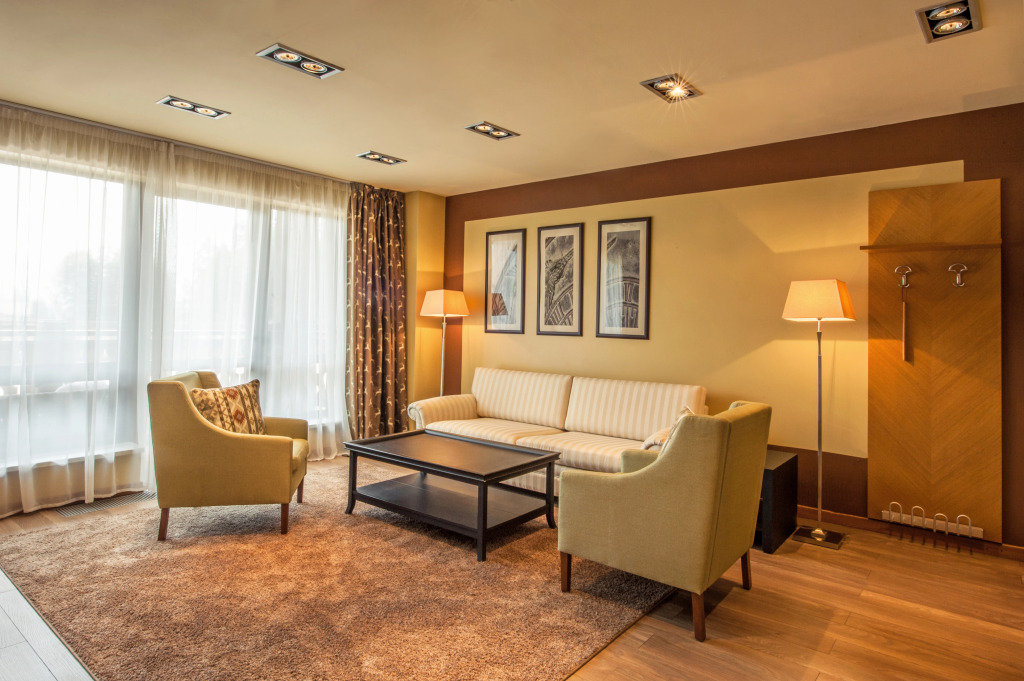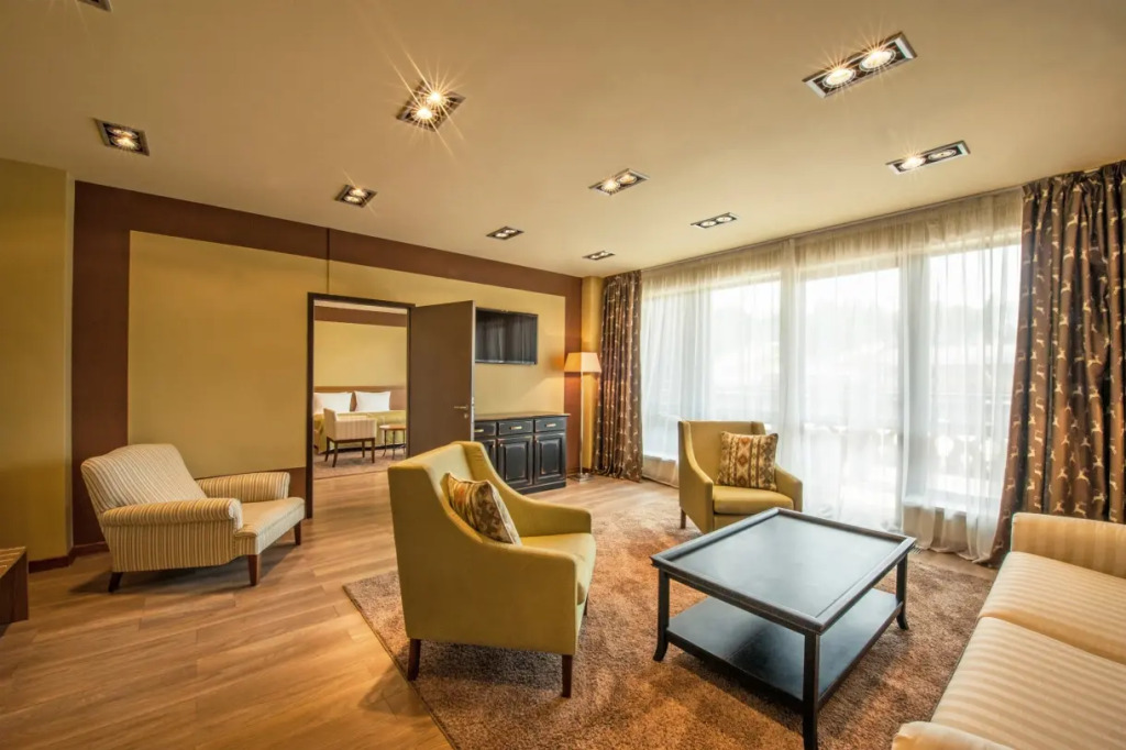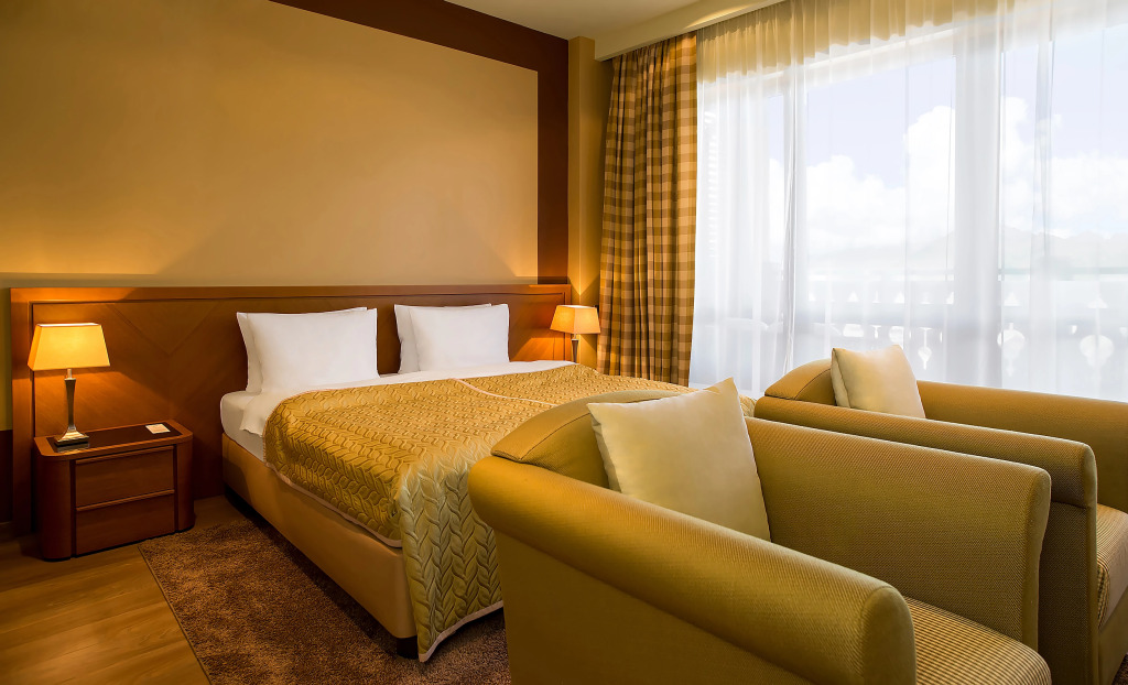 Гостям доступны номера с панорамными окнами категорий стандарт, студия, полулюкс, люкс, семейный люкс. Также предлагаются апартаменты, семейные апартаменты, коттеджи.