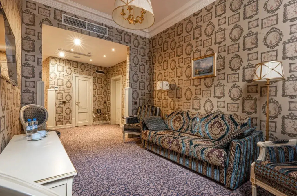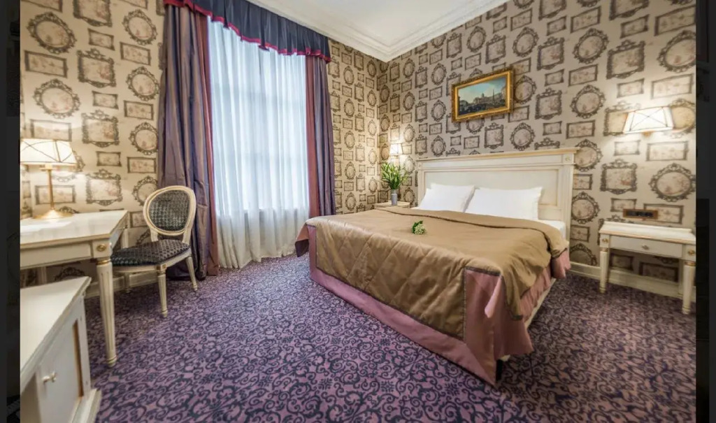 Интерьеры номеров созданы по дизайн-проекту Валентина Юдашкина. Отель разместился в здании, стилизованном под особняки Петербурга 19 века и объединил в себе разные стили — от классицизма до барокко. В холле установлены лавочки и кованые фонари, мраморные лестницы оформлены коваными перилами, на стенах — виды города на Неве. В отеле всего 11 номеров. В отделке использованы обои дворянских гостиных и итальянский текстиль. Мебель цвета слоновой кости выполнена на заказ на фабриках Италии и Франции, что соответствует духу аристократической эпохи Северной столицы. На первом этаже гостей встречает кафе-пекарня, в котором в утреннее время организованы завтраки для гостей отеля.
