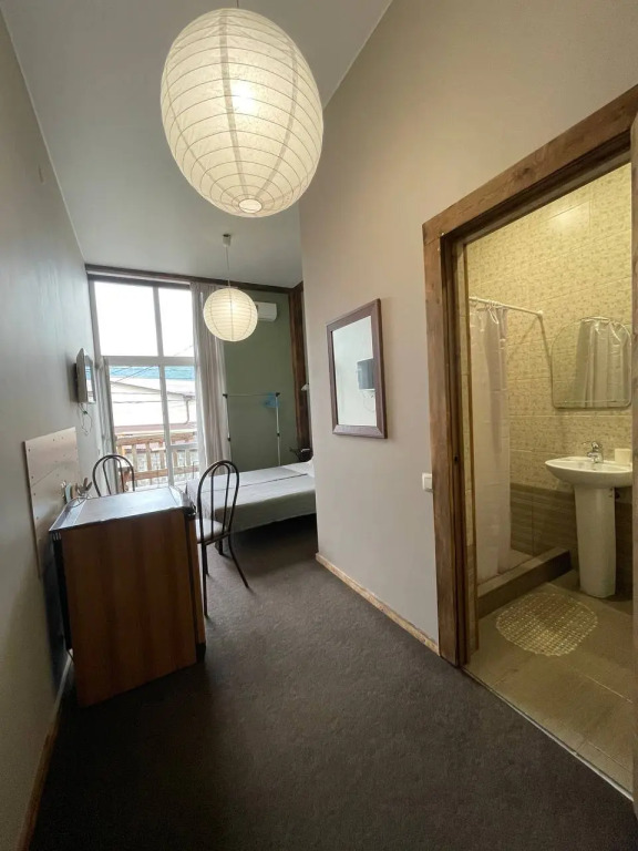 Номер в стиле лофт, чисто, ремонт достаточно свежий. Всегда обращаю внимание на ванную комнату, здесь она была чистой, удобной, сделана со вкусом. В номере есть холодильник, необходимая посуда. Утюг и гладильная доска непосредственно около выхода, в коридоре.