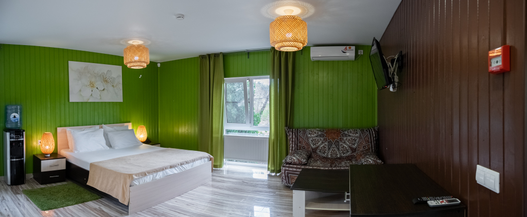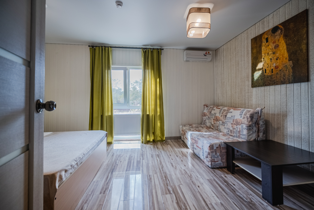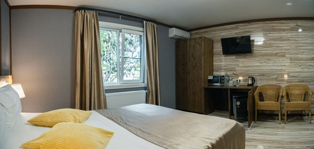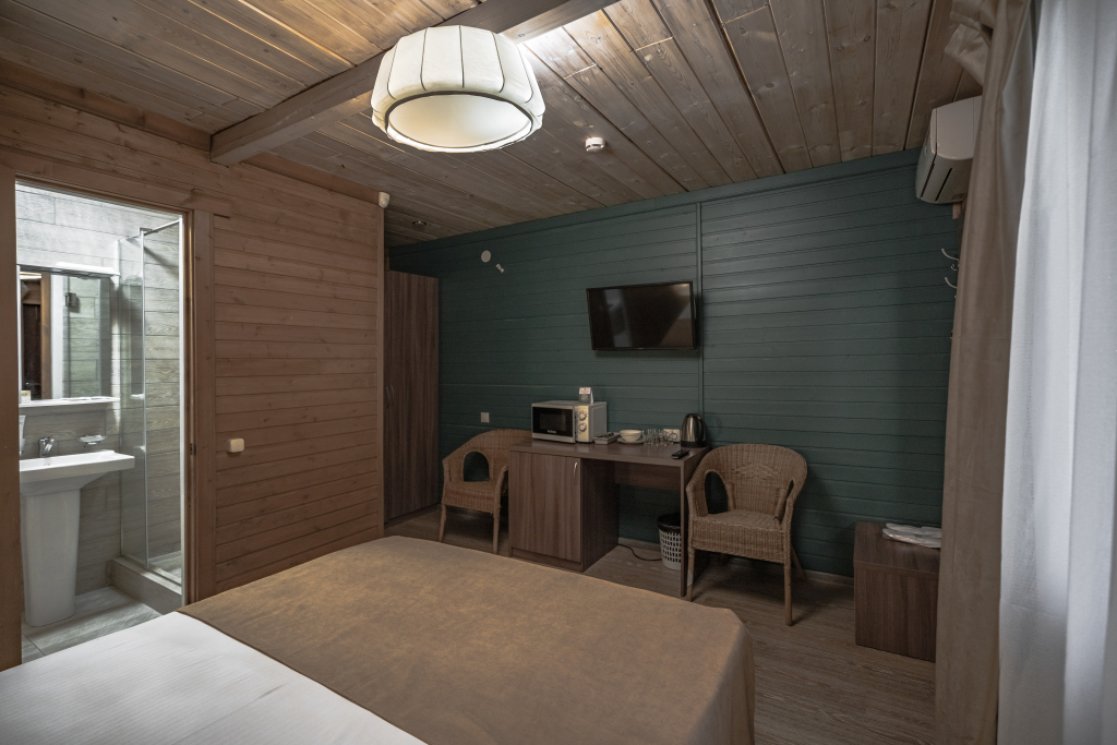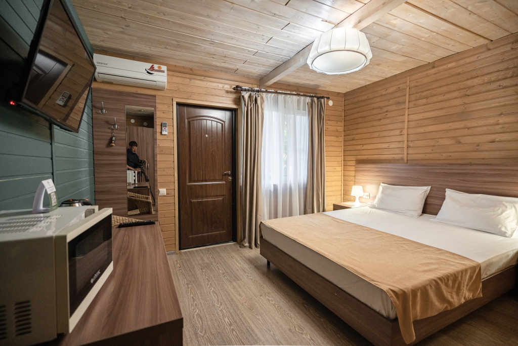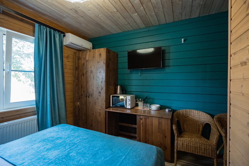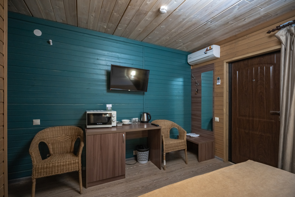 Каждый номер оборудован современной мебелью, посудой, СВЧ, сплит-системой, спутниковым ТВ, санузлом с душем.