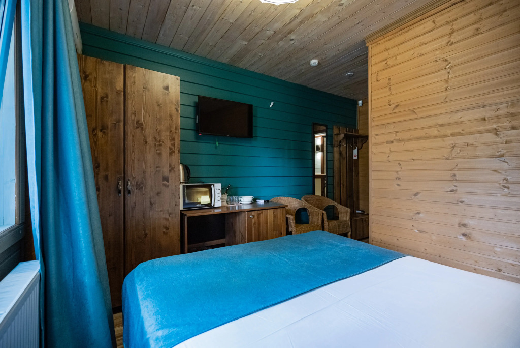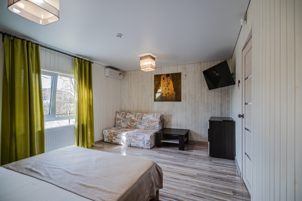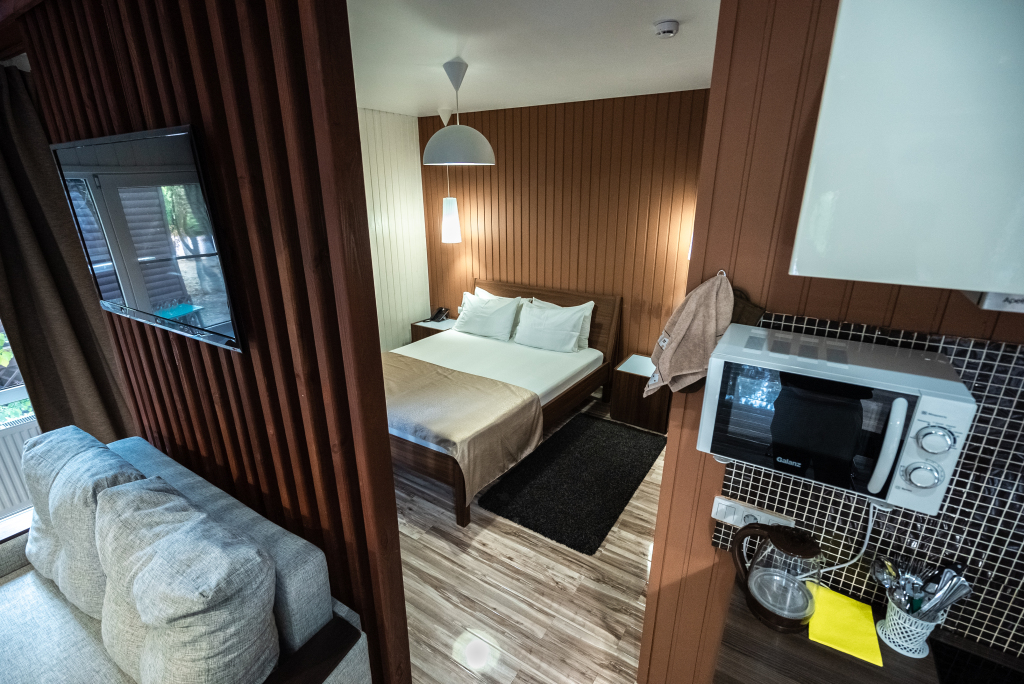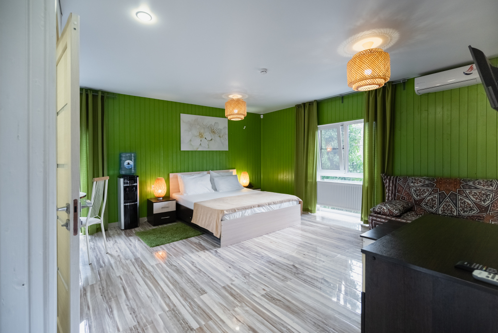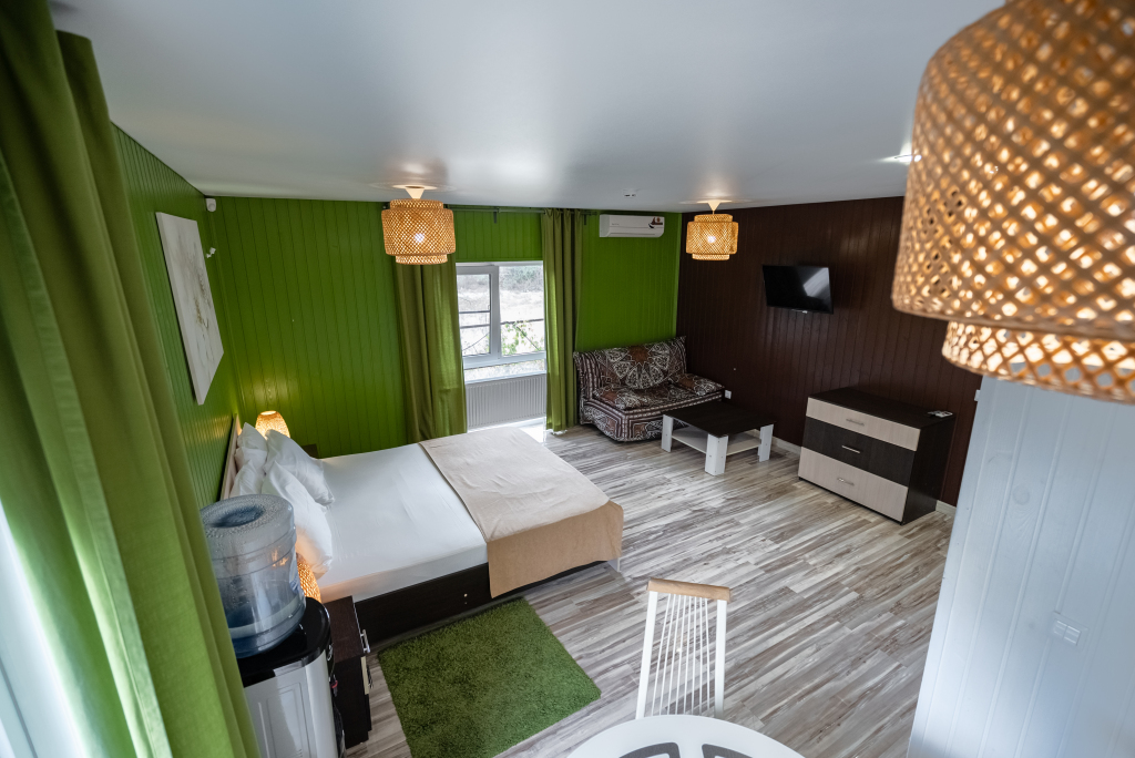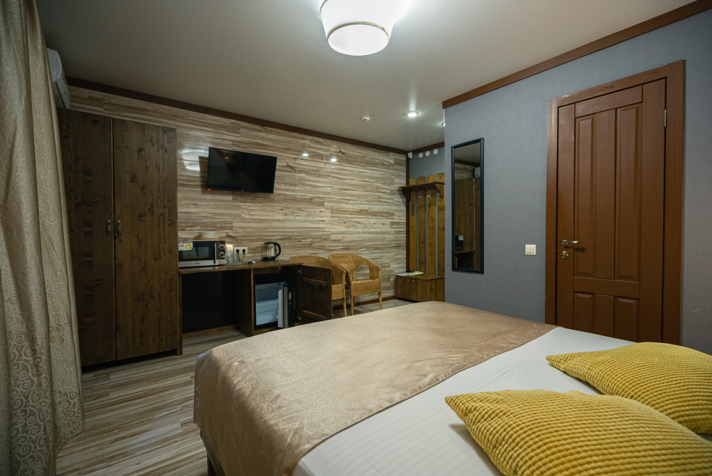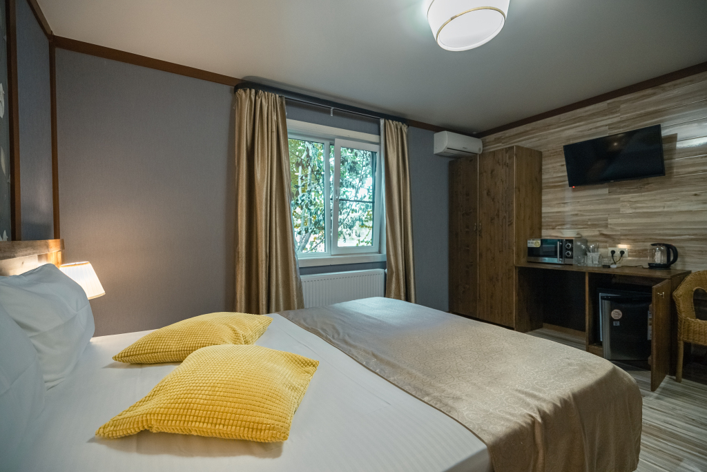 Каждый номер оборудован современной мебелью, посудой, СВЧ, сплит-системой, спутниковым ТВ, санузлом с душем.