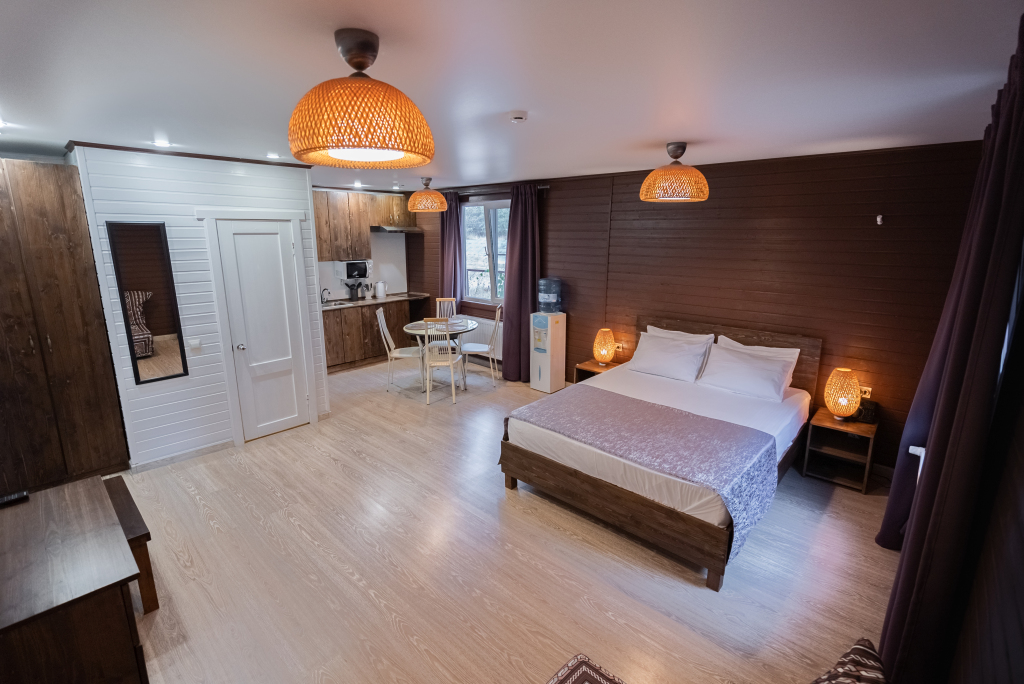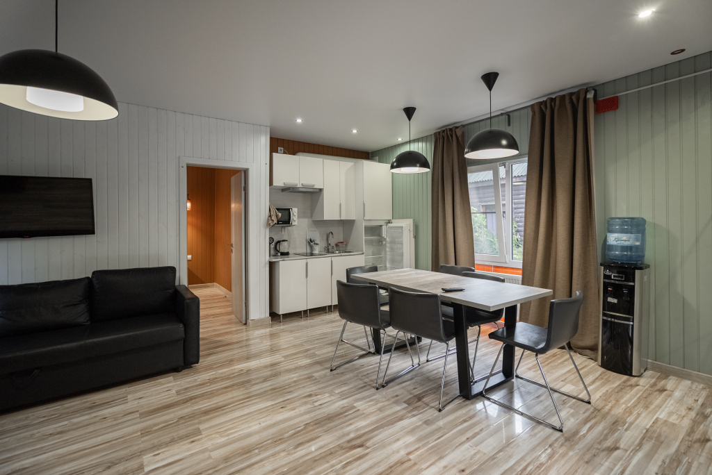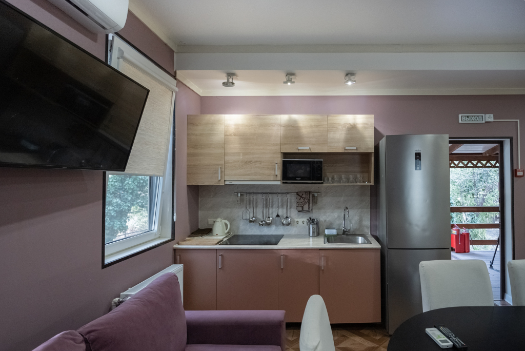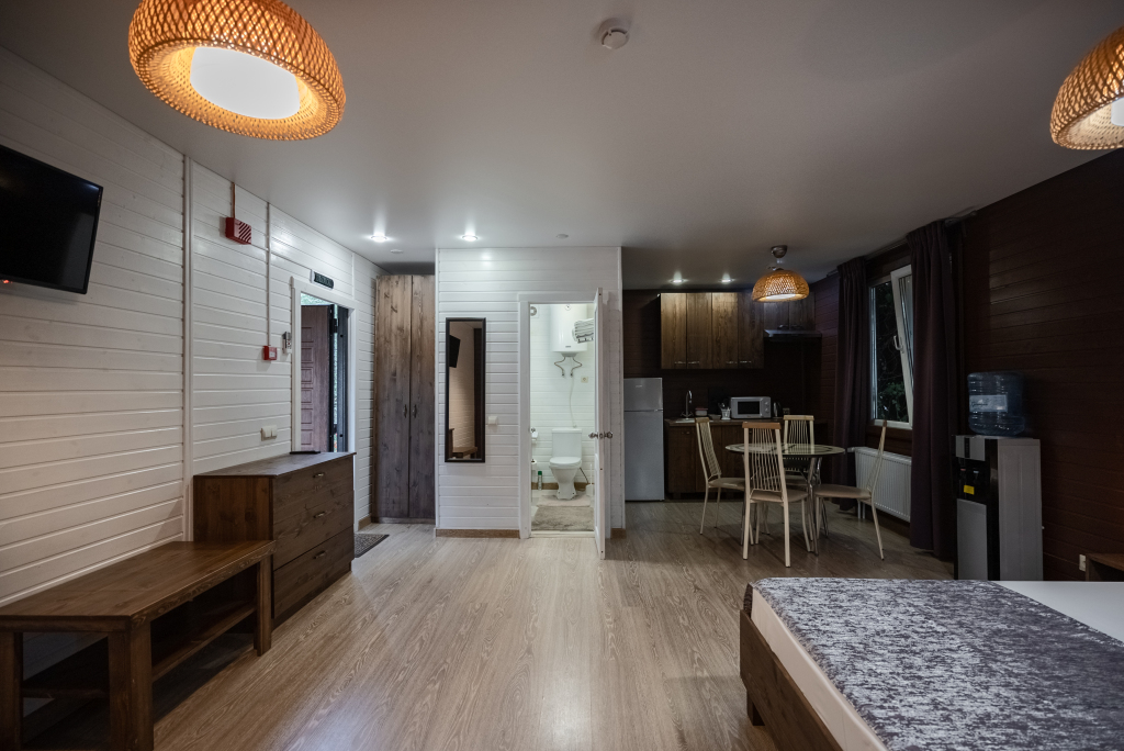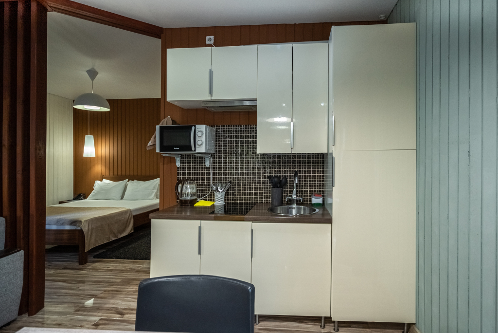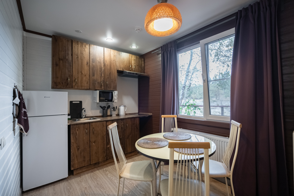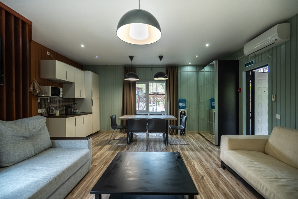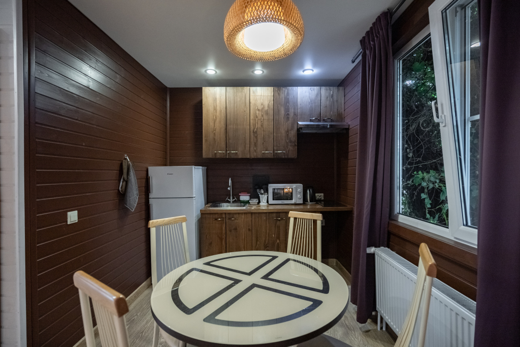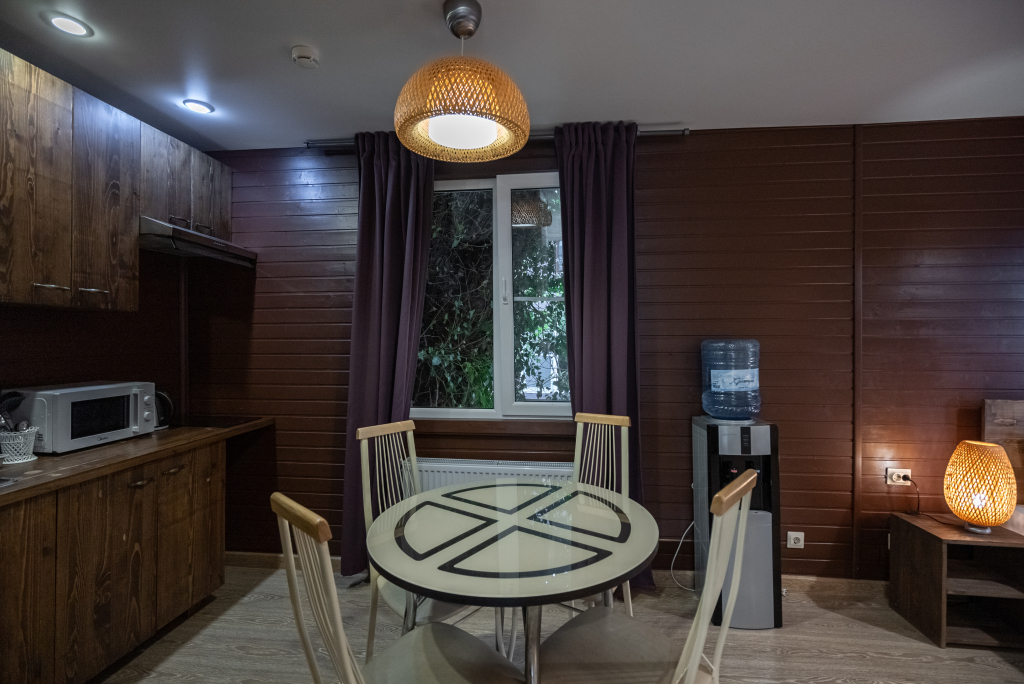 В категориях «Вилла», «Коттеджи» и «Апартаменты» есть кухня для самостоятельного приготовления пищи, обеденная зона, кулер.