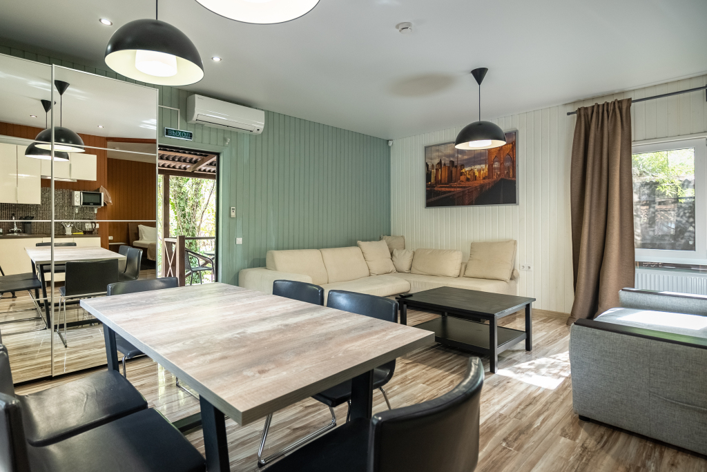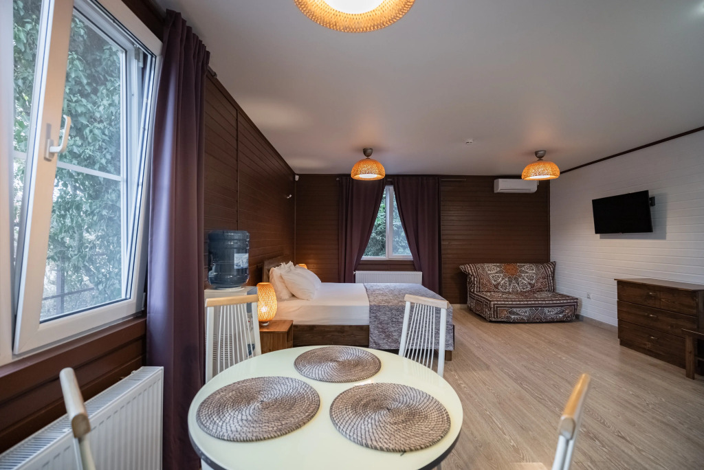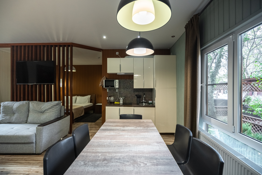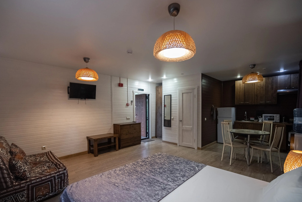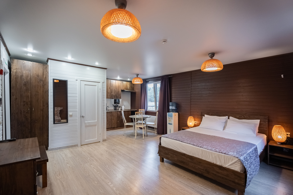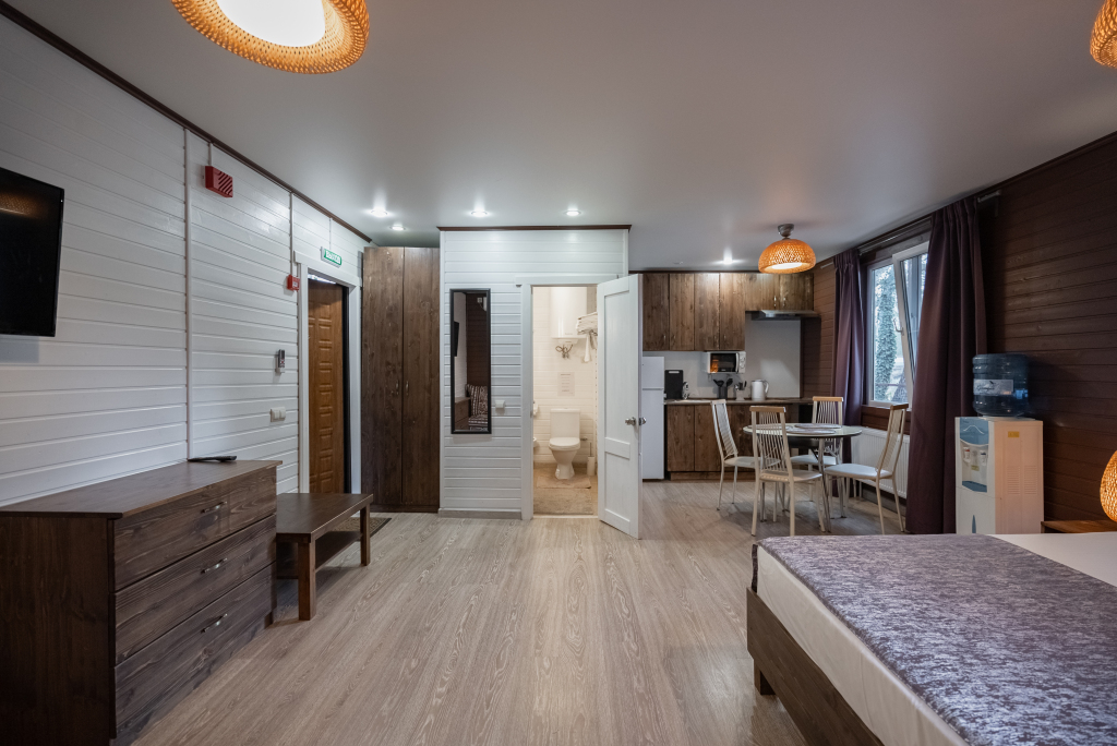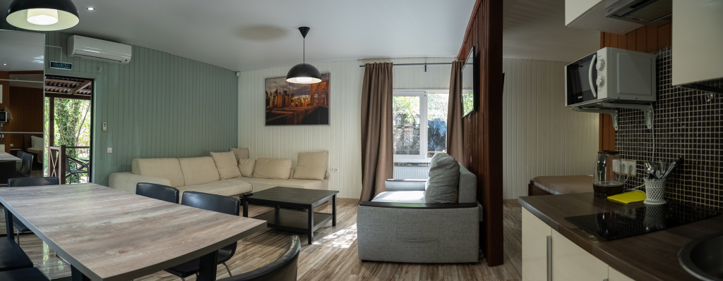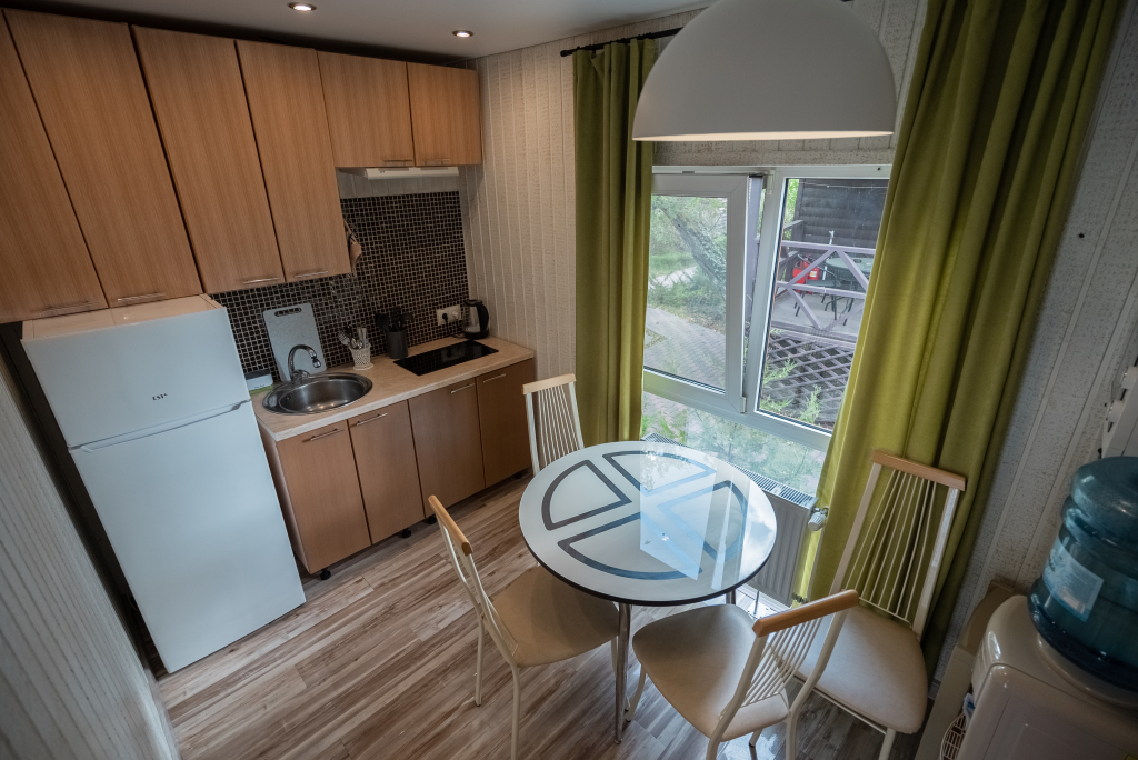 В категориях «Вилла», «Коттеджи» и «Апартаменты» есть кухня для самостоятельного приготовления пищи, обеденная зона, кулер.
