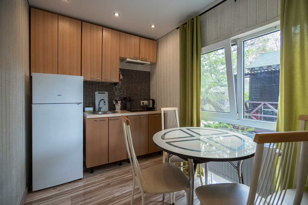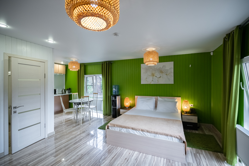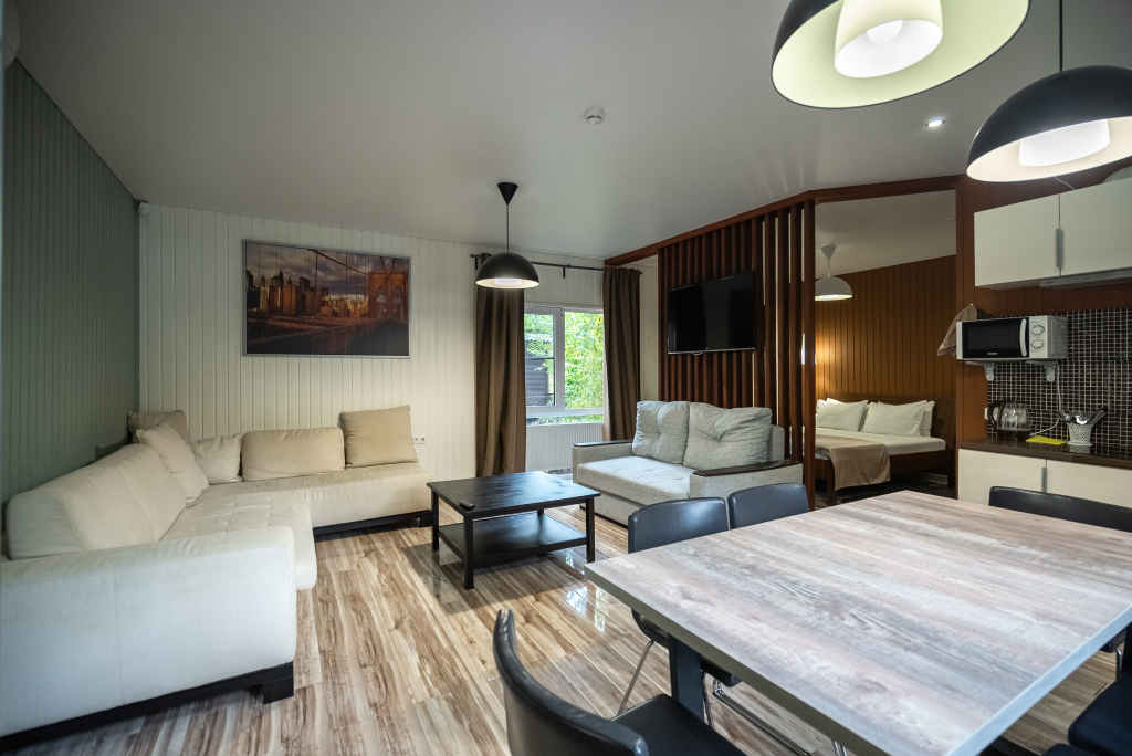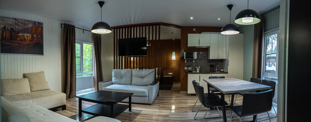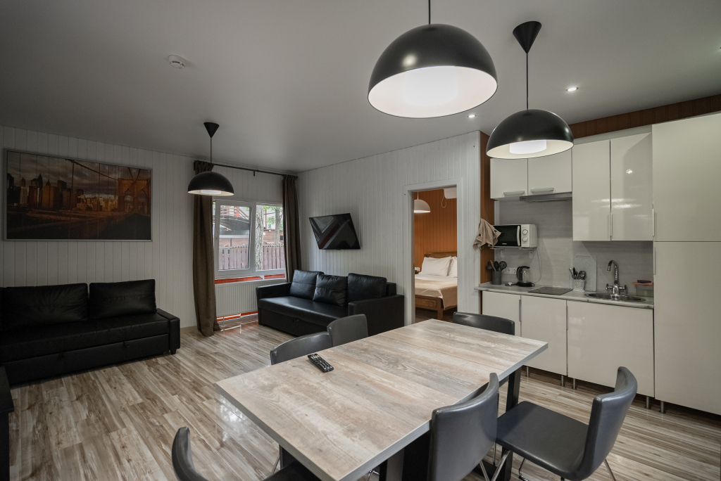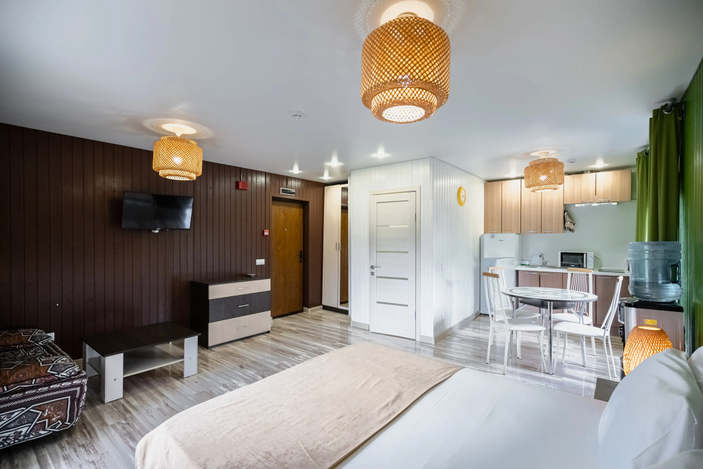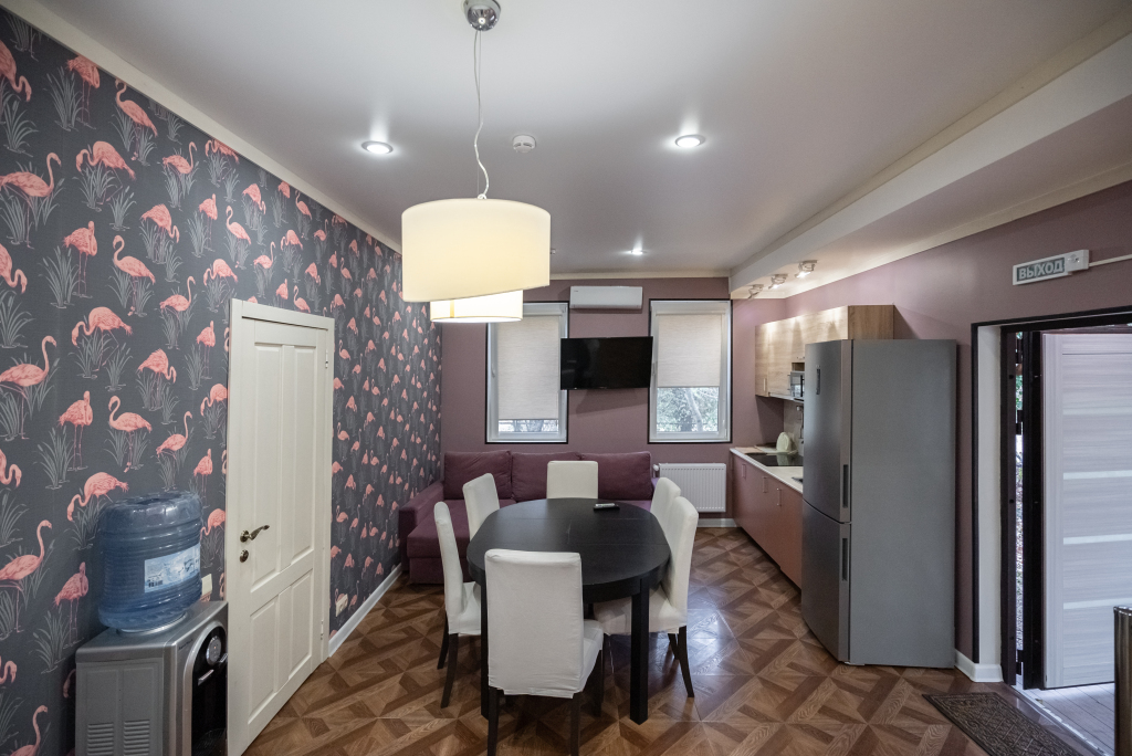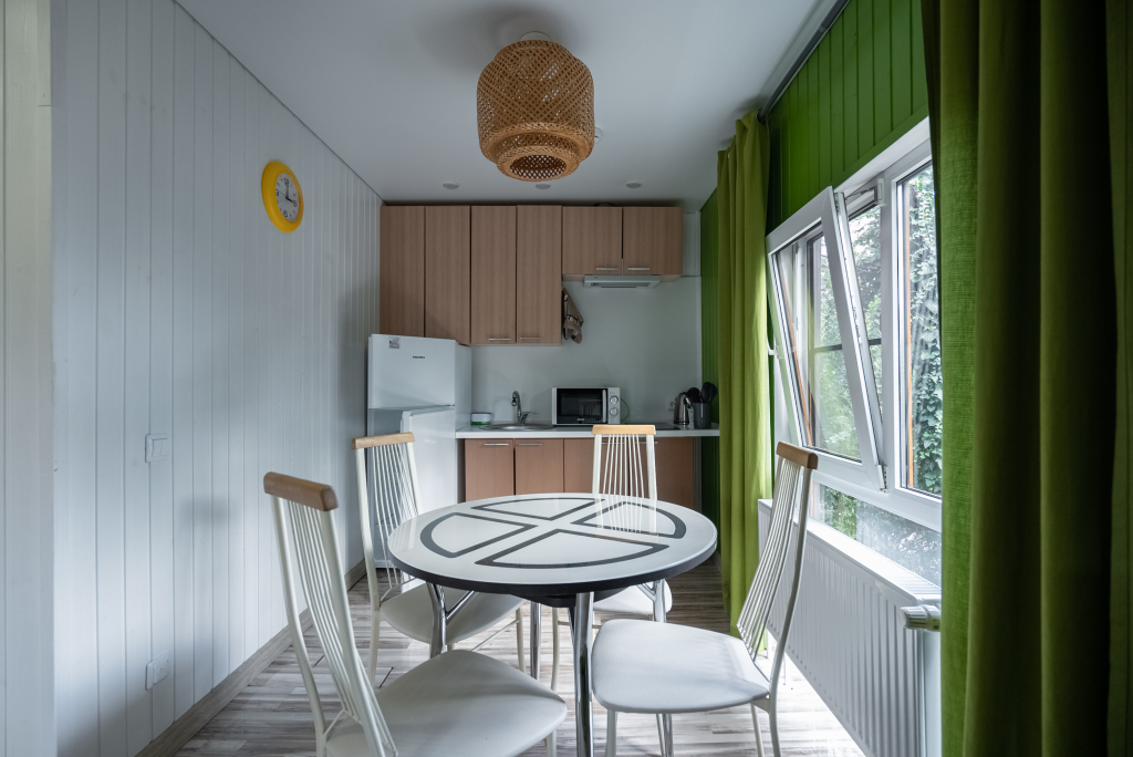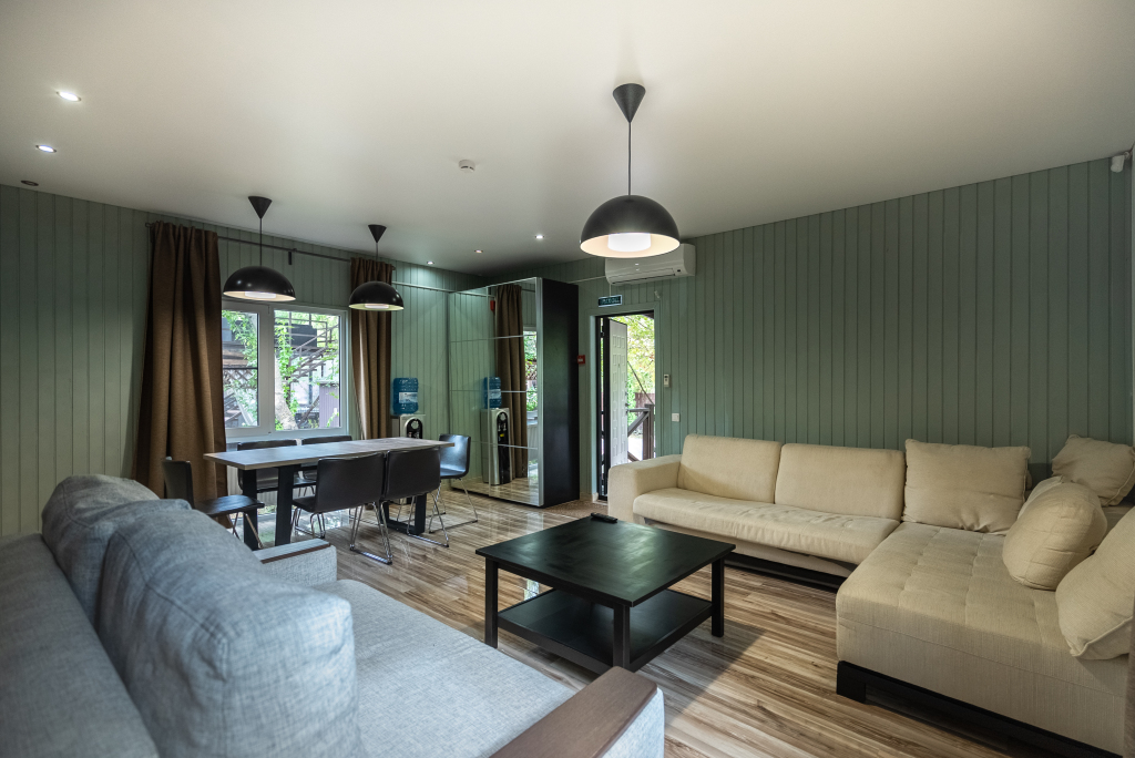 В категориях «Вилла», «Коттеджи» и «Апартаменты» есть кухня для самостоятельного приготовления пищи, обеденная зона, кулер.