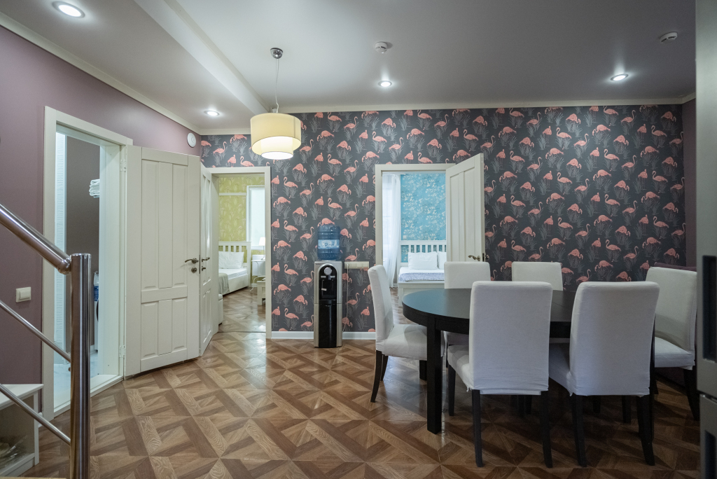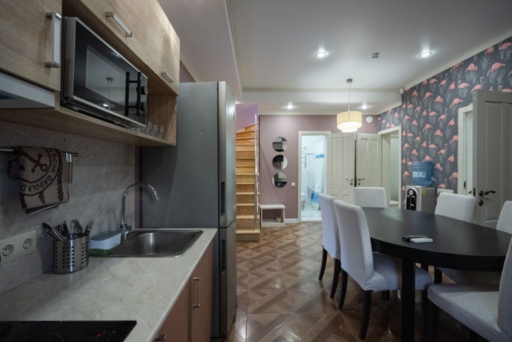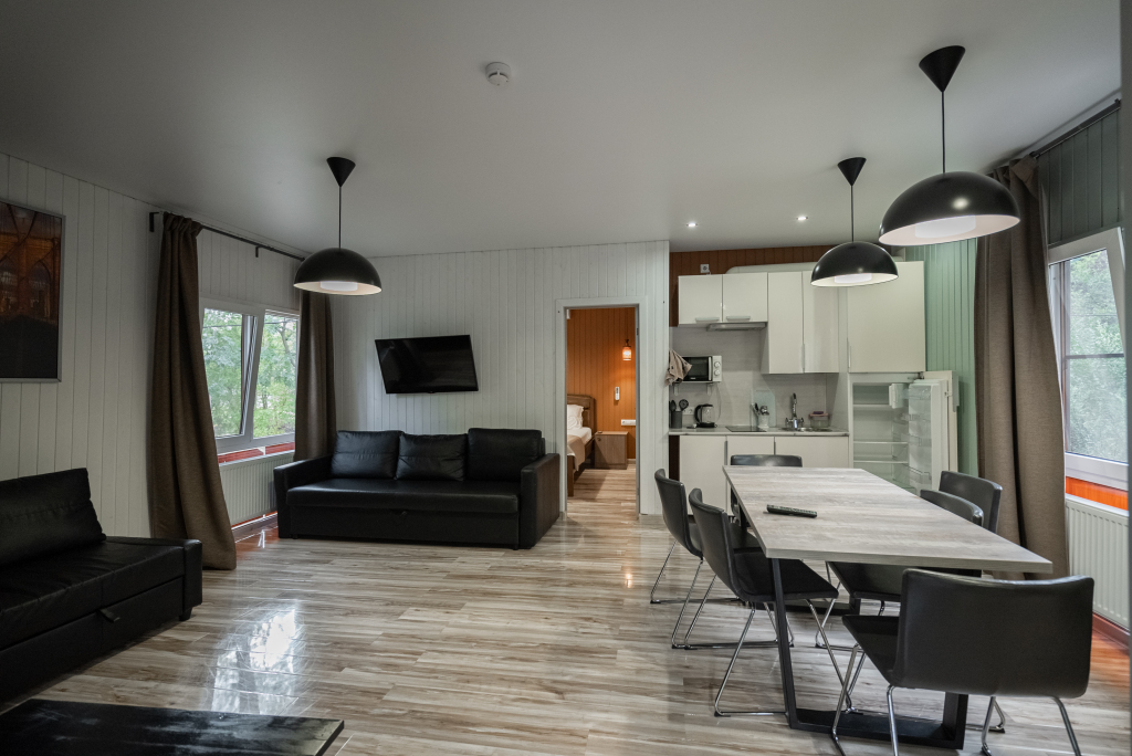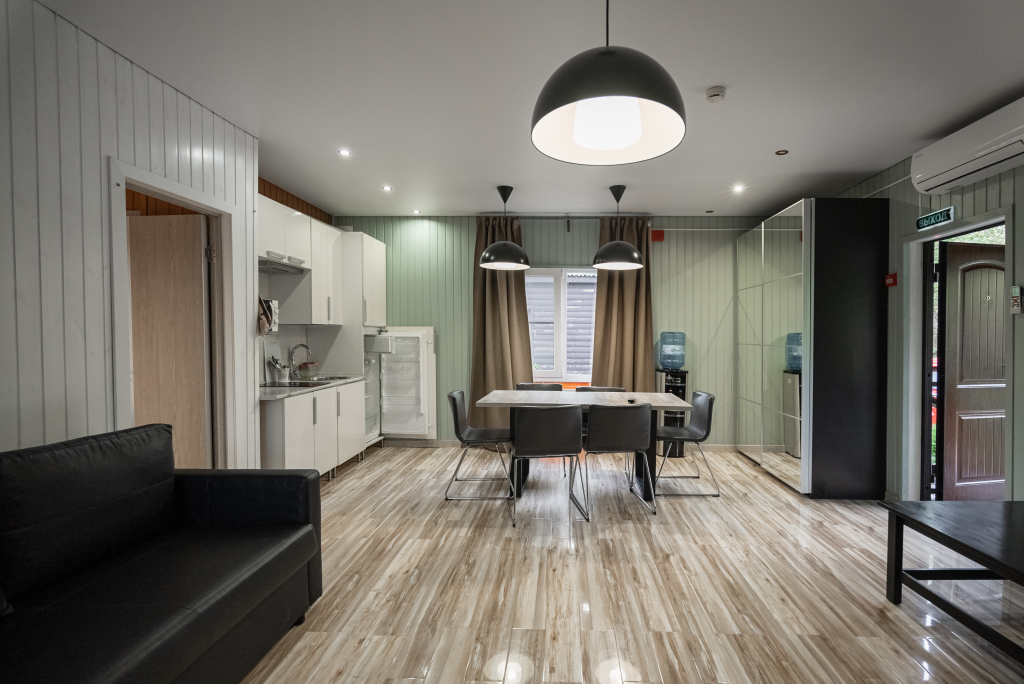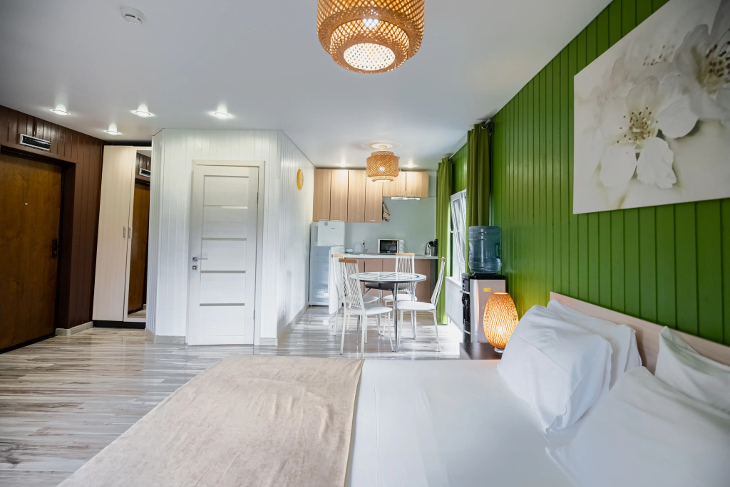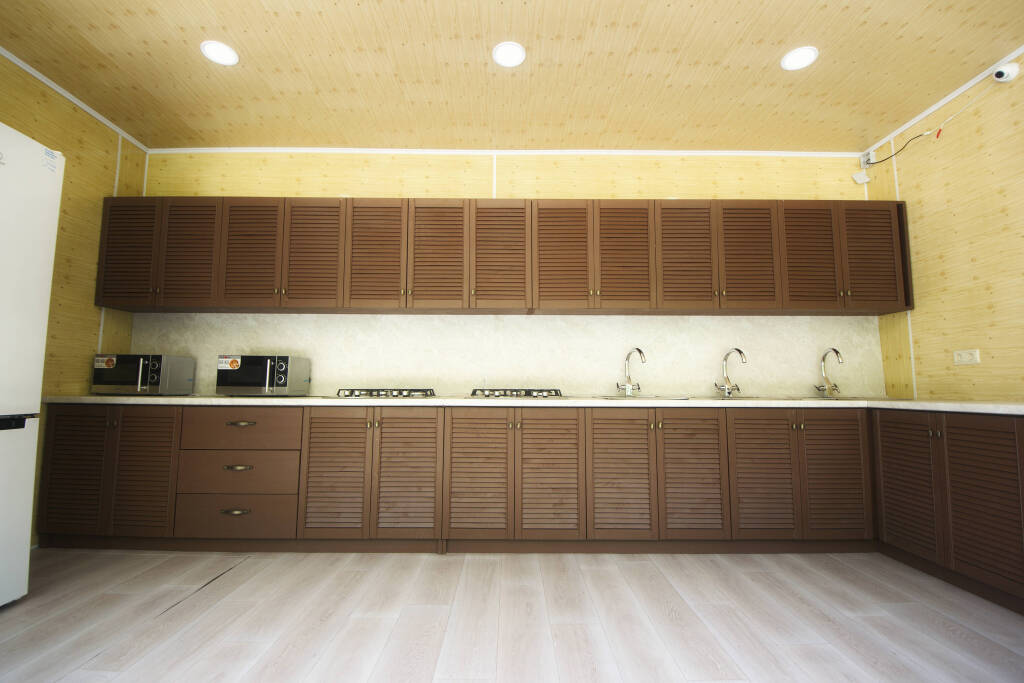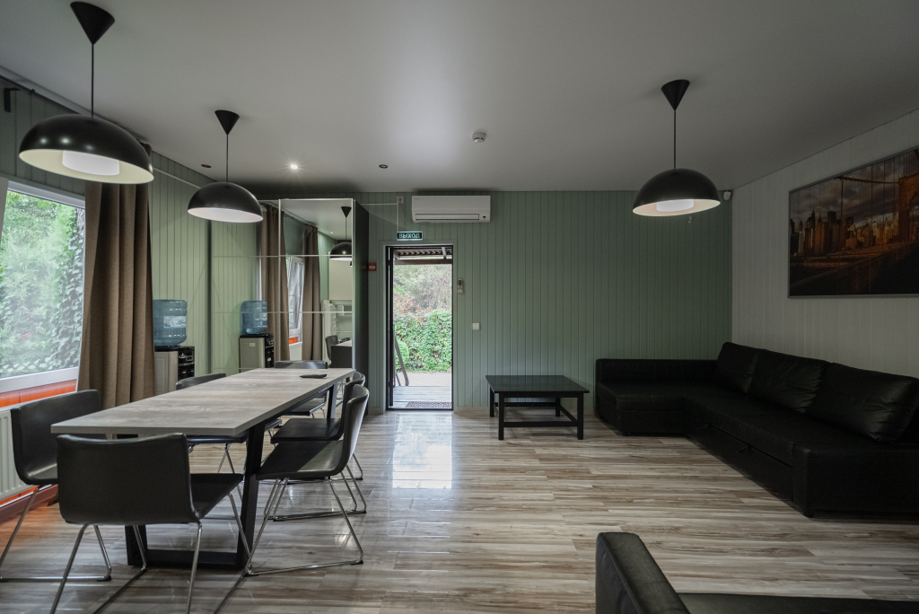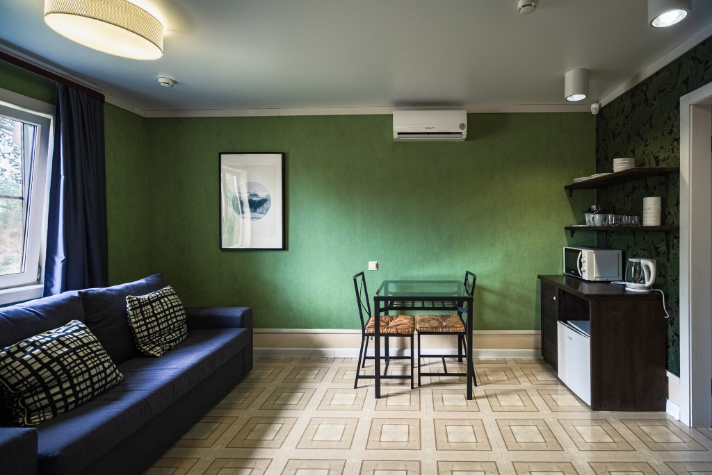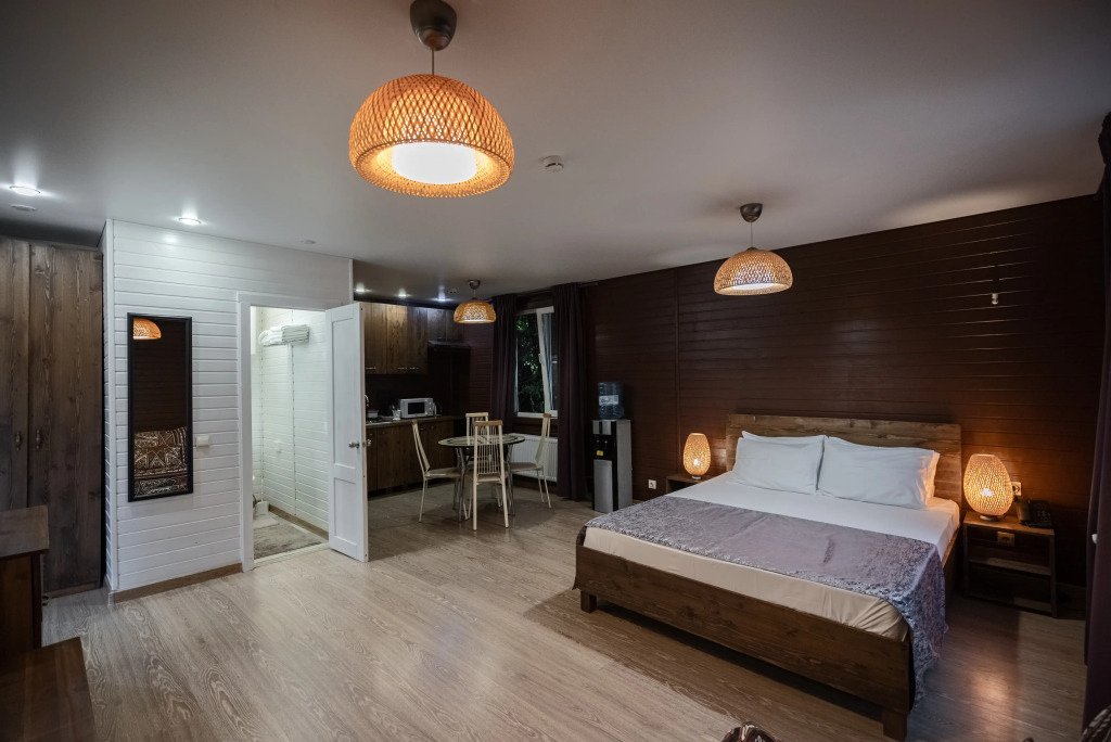 В категориях «Вилла», «Коттеджи» и «Апартаменты» есть кухня для самостоятельного приготовления пищи, обеденная зона, кулер.