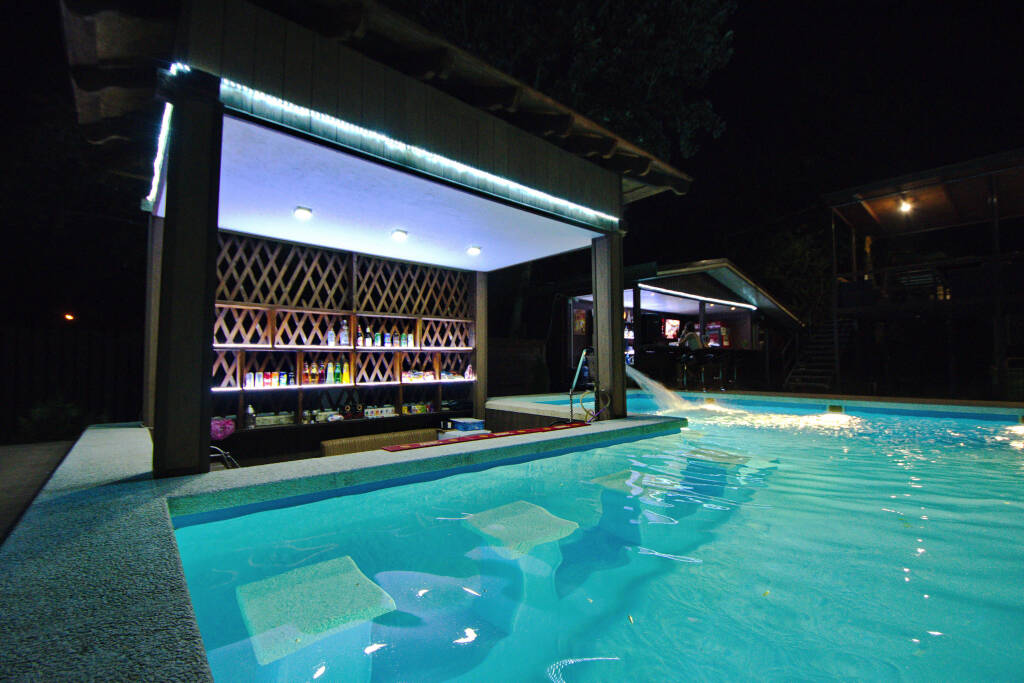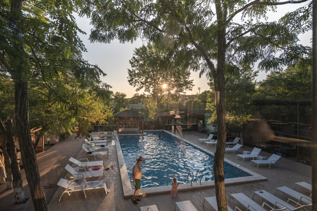 В зоне открытого бассейна находится кафе-бар, работающее круглый год. К услугам гостей блюда по меню, которое сформировано по отзывам и предпочтениям гостей. Все блюда готовятся при заказе. Также в отеле налажено собственное производство пиццы и роллов от шеф-поваров. Доставка этих блюд возможна прямо в номер.