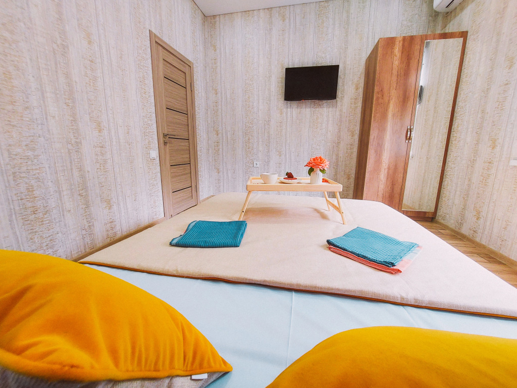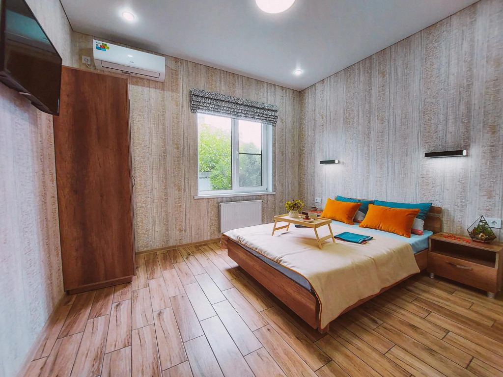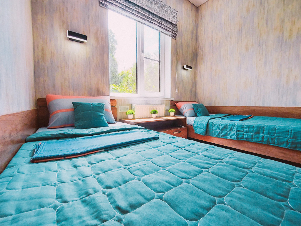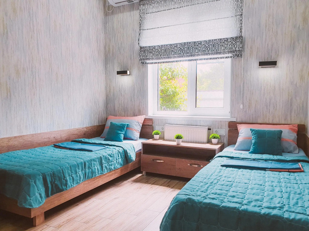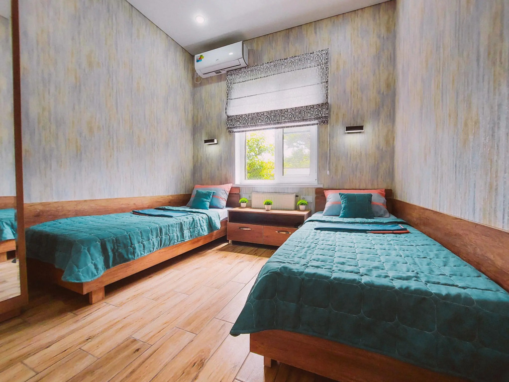В распоряжении гостей: две отдельные изолированные комнаты, кухня-гостиная, санузел. Установлены двуспальная кровать, две односпальные кровати, а также диван. Сплит-система с функцией озонирования воздуха есть в каждой спальной комнате.