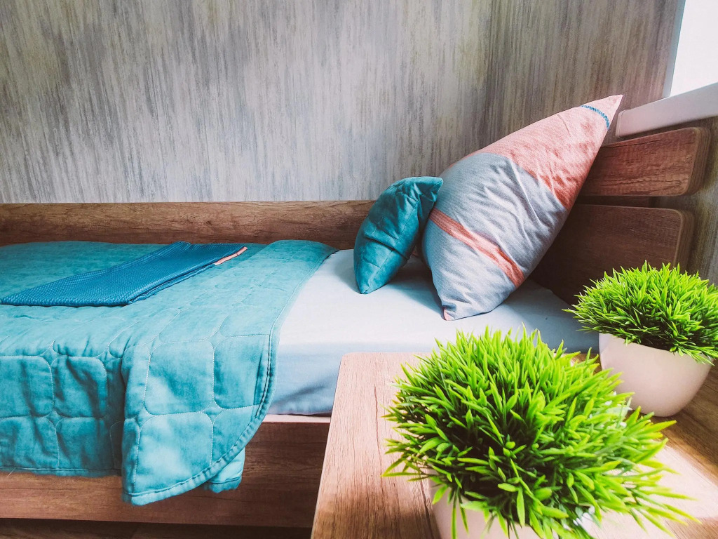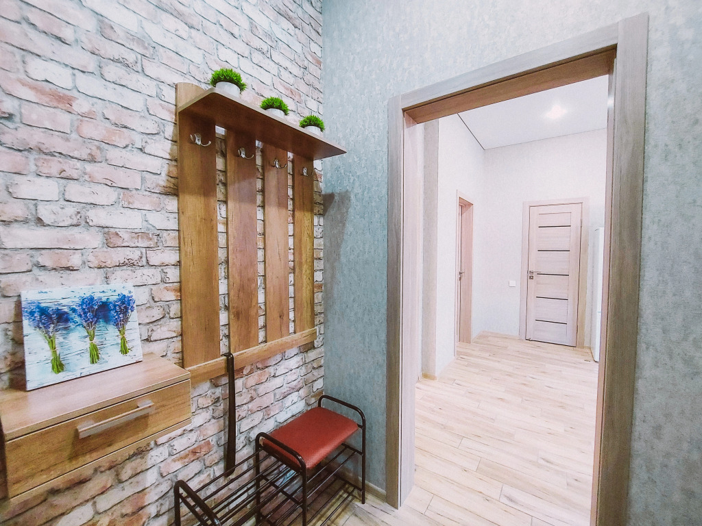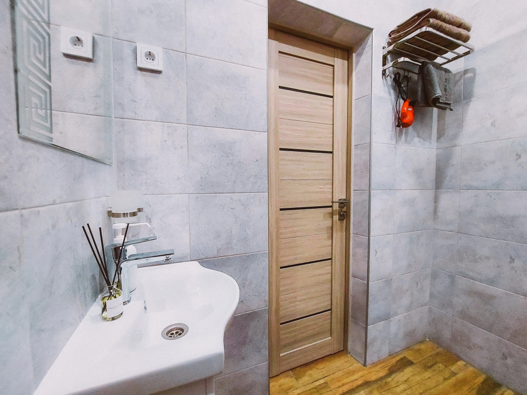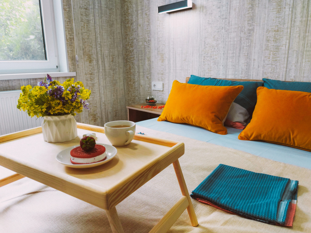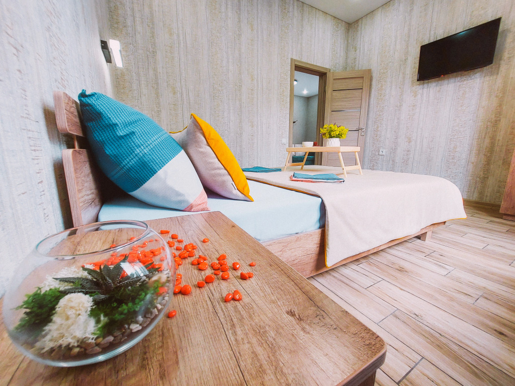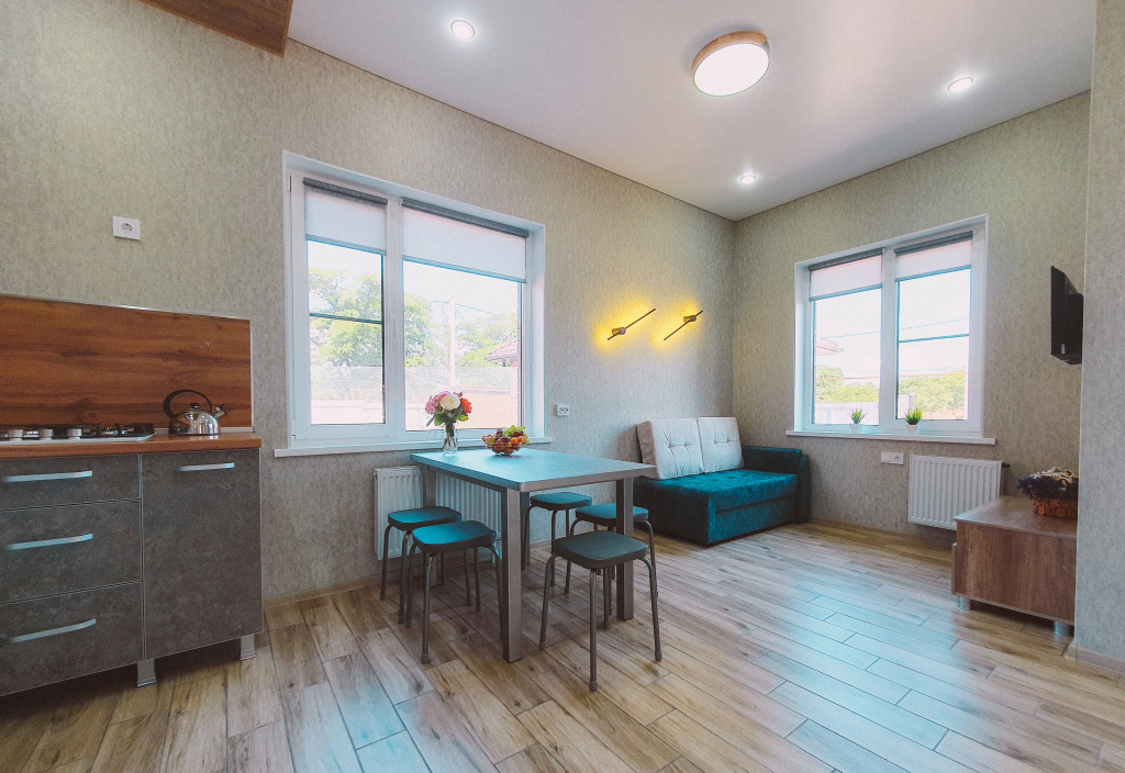 В распоряжении гостей: две отдельные изолированные комнаты, кухня-гостиная, санузел. Установлены двуспальная кровать, две односпальные кровати, а также диван. Сплит-система с функцией озонирования воздуха есть в каждой спальной комнате.
