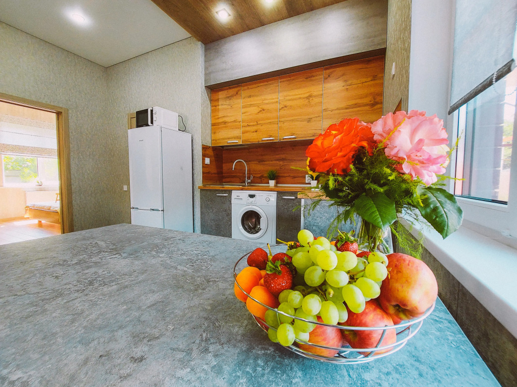 На кухне: варочная поверхность, холодильник, микроволновая печь, чайник, посуда, кухонная утварь. В ванной комнате: стиральная машина, фен, утюг с гладильной доской и сушилкой. Гостям предоставляются полотенца и постельное бельё по количеству основных спальных мест.