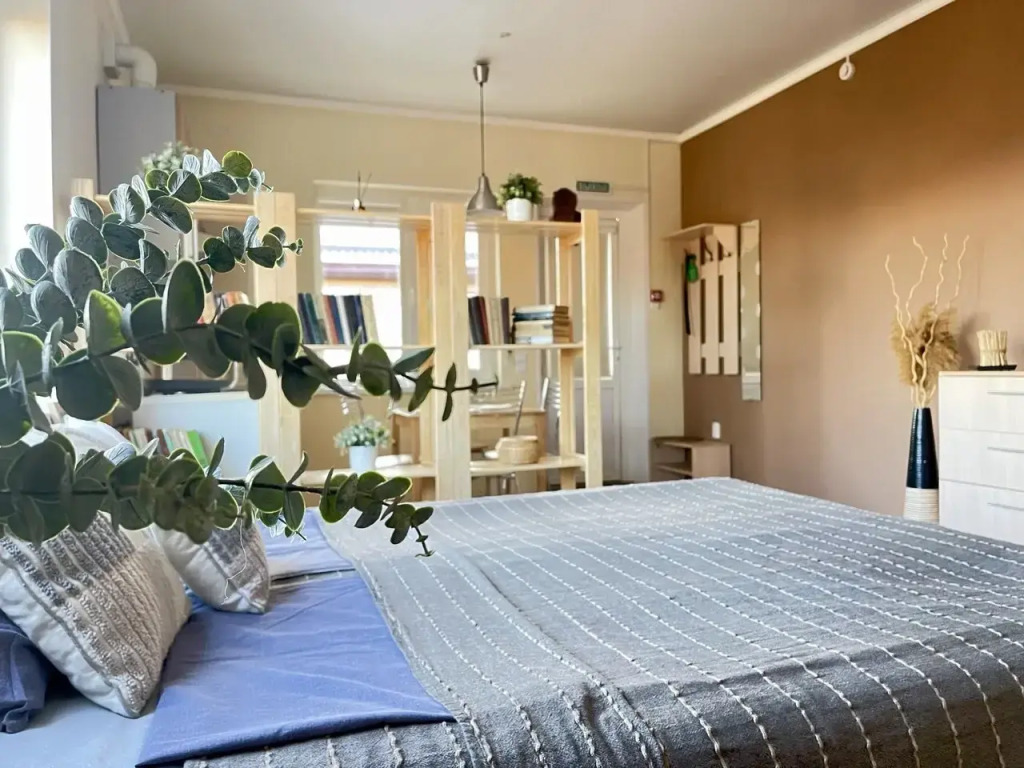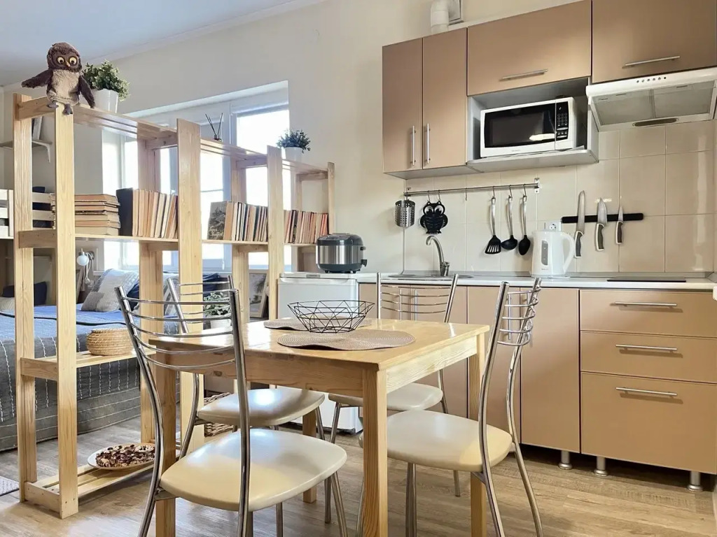 В комнате есть кухня с микроволновой печью, индукционной плитой, мультиваркой, холодильником, электрическим чайником, фильтром для воды и необходимой посудой. В наличии текстиль и комплект постельного белья, предоставляется набор полотенец. Санузел оборудован душевой кабиной, стиральной машиной, феном, имеется стиральный порошок. Доступны гладильные принадлежности, установлена сплит-система, телевизор и высокоскоростной Wi-Fi. На террасе размещена садовая мебель со столом и стульями.
