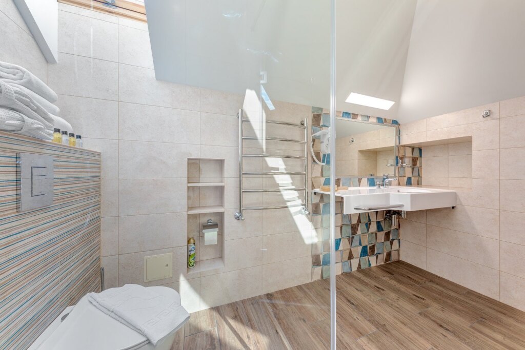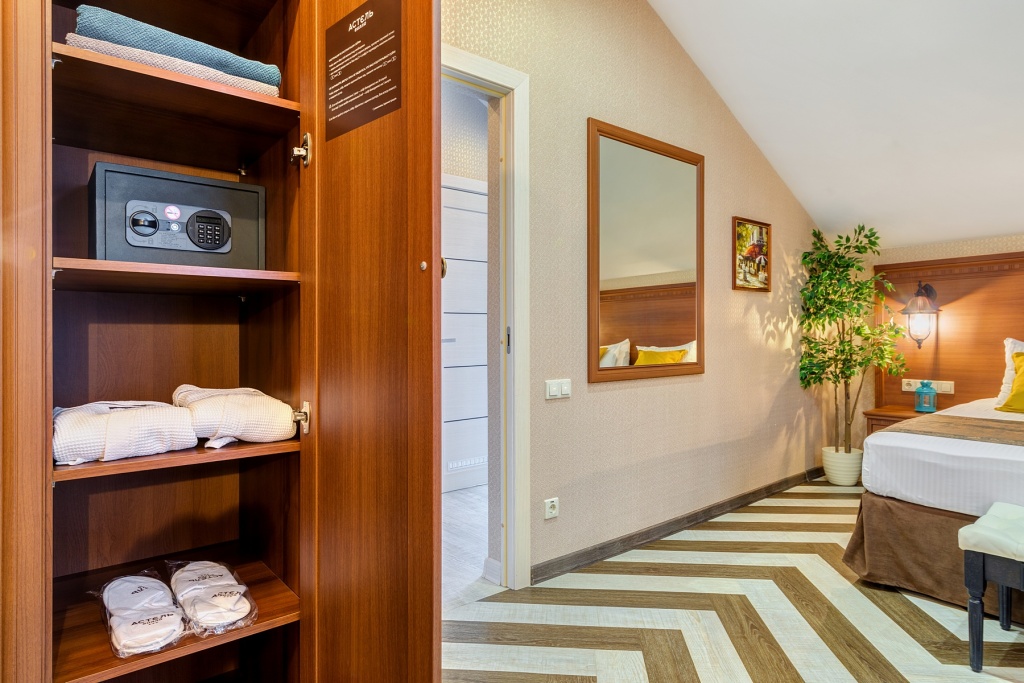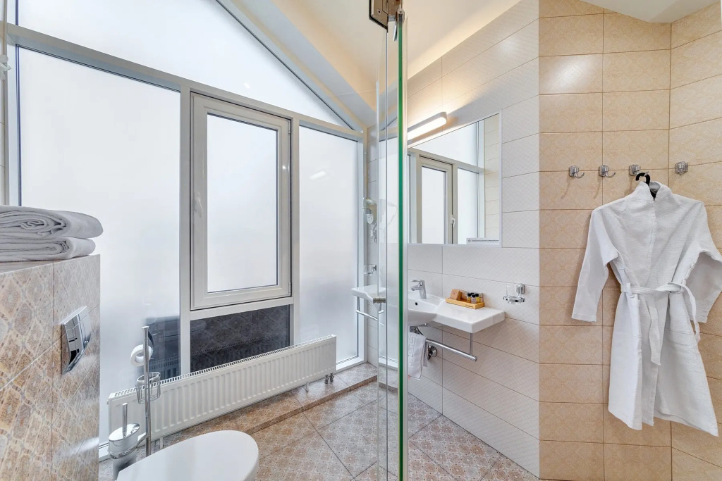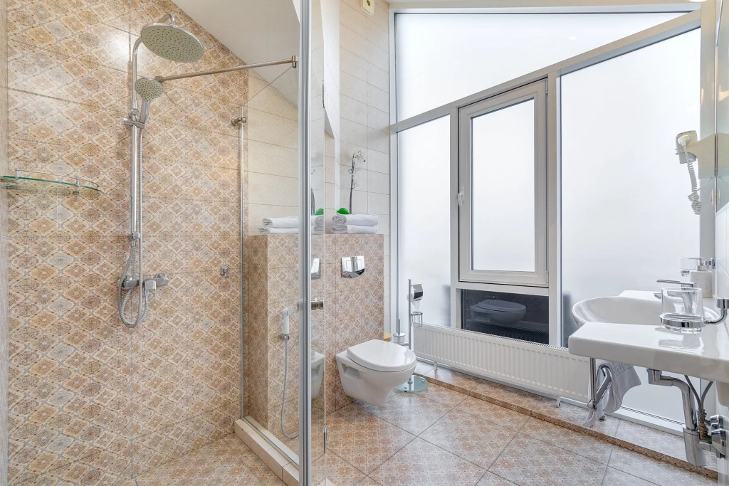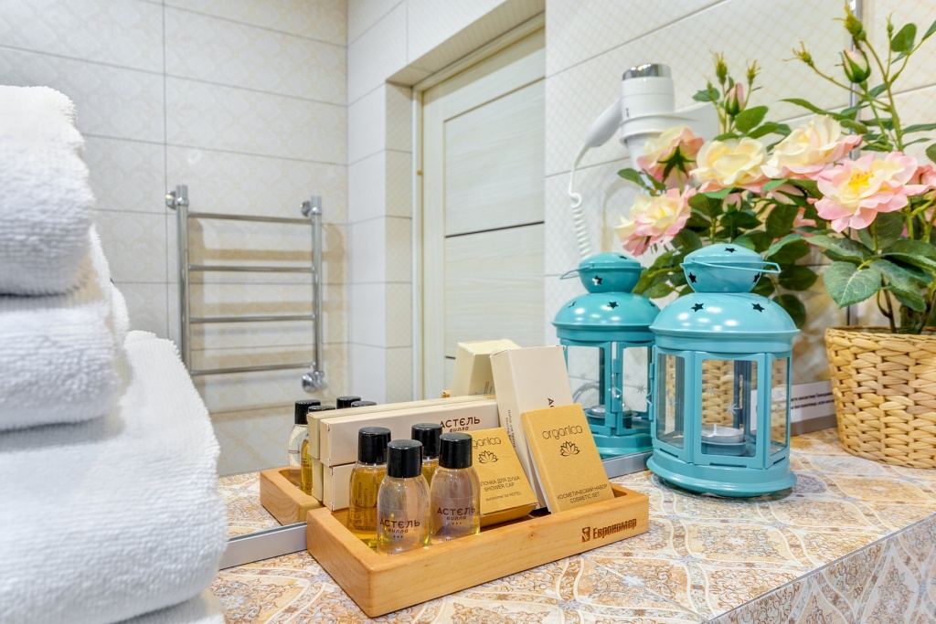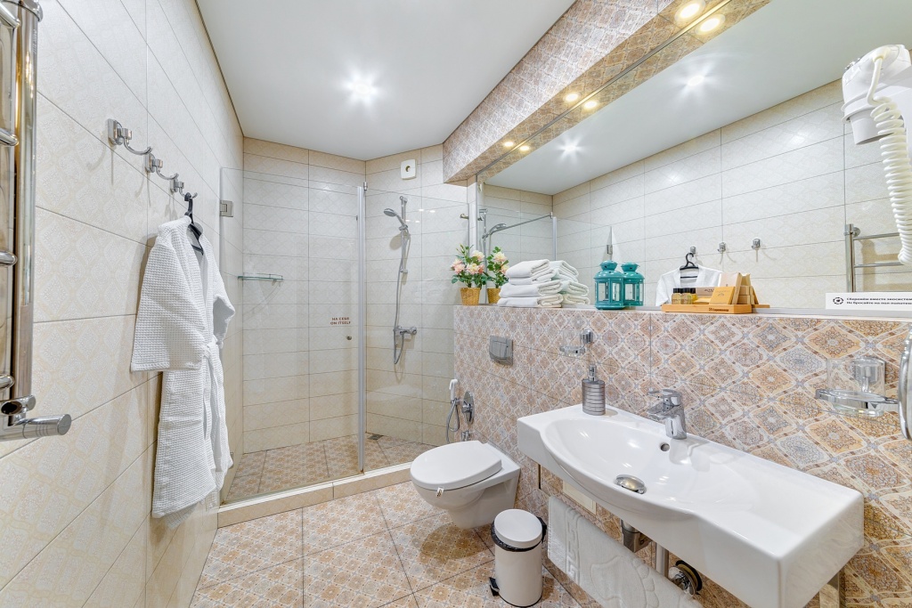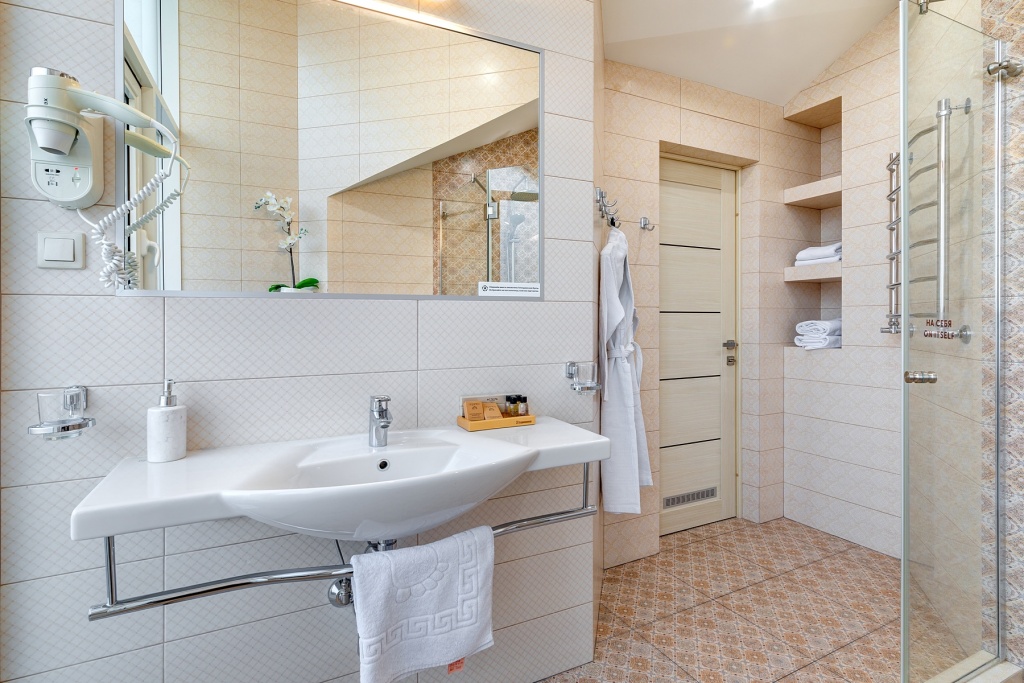 Подогреваемые полы и полотенцесушители имеются в каждой ванной комнате номеров. Есть звукоизоляция стен и ковровое покрытие.