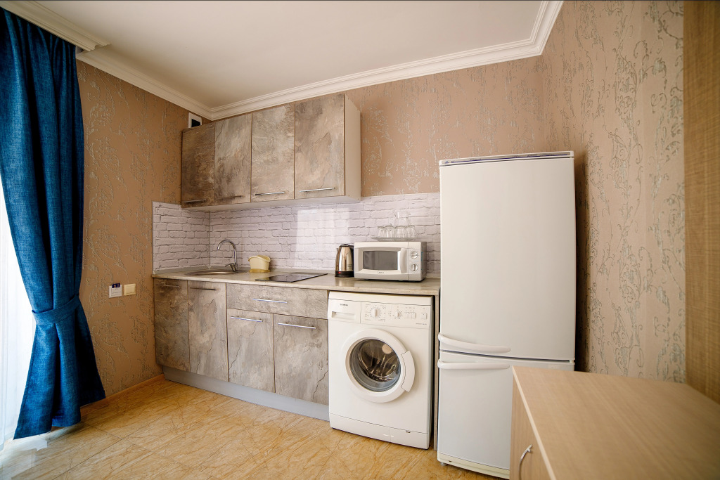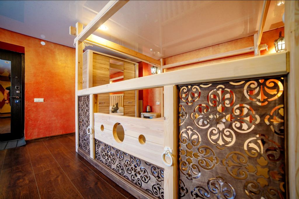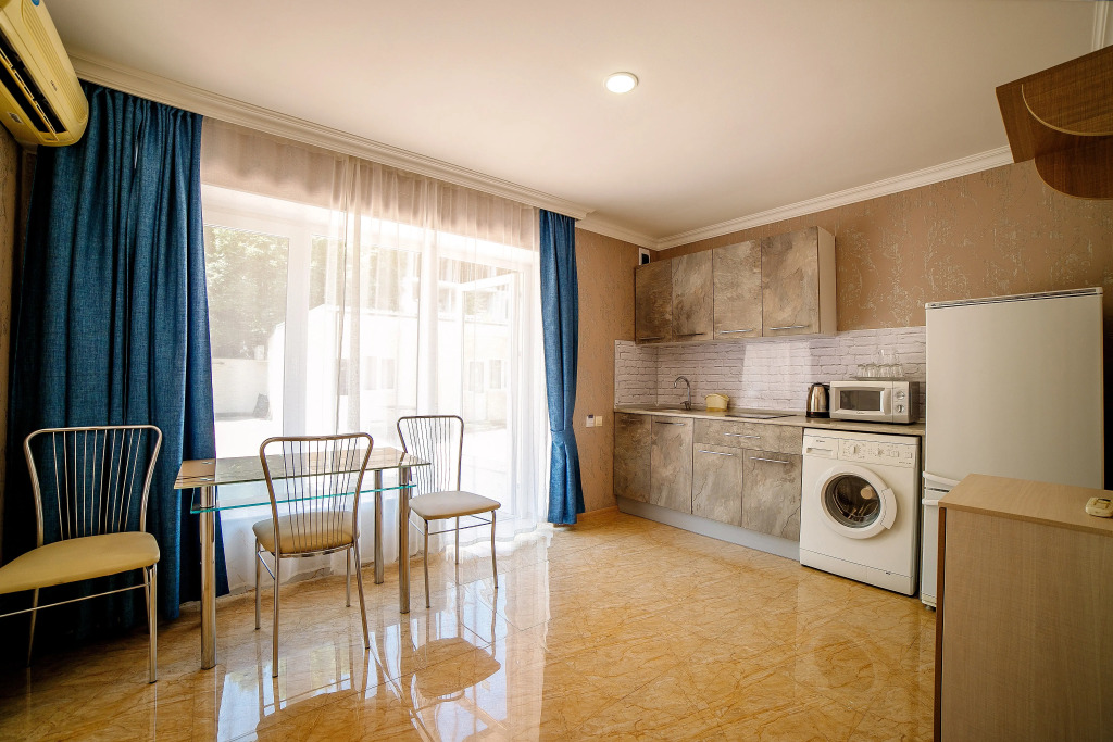 Разрешено проживание с собаками до 6 кг в номерах следующих категорий: «Стандарт четрёхместный с террасой», «Стандарт двухкомнатный с террасой», «Апартаменты с кухней и террасой», «Семейная студия с кухней и террасой», «Апартаменты двухкомнатные с кухней и террасой», «Апартаменты пятиместные с террасой».