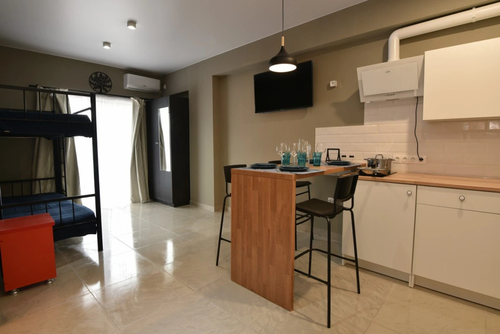 Расположены апартаменты на центральной асфальтированной улице. До моря 3 минуты пешком. Были в конце сентября 2022. Все частенько, уютно. Новый ремонт в современном стиле. На кухне достаточное количество посуды, кастрюли, приборы. Рядом столовые, кафе