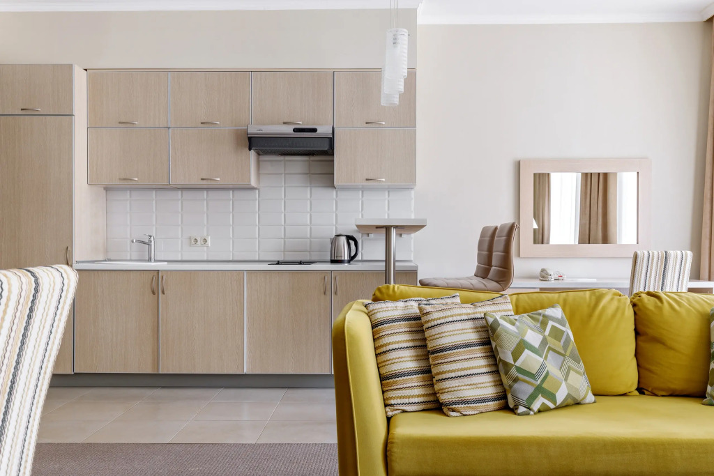 В октябре людей не много, поэтому нам дали свободный большой номер, чистый и очень уютный, удобная кровать, есть все необходимое для проживания, мыльные принадлежности, фен, посуда, плита, гладильная доска с утюгом и т.д.