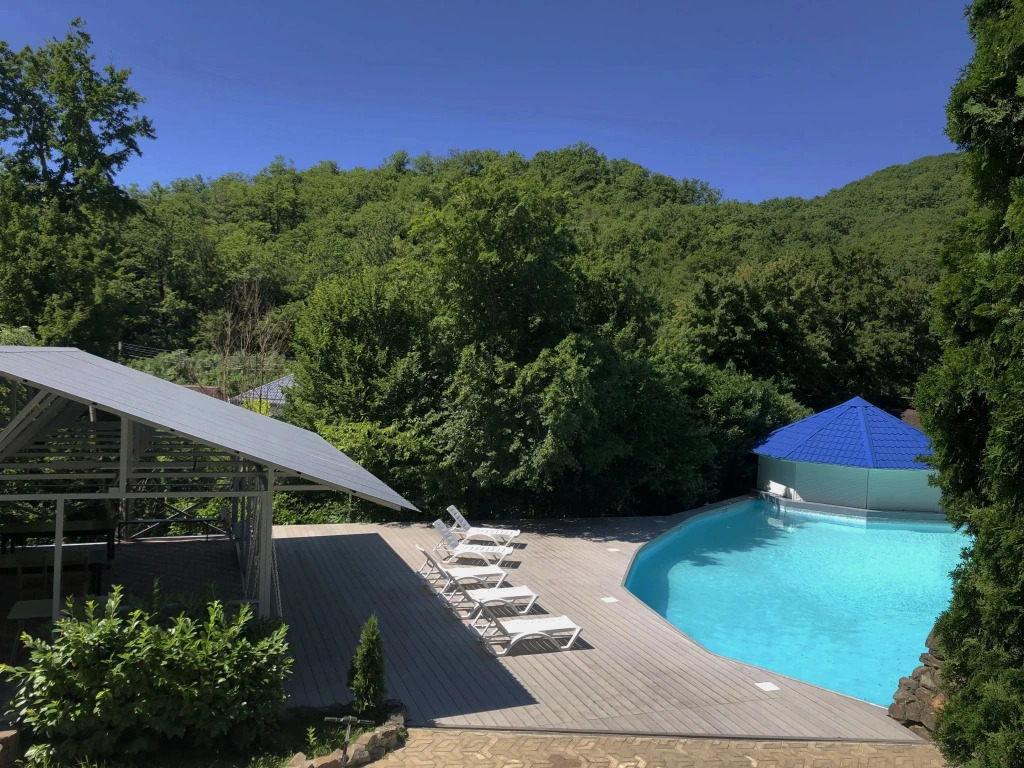Территория отеля составляет 4 га. На территории растут яблоневые, грушевые, персиковые, ореховые сады, сады хурмы и заросли лавра-вишни. Есть пруд, где можно ловить рыбу. На территории также располагается банный комплекс из трёх отдельно стоящих русских бань (не входит в стоимость проживания), одна из которых двухэтажная с сеновалом.
