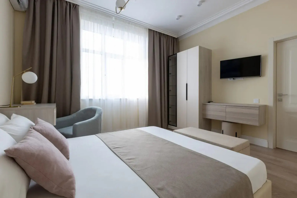 В номере гостей ждут телевизор и халат. Перечисленные услуги есть не во всех номерах.