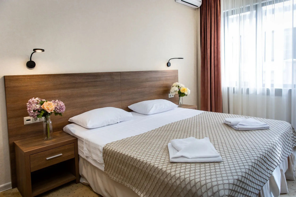 Отдыхали с семьёй с маленькой дочкой. Номер чистый. У нас был номер с балконом. только вид был на бетонную сырую стену , куда стекала вся вода от кондиционеров и прочего. останавливались на 1 ночь. огромный плюс пляж рядом. завтраки на твёрдую 3+(кипятка не было, пришлось довольствоваться компотом). не понравился фыркающего вида официант в ресторане при отеле